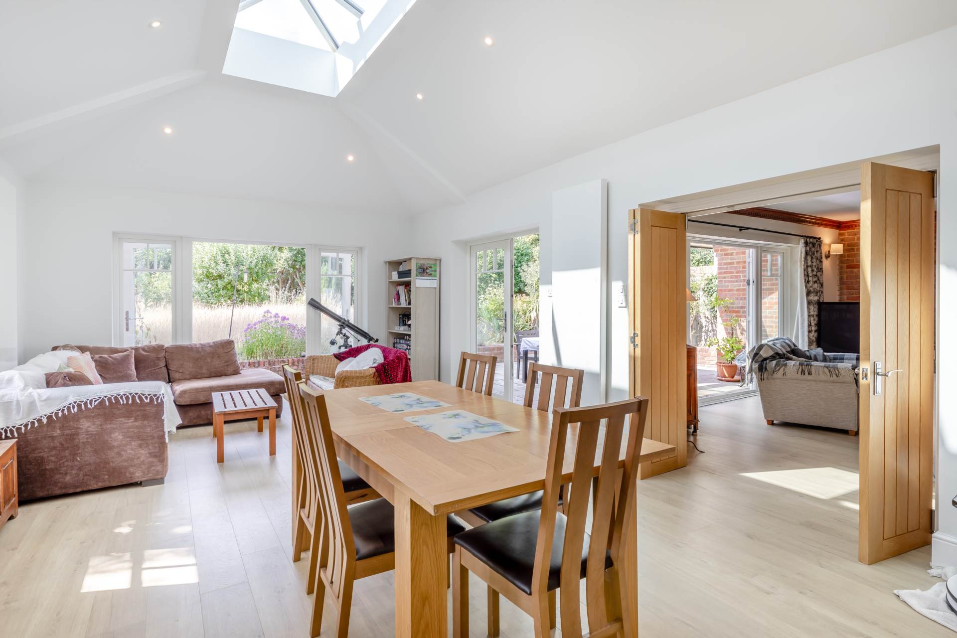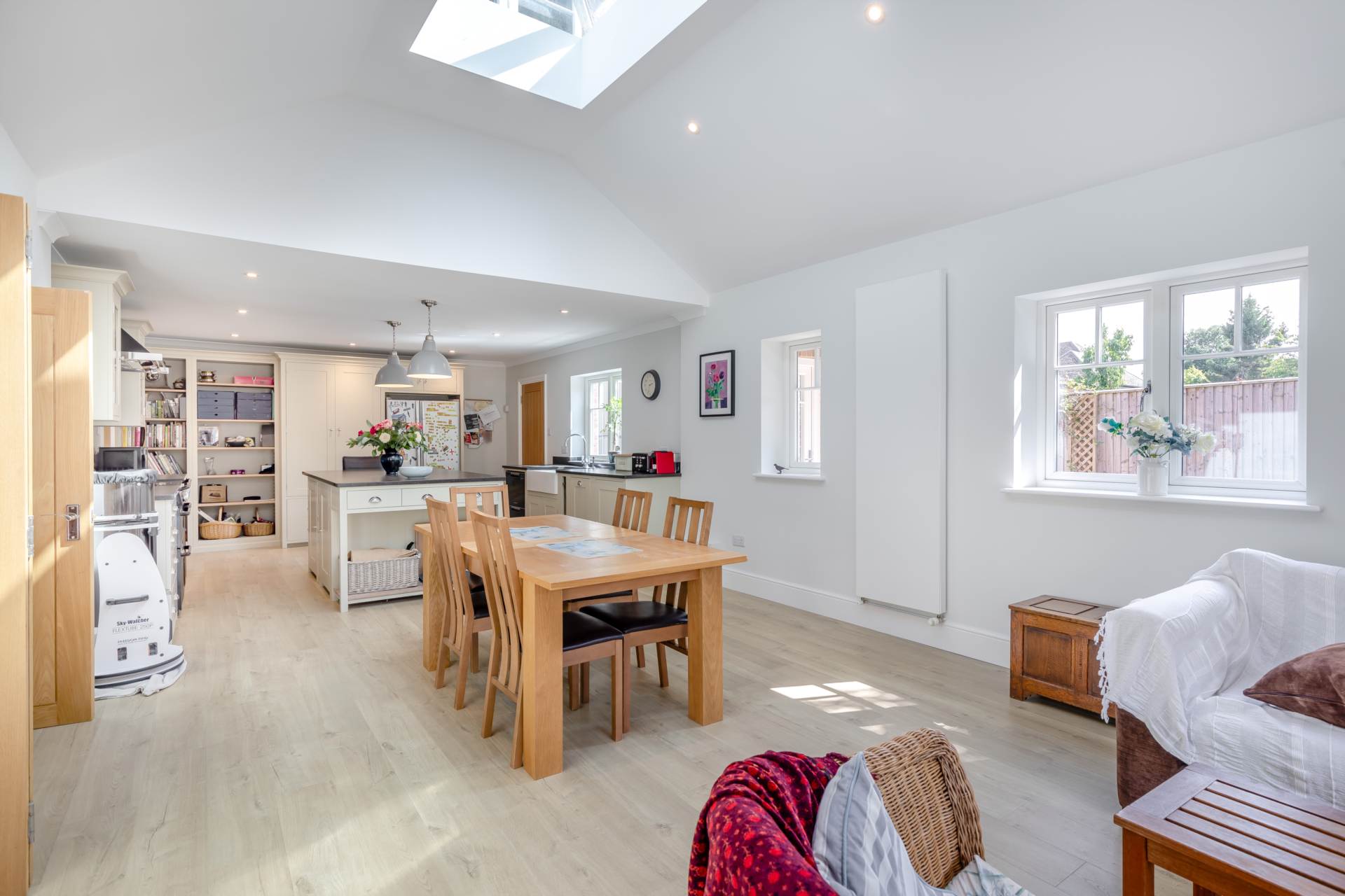 The heart of the house is our open-plan kitchen and dining space, created after a major extension in which we also converted the loft into two additional bedrooms and a bathroom. The kitchen-diner flows into the living room and out onto the veranda a lovely spot in which to enjoy the garden, come rain or shine. The easy indoor-outdoor flow of the house and garden gives us the flexibility for everyday life and entertaining alike. Family gatherings naturally spill outside, and we have enjoyed countless relaxing evenings out here, too.