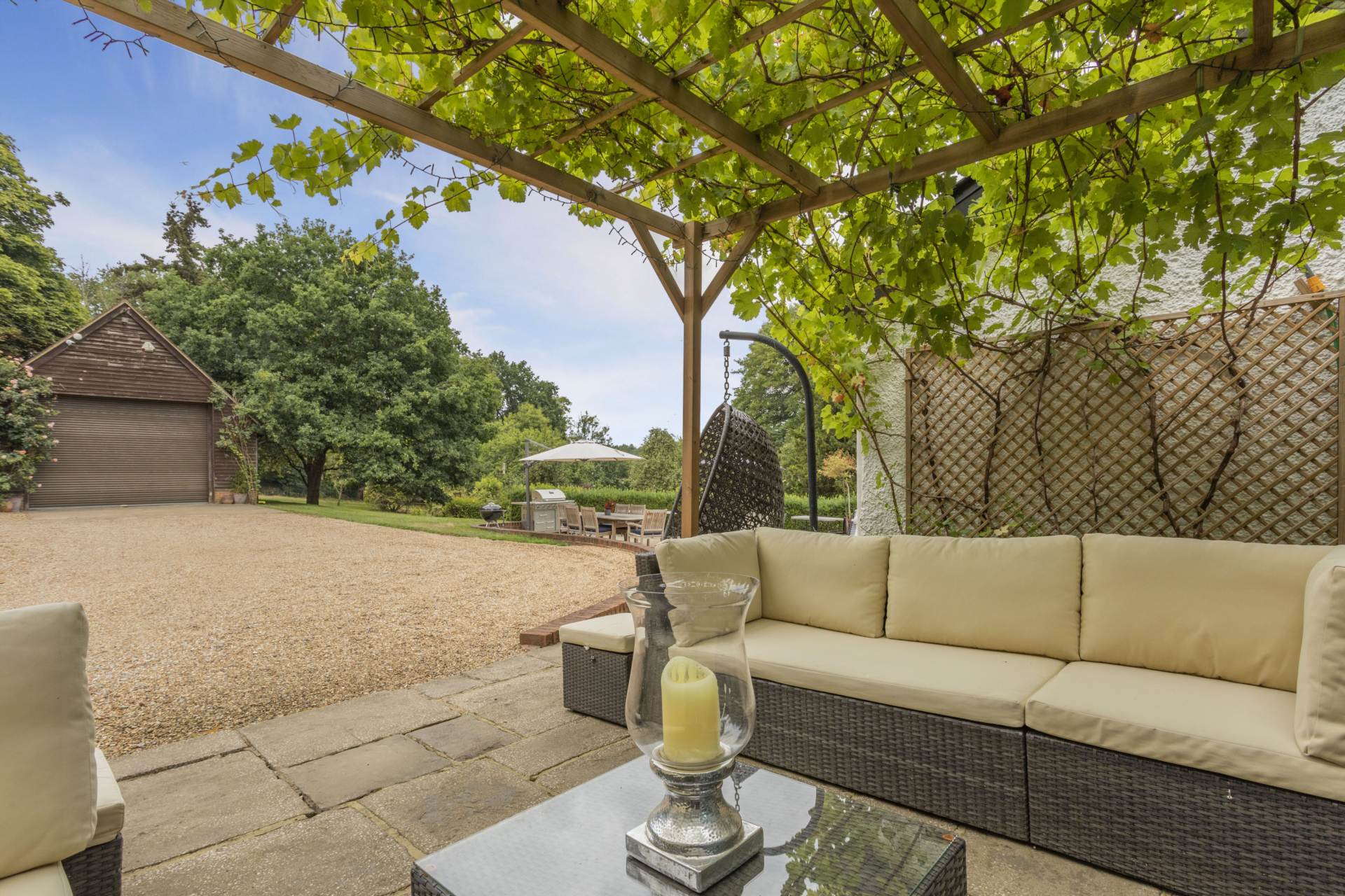 A pair of electric gates open to a sweeping gravel driveway with a central turning circle, framed by box hedging, manicured lawns, and mature trees. To the rear, expansive stone terraces offer idyllic spaces for outdoor entertaining, bordered by yew and sweet chestnut trees that ensure privacy and year-round beauty.