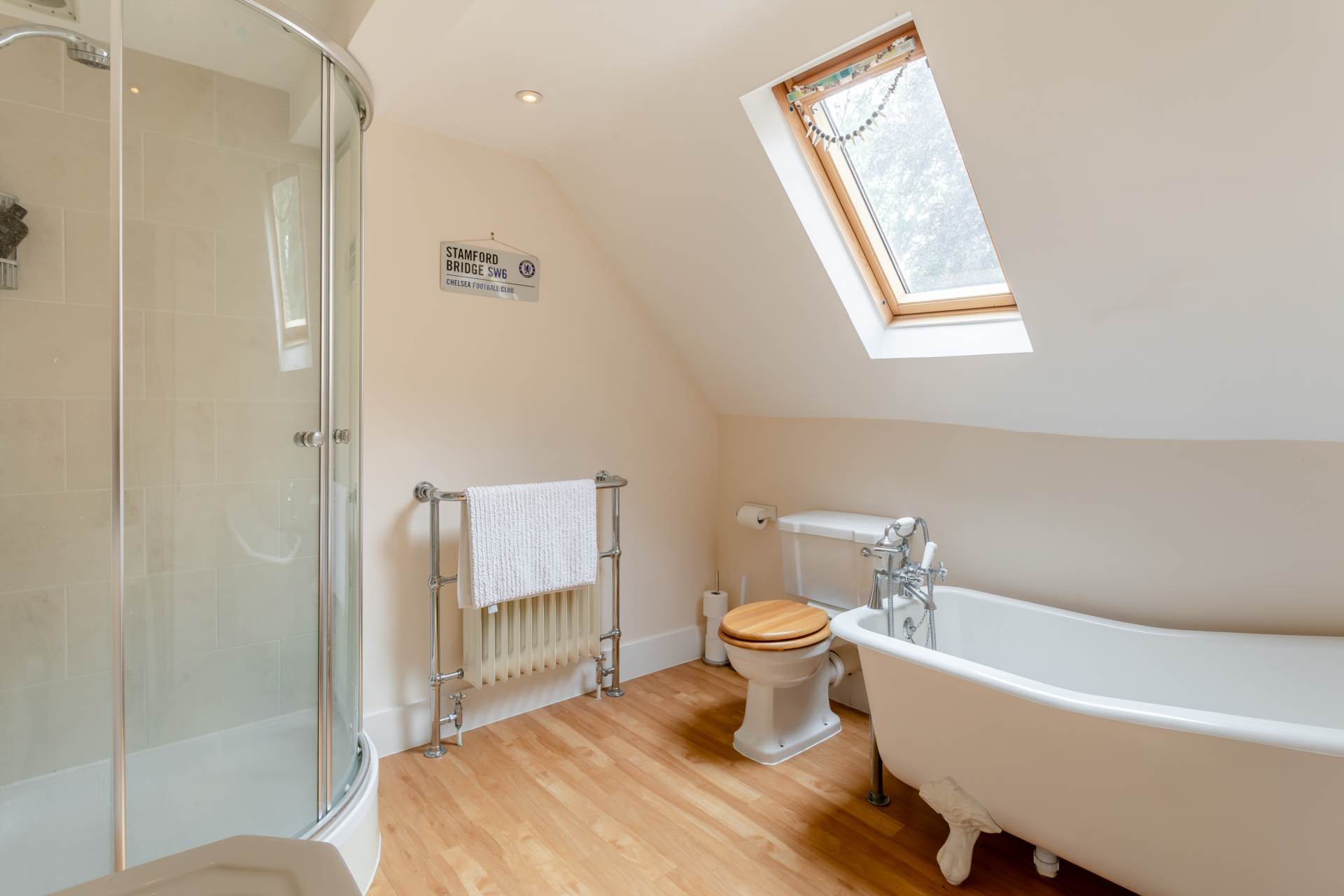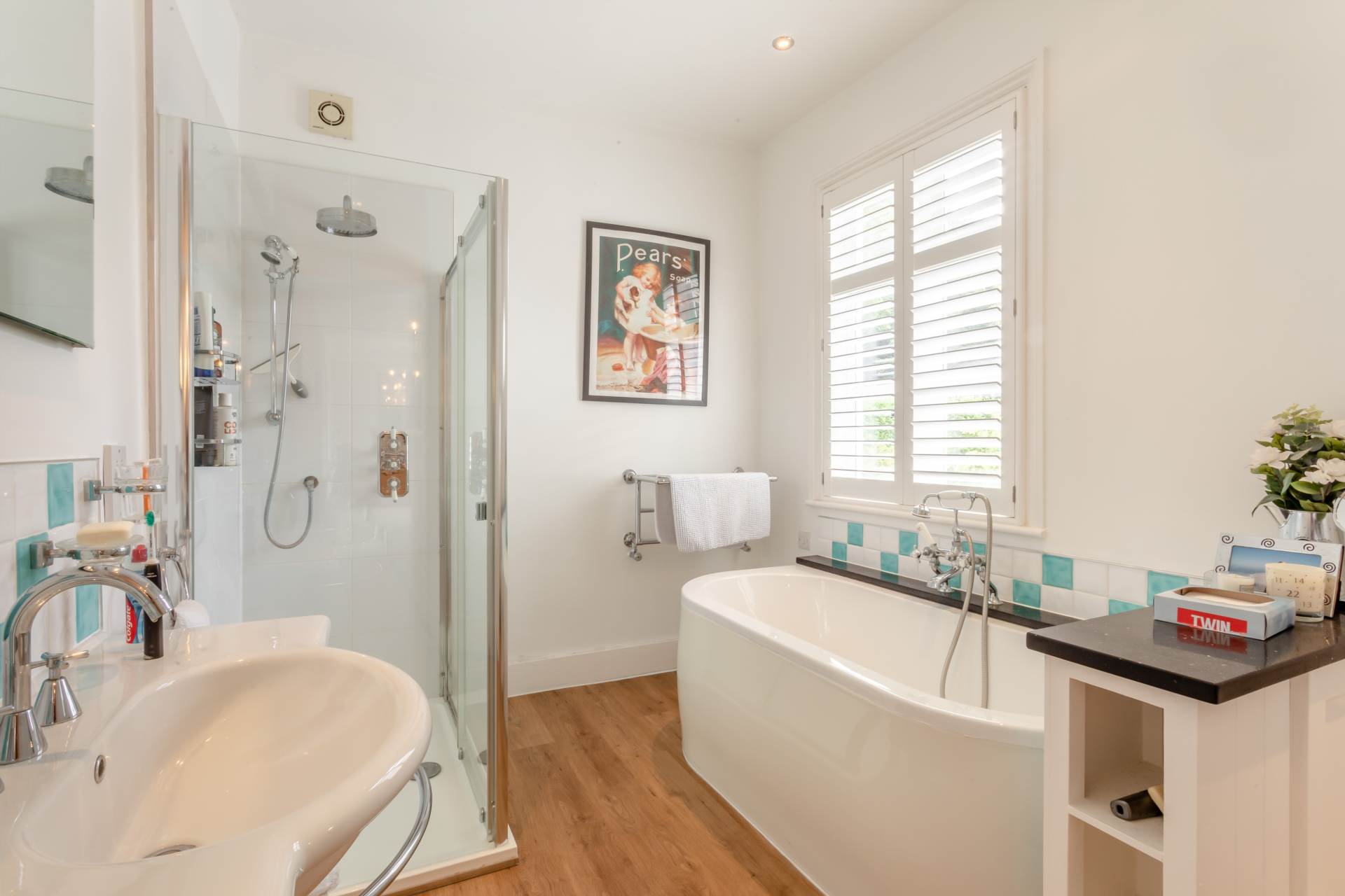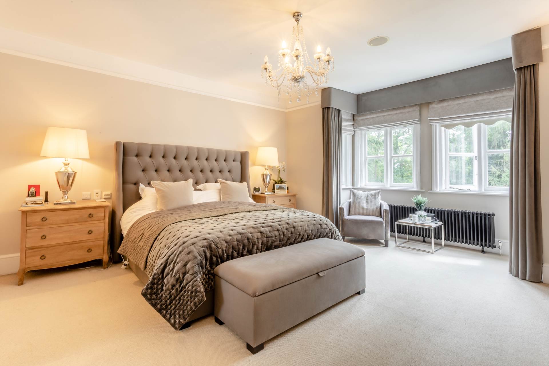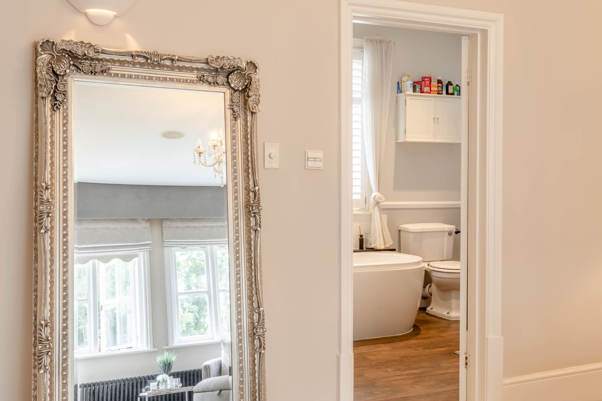 The principal suite is a private haven, offering a generous bedroom with bay window, decorative fireplace, and an adjoining dressing room. The luxurious en-suite bathroom includes a freestanding bath, large walk-in shower, WC, and washbasin. Three further spacious bedrooms on the first floor two with fireplaces and bay windows share a beautifully appointed family bathroom.