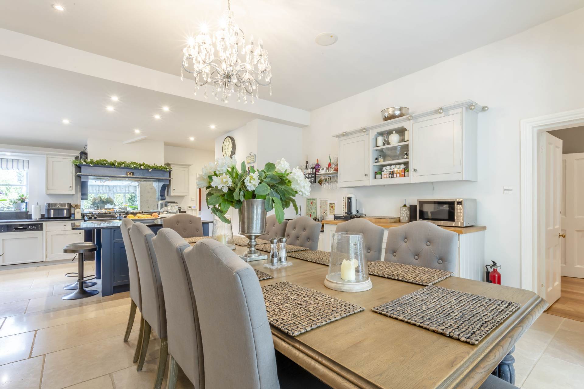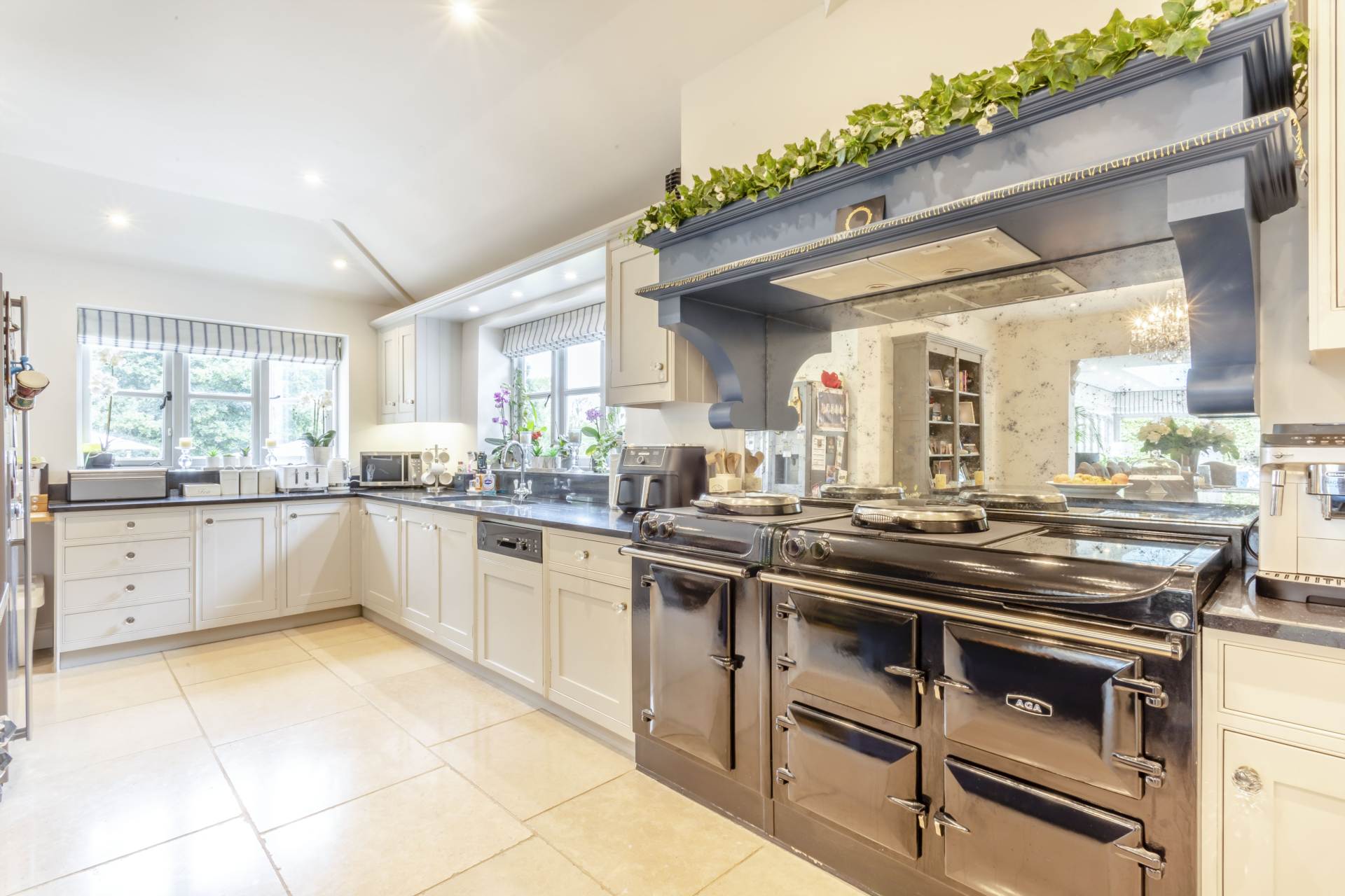 At the heart of the home lies a stunning kitchen/breakfast room ideal for everyday living and entertaining. This extended space features granite worktops, a central island, an electric Aga, and a walk-in larder. French doors open directly onto the rear terrace, seamlessly blending indoor and outdoor living. A mezzanine home office overlooks the kitchen, while steps lead down to a well-equipped utility room and boiler room.