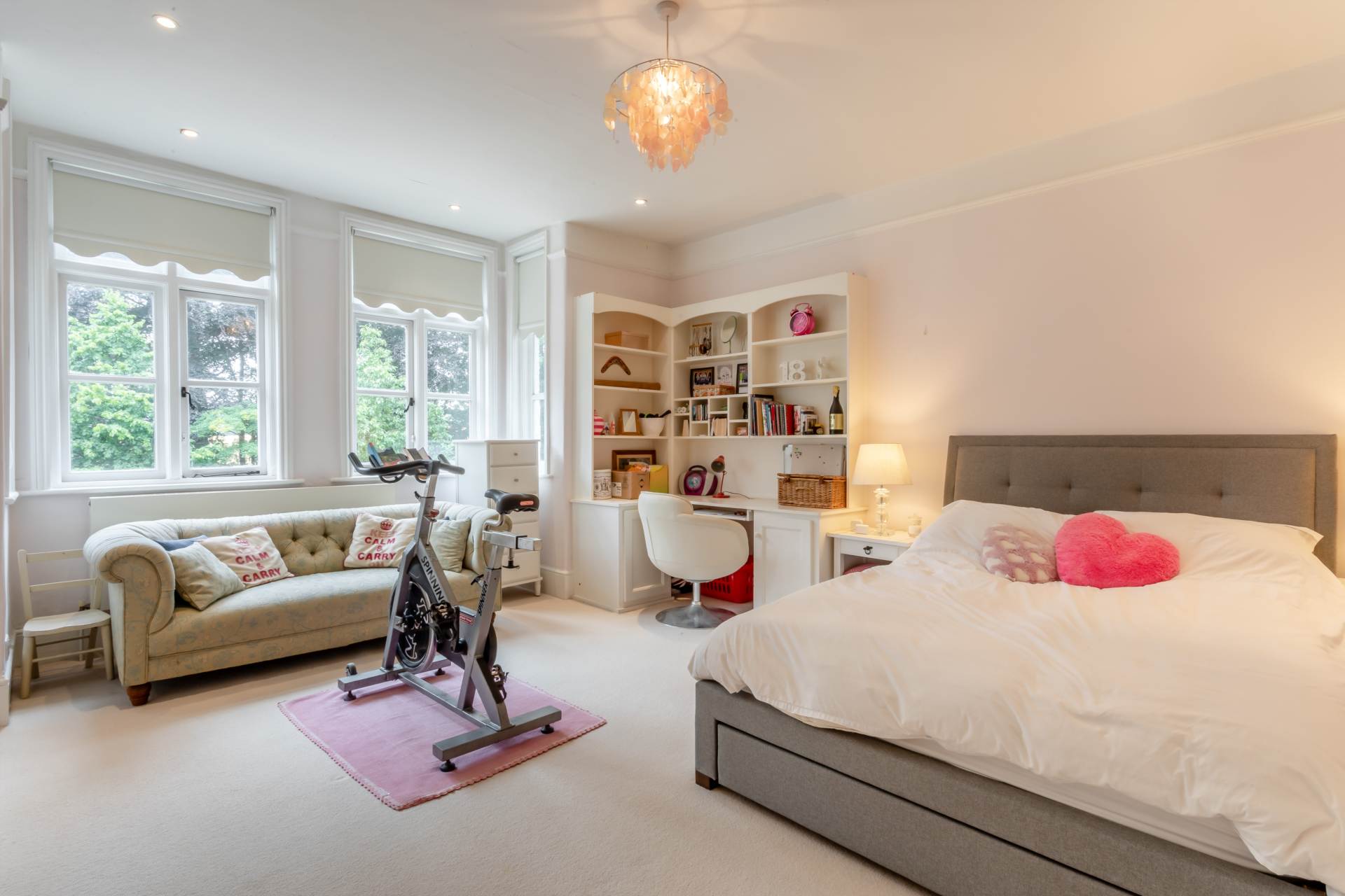 The second floor offers flexible accommodation, including a bedroom, a sitting room, a shower room, and ample storage space. A separate suite comprises another bedroom and bathroom, while the seventh bedroom makes an ideal guest room or home office with views across the garden.