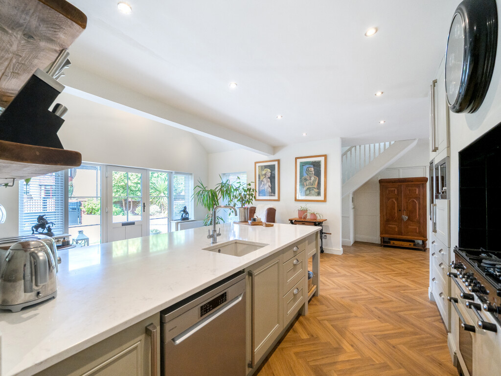 As you enter the property, you’re welcomed into a spacious open-plan kitchen, dining, and living space that forms the heart of the home. The kitchen is beautifully appointed with contemporary cabinetry, high-quality appliances, and generous worktop space, making it perfect for everyday family life and entertaining. This area flows effortlessly into a dining space and informal living zone, providing a light-filled and sociable environment for family gatherings and meals.