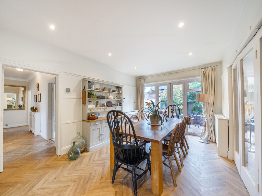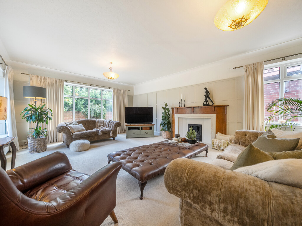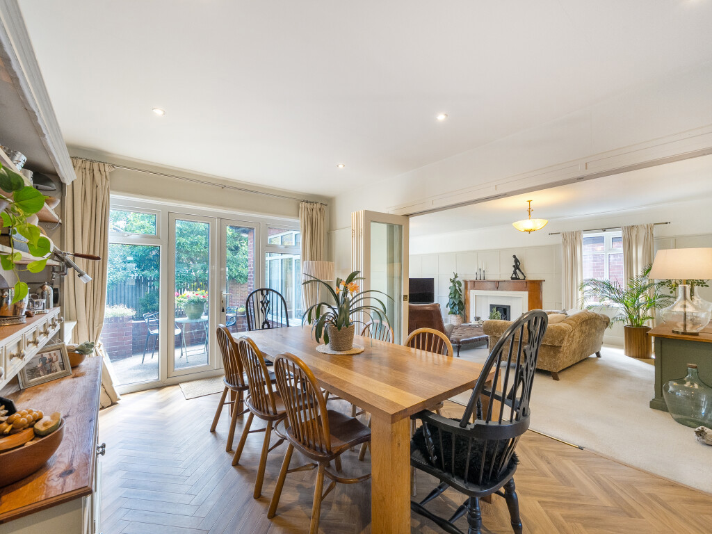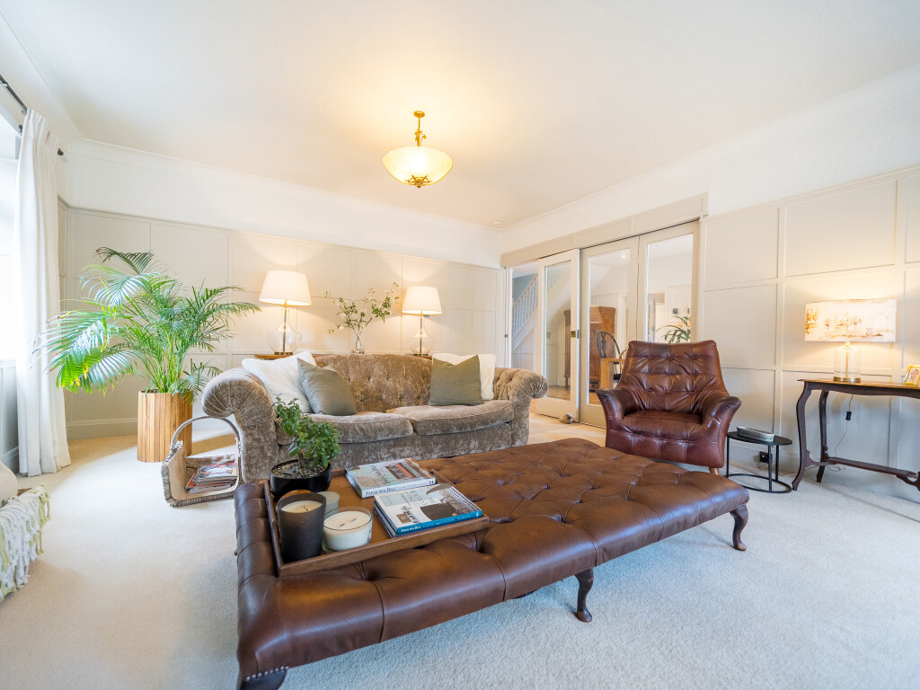 To the rear of the home, the formal living room offers a peaceful retreat, boasting large windows that overlook the private garden. Adjacent to the kitchen-diner is a separate TV room, creating an ideal space for movie nights or a dedicated children’s playroom.