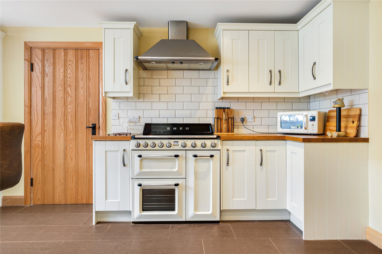 The property benefits from an entrance hall, three good size, living rooms, an open plan, kitchen/breakfast room featuring double Belfast sinks, space for Range cooker, with Smeg extractor over, central seating island, utility room and downstairs WC.