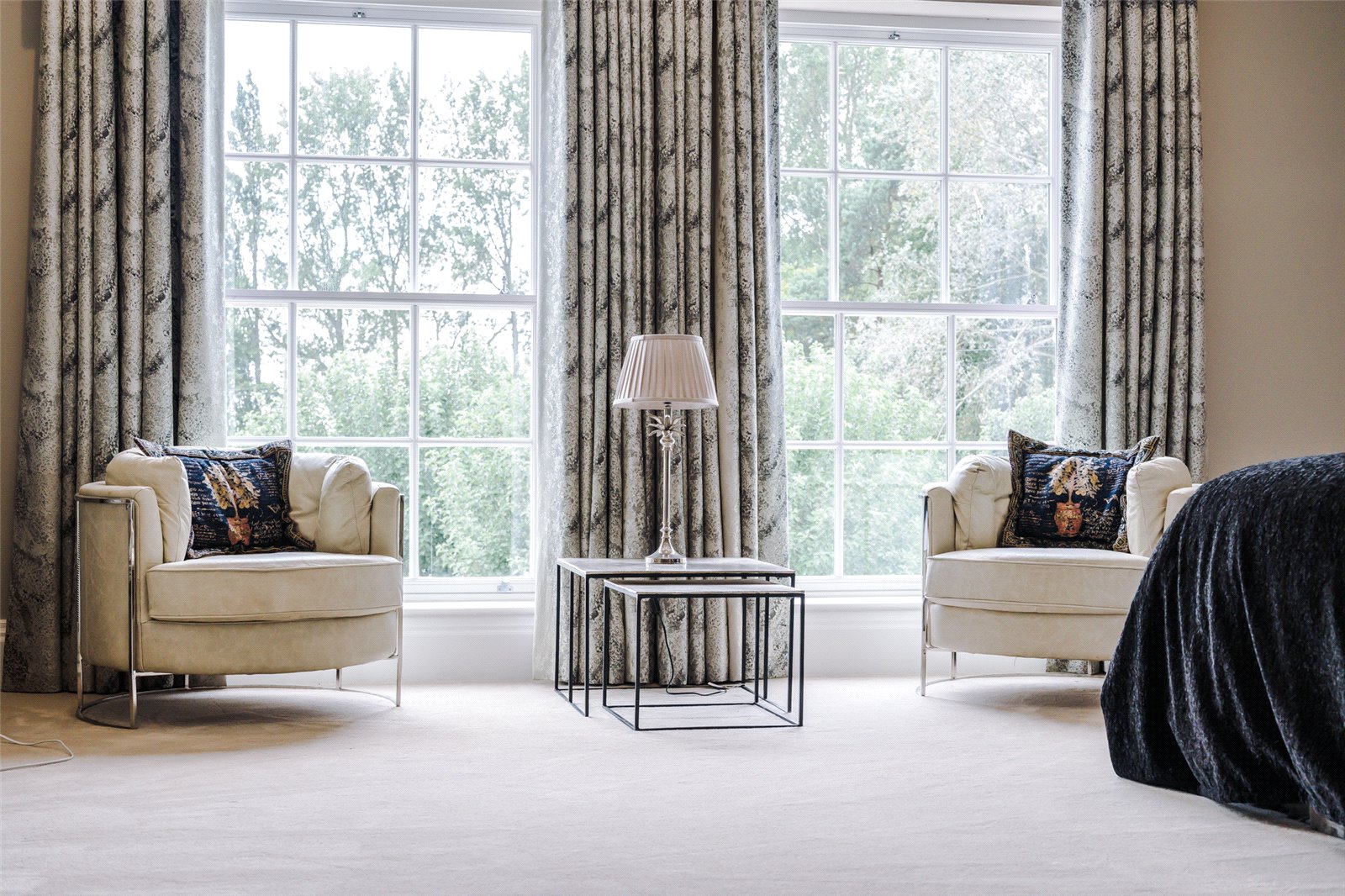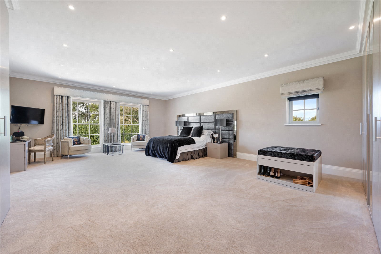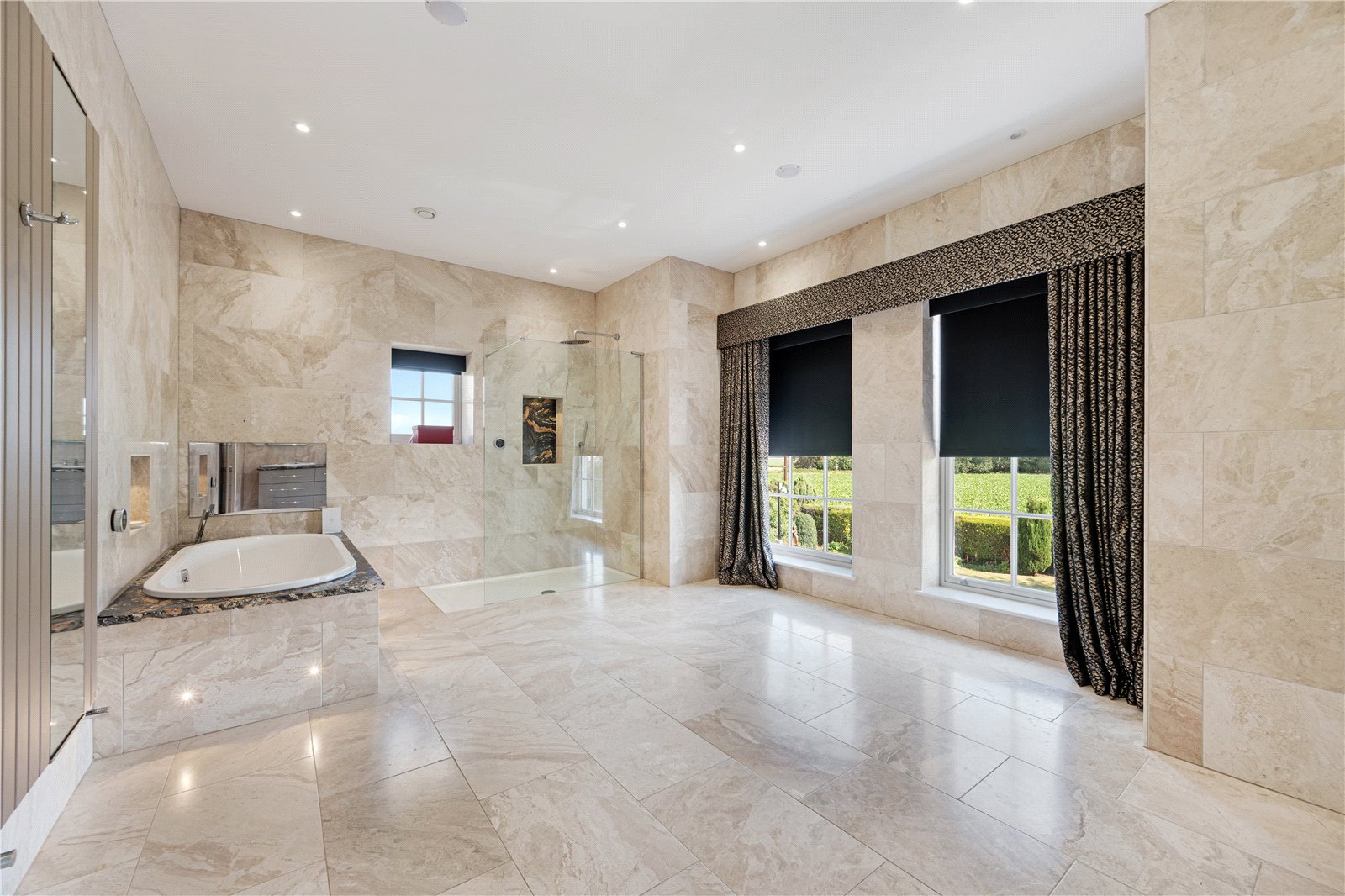 Upstairs, the long galleried landing leads to the impressive principal bedroom suite, which spans the width of the house and features fitted wardrobes and west-facing sash windows offering views of the garden and grounds. The substantial en-suite bathroom is bathed in natural light from tall multi-paned windows and includes a mirrored radiator, ceiling speakers, floating double vanity unit, bathtub with wall-mounted TV, and a walk-in rainfall shower with a handheld shower head. There are two additional bedroom suites with en-suite shower rooms and another large bedroom. The family bathroom is fully tiled and features a floating double vanity unit, a television concealed within a mirror, and ceiling speakers. All bedrooms are fitted with bespoke wardrobes, and all bathrooms are luxuriously appointed.