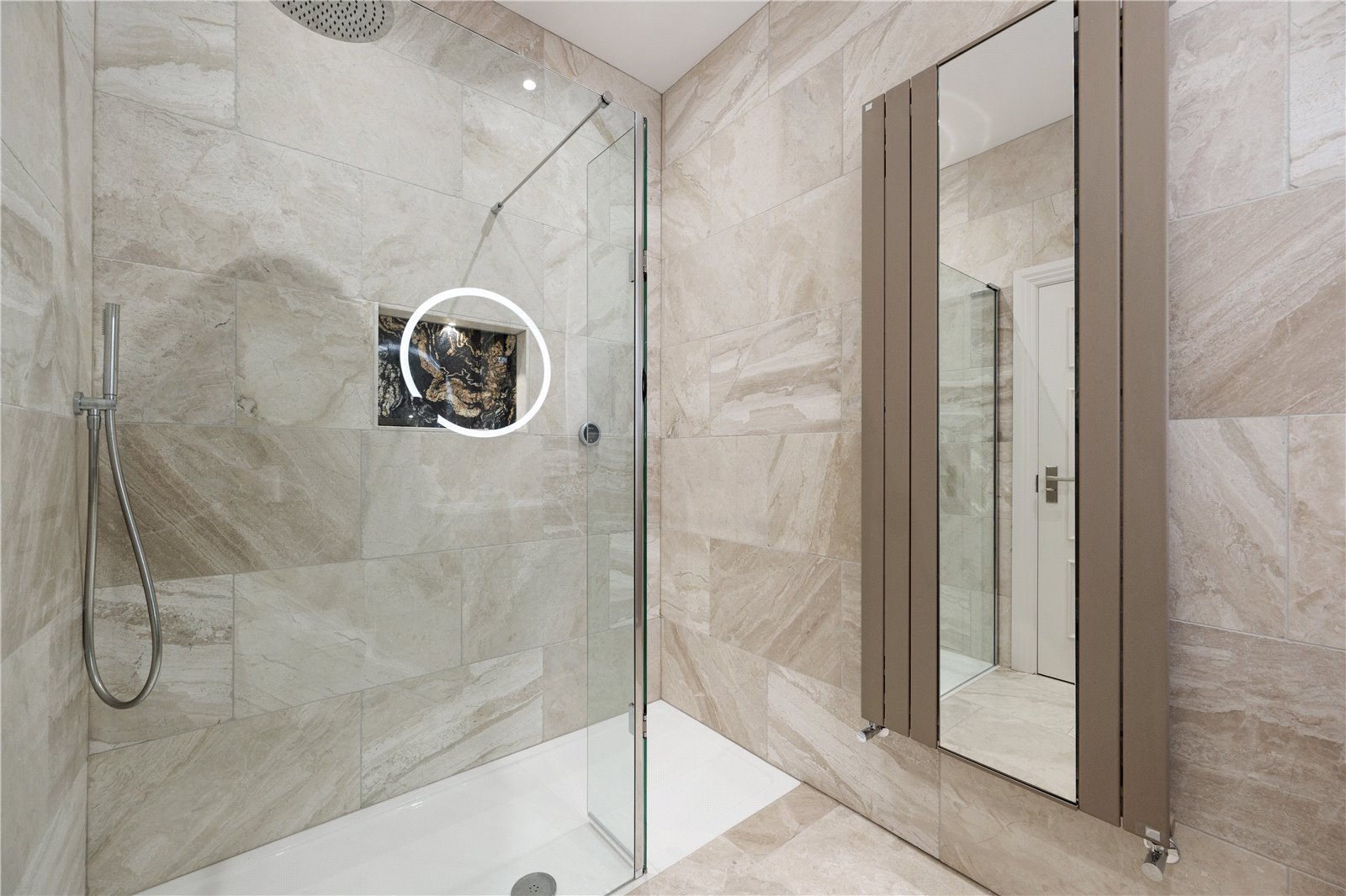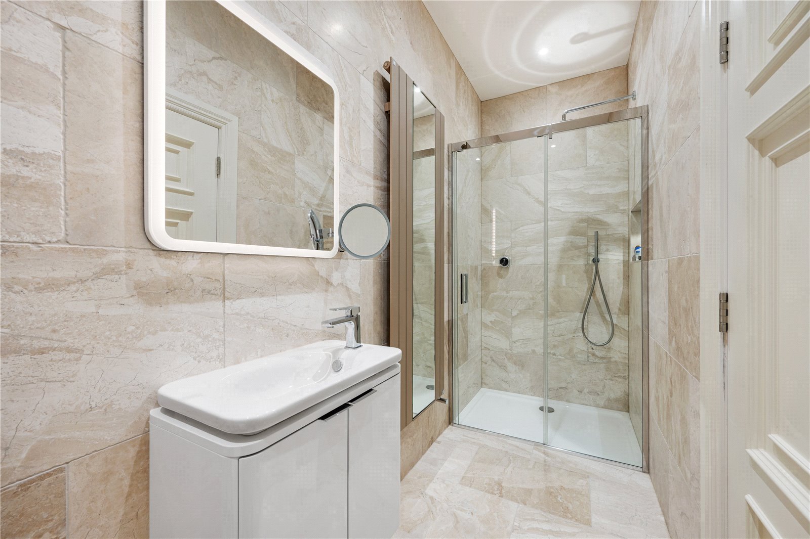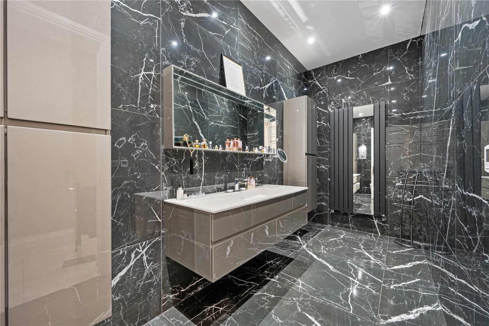 Upstairs, the long galleried landing leads to the impressive principal bedroom suite, which spans the width of the house and features fitted wardrobes and west-facing sash windows offering views of the garden and grounds. The substantial en-suite bathroom is bathed in natural light from tall multi-paned windows and includes a mirrored radiator, ceiling speakers, floating double vanity unit, bathtub with wall-mounted TV, and a walk-in rainfall shower with a handheld shower head. There are two additional bedroom suites with en-suite shower rooms and another large bedroom. The family bathroom is fully tiled and features a floating double vanity unit, a television concealed within a mirror, and ceiling speakers. All bedrooms are fitted with bespoke wardrobes, and all bathrooms are luxuriously appointed.