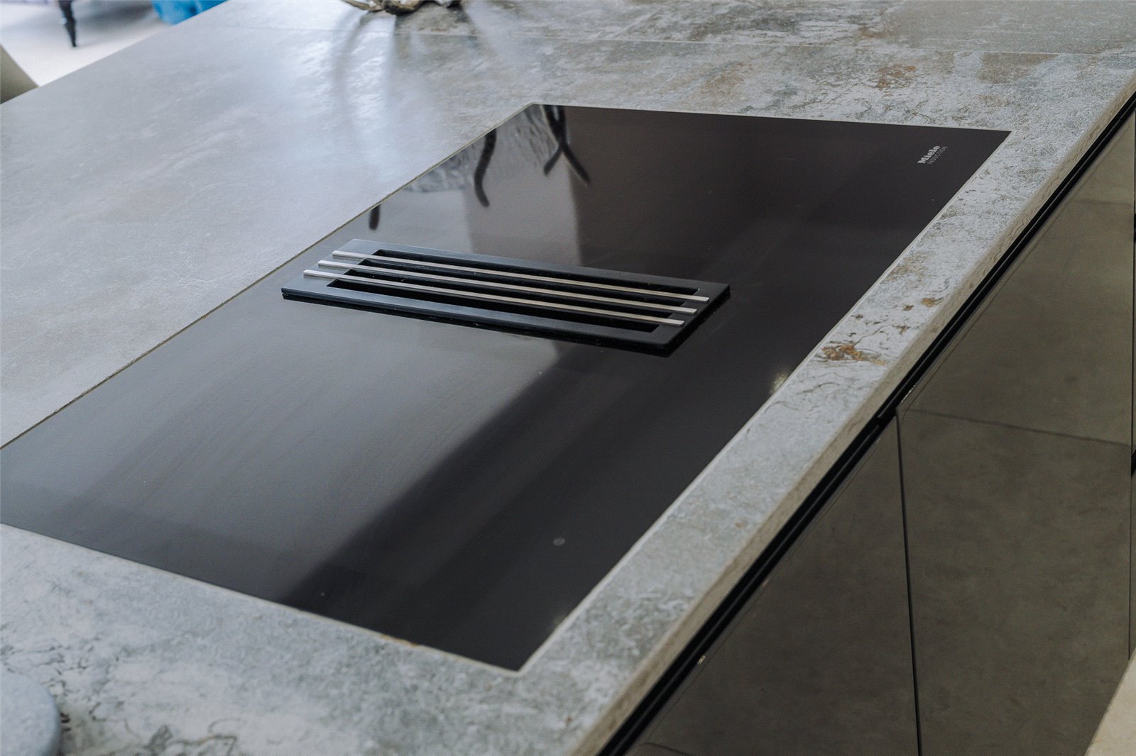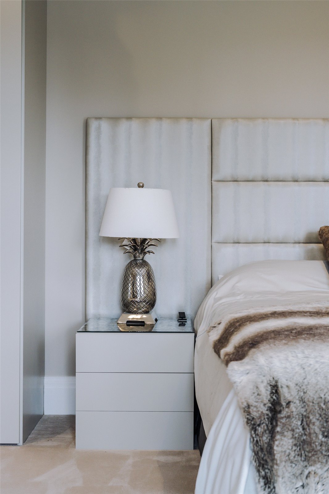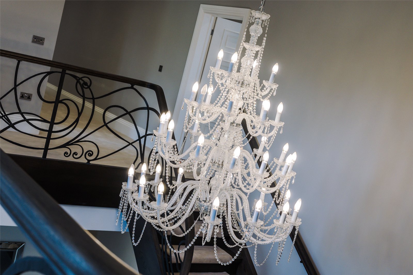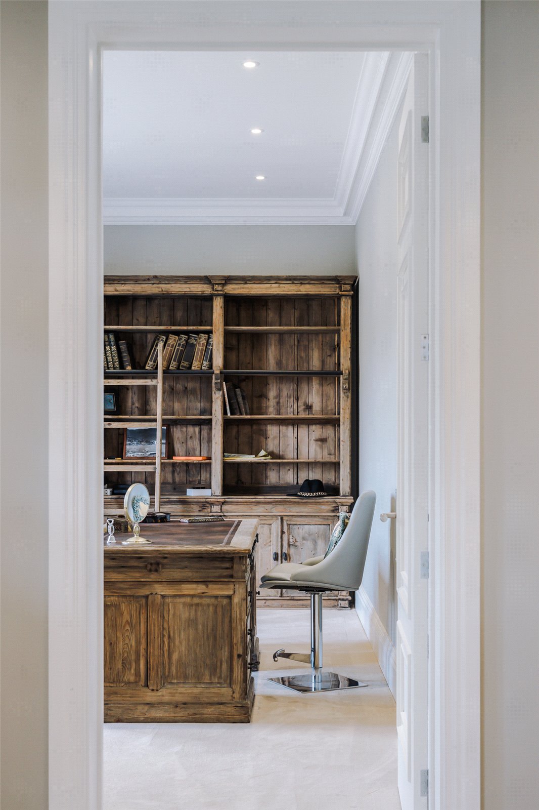 The bespoke kitchen is equipped with top-of-the-line Miele appliances and Dekton Orix worktops, complemented by soft-close, handleless units, an island with breakfast bar, hot water tap, induction hob with downdraft extractor, and two wine coolers. Adjacent domestic offices provide practical family and utility space. A superb study with tall windows overlooks the sweeping driveway.