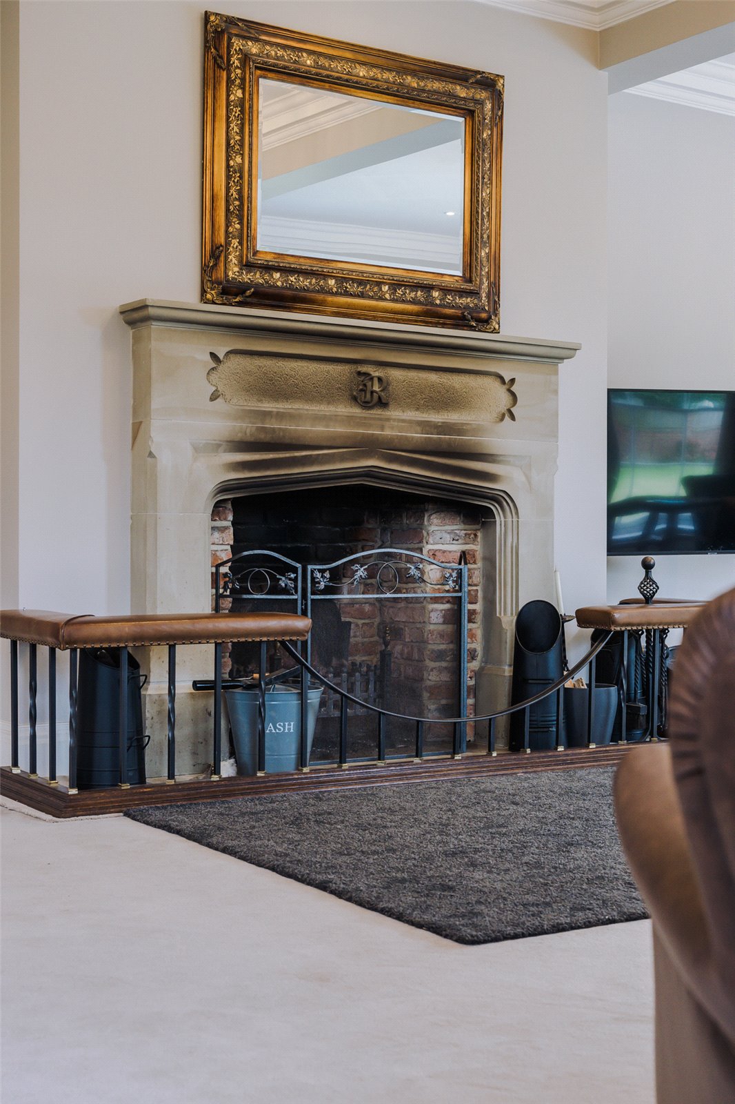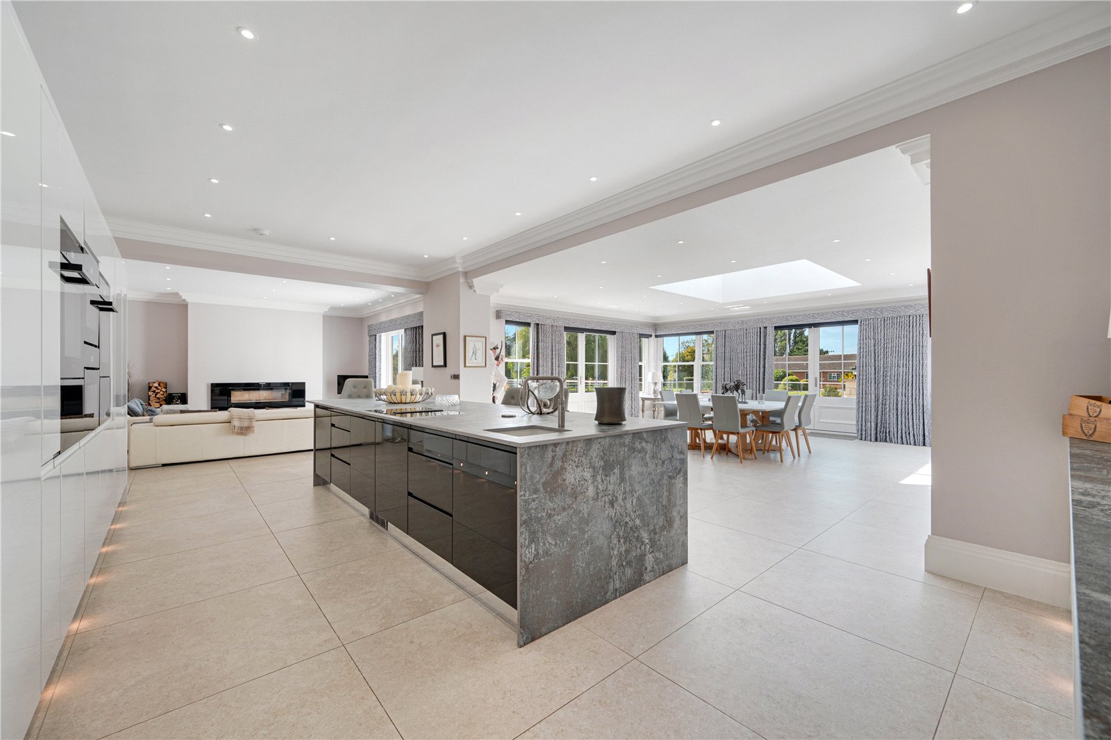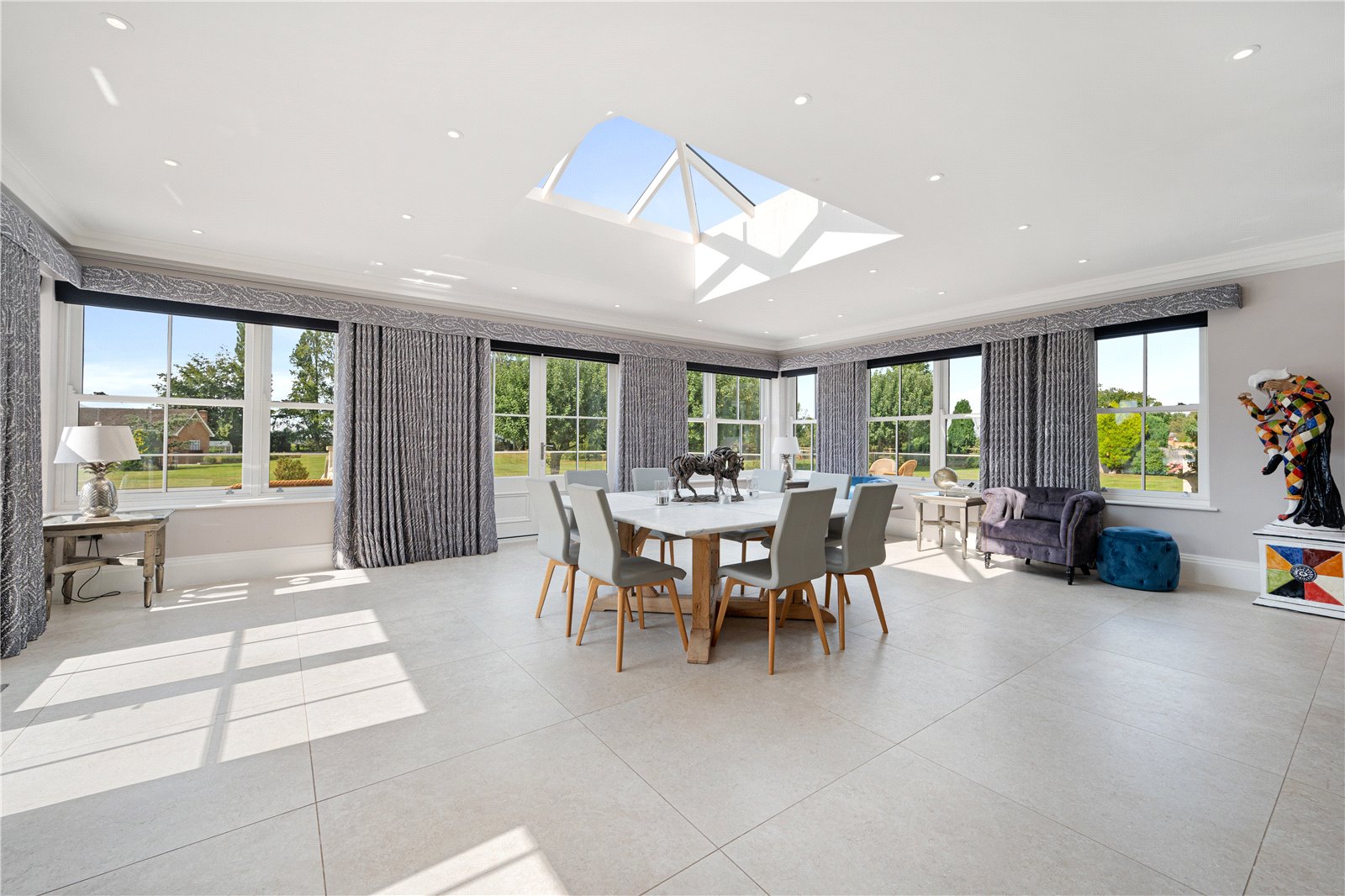 Double doors lead to the impressive 36ft drawing room, which boasts an imposing stone fireplace with an open fire and wrought-iron club fender seating. This triple-aspect room is flooded with natural light from tall sash windows and bi-fold doors that open west to the garden terrace, offering long views across the grounds. At the heart of the home is a stunning open-plan family space spanning nearly 50 ft, encompassing the kitchen/breakfast room, garden room, and dining room, with French and bi-fold doors leading to a south and west-facing terrace. The dining room features a roof lantern and full-height glazing on three sides, while the sitting area/family room includes a contemporary wall-mounted Stovax wood-burning stove.