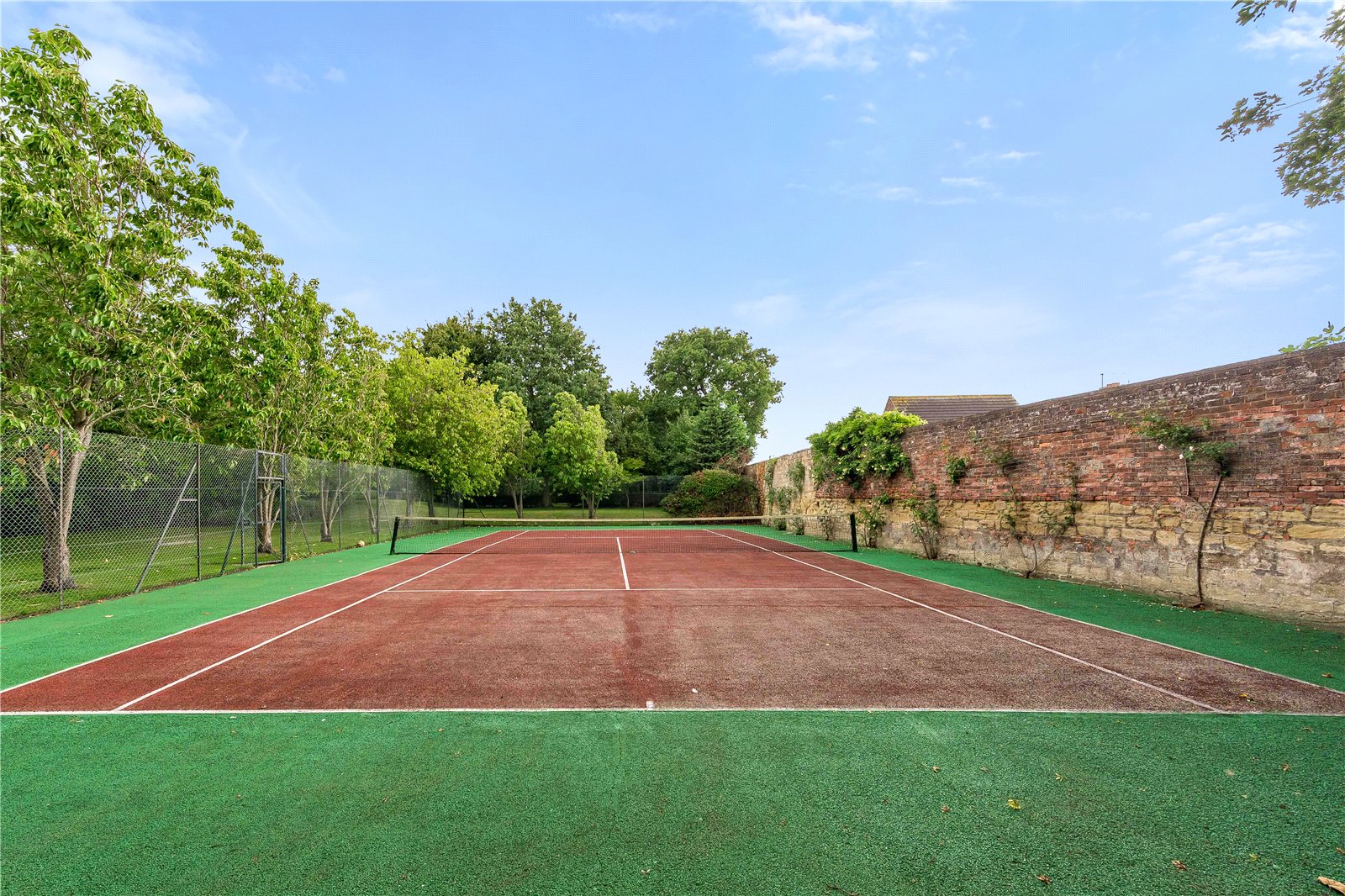 The grounds are as impressive as the interiors: landscaped lawns, a large ornamental pond with fountain, a resurfaced tennis court, and a productive orchard filled with apples, pears, cherries, and plums. A ha-ha and arched bridge lead into the wider parkland, with woodland trails and a fenced paddock completing the estate.