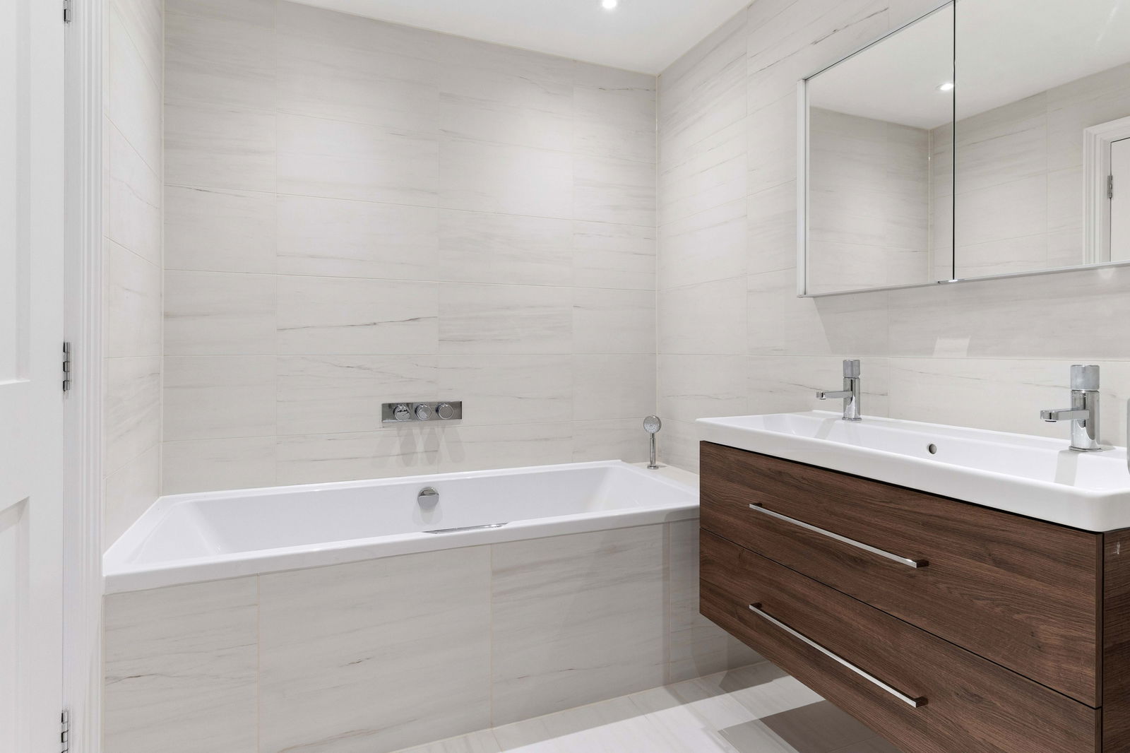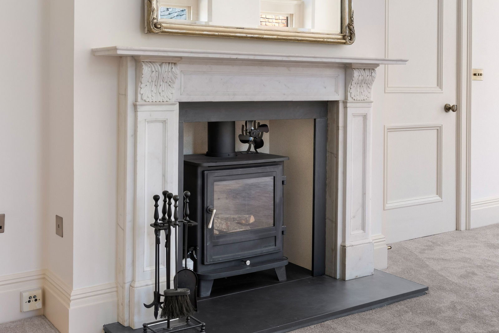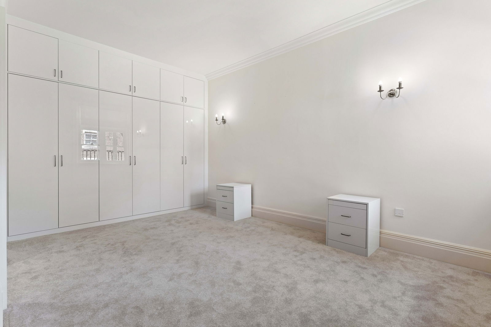 The substantial, light-filled drawing room has beautiful high ceilings and triple aspect sash windows along with French doors leading out to the Southwest facing terrace. A stunning original Victorian fireplace made from Italian Statvario marble, which has been professionally restored houses a Chesney wood burning stove. New carpet throughout and in excellent decorative condition. The East facing principal bedroom has beautiful ceiling height sash windows to the front of the building with ornate picture rail and new Hammonds white high gloss built in wardrobes. There is a luxury high end en-suite bathroom with under floor heating, bath and substantial shower, his and hers basin with floating vanity storage draws and Villeroy & Boch W.C along with fully tiled porcelain walls and flooring. There is also a large mirrored Keuco wall cabinet and high quality chrome wear throughout.