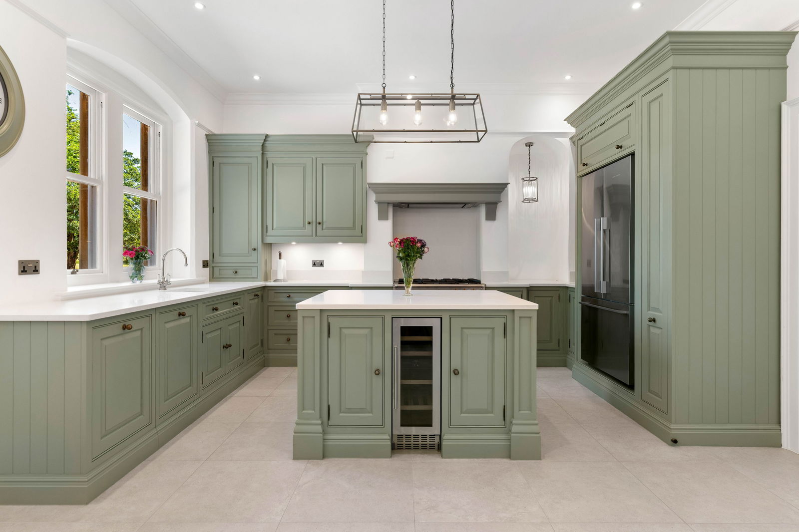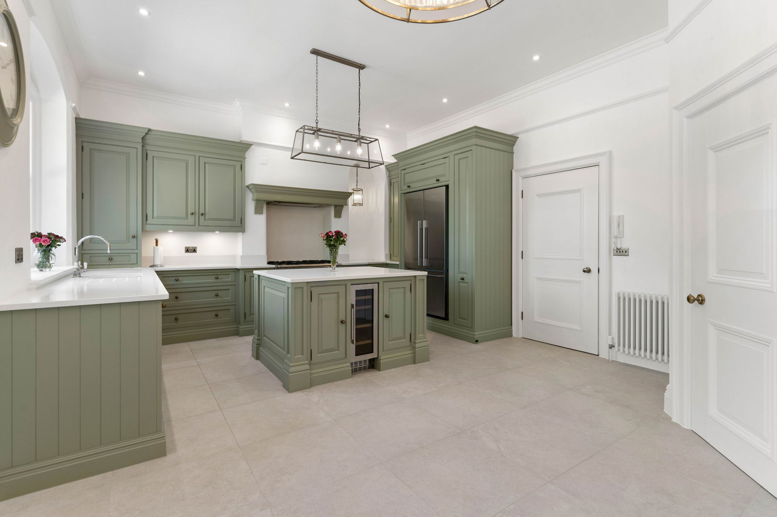 A step up to the main lobby with recently fitted carpets flowing through the hallway which leads to the kitchen, drawing room and master bedroom. A superb bespoke Tom Howley kitchen fitted in 2023 and hand painted in a Farrow and Ball colour, with matching sideboard. The stunning kitchen has a Falcon range oven with gas hob and Westin extractor fan, Miele dishwasher and Fisher & Paykel fridge freezer. Caesar stone organic white quartz worktops and complementary island with wine cooler.