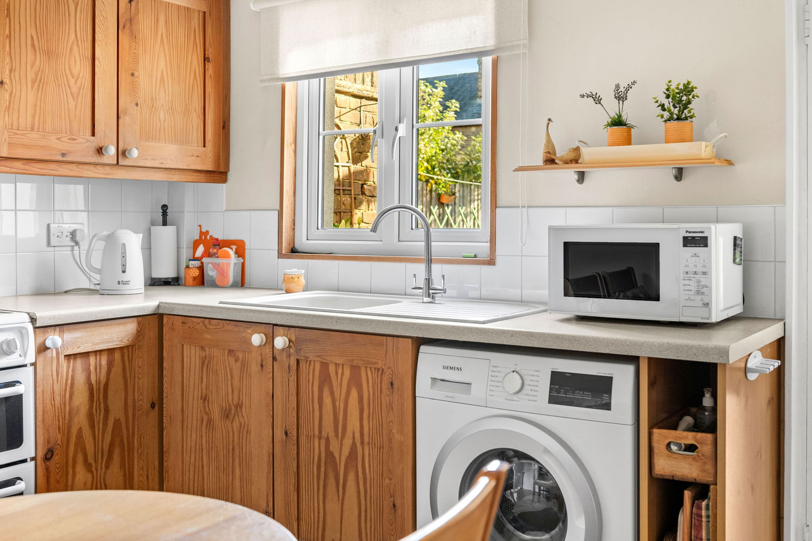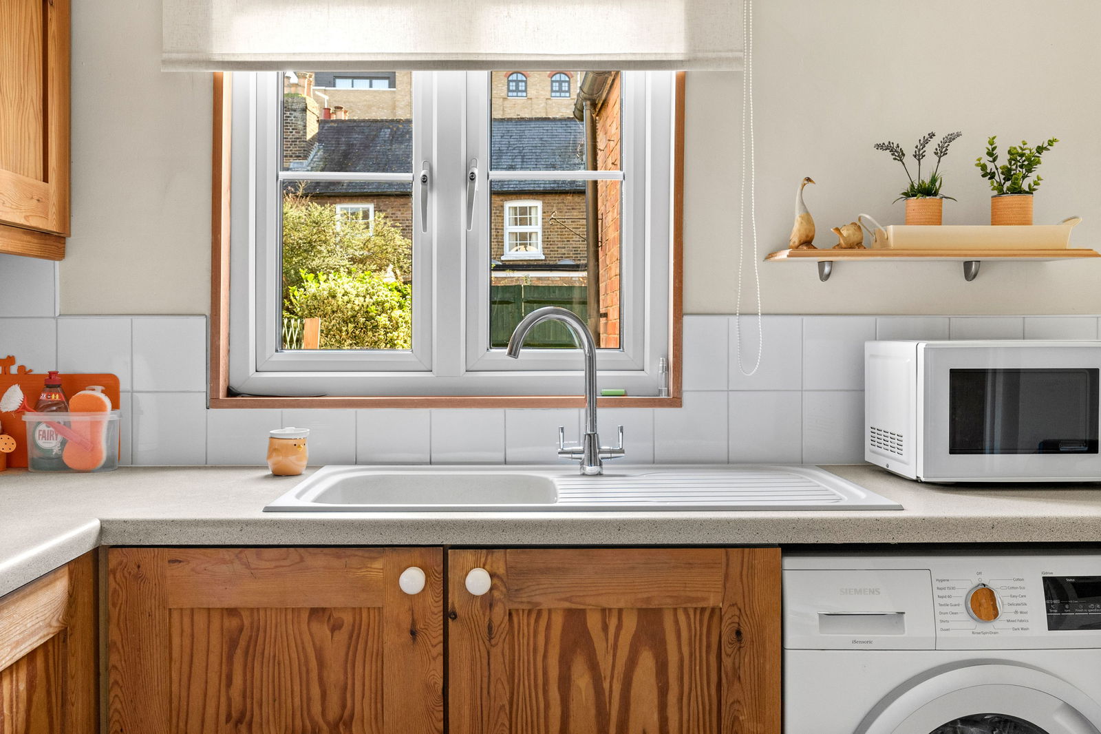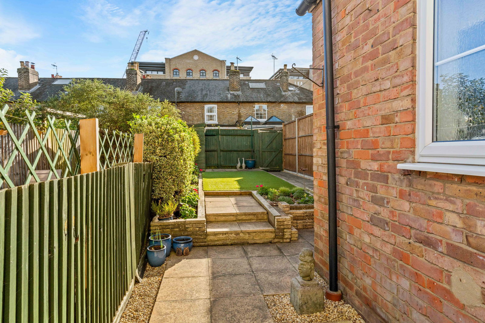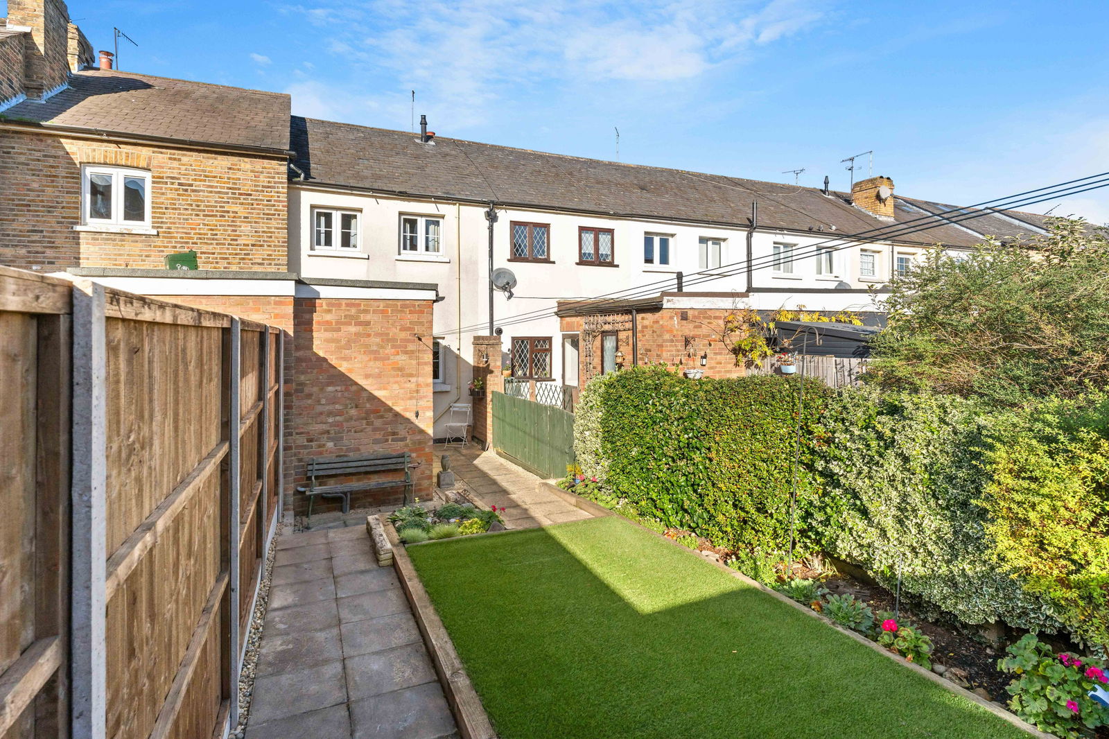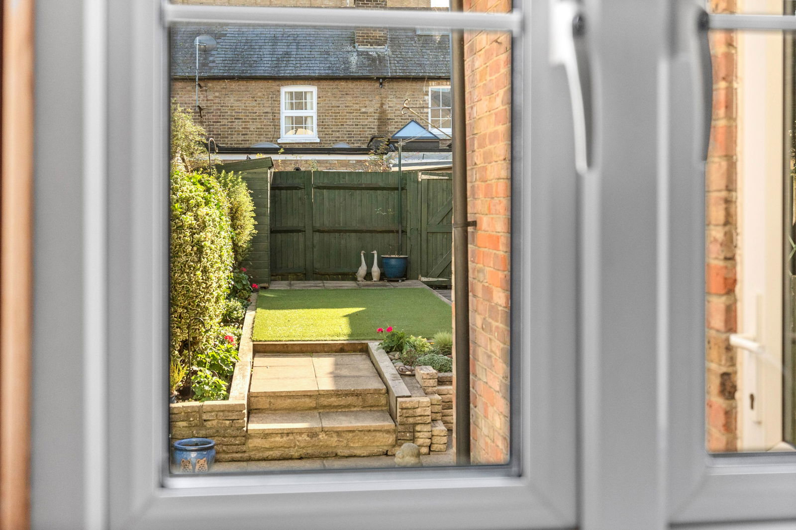 A lovely front garden with wrought iron gates lead you to the modern, recently fitted composite front door and into the living room. The living room is cosy and inviting with traditional dado rail and wooden doors with double glazed windows, there is a feature fire place with surround and plenty of under stair storage. The kitchen is a great size and with plenty of space for a kitchen table and lovely views out to the private rear garden. There is a doorway to a lobby area with door leading out to the rear garden and a white three piece bathroom suit with vanity sink and storage below. On the first floor you will find two double bedrooms both with amazing views or the local character that Hertford has to offer.