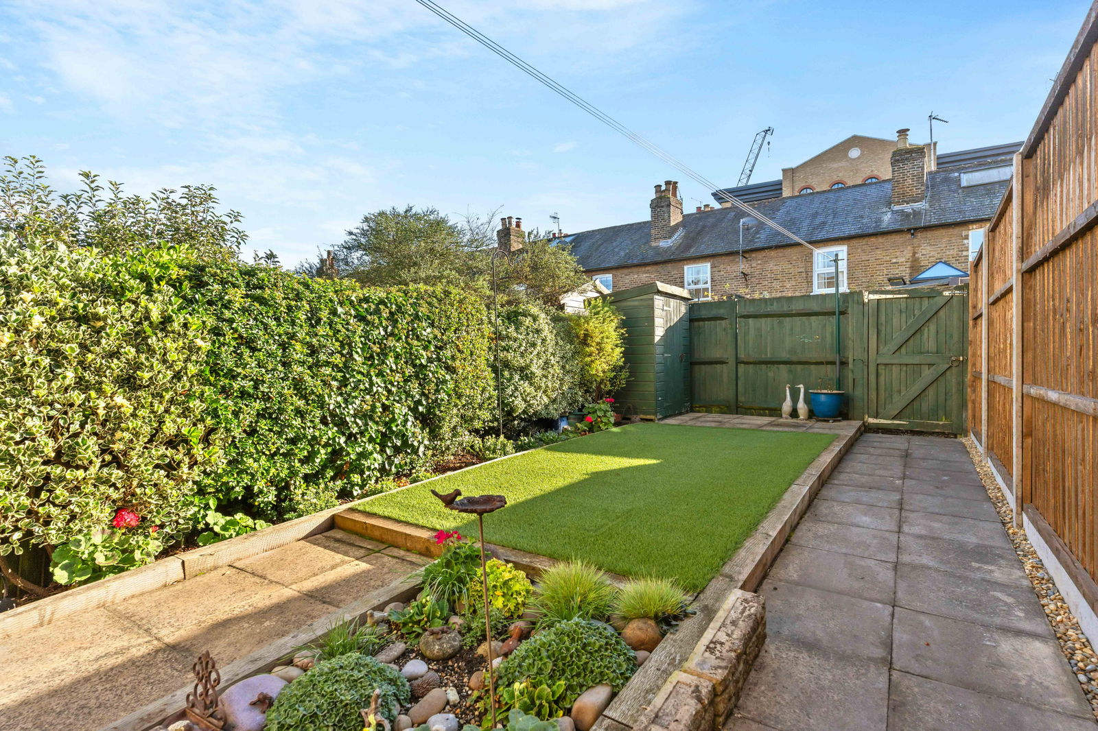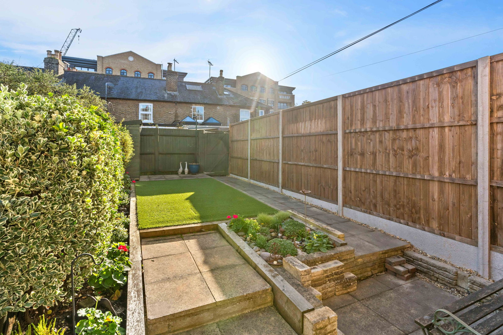 A delightful, private rear garden with a patio area, steps leading up to an artificial lawn and flower boarders. There is a shed and rear gate with access to the rear.