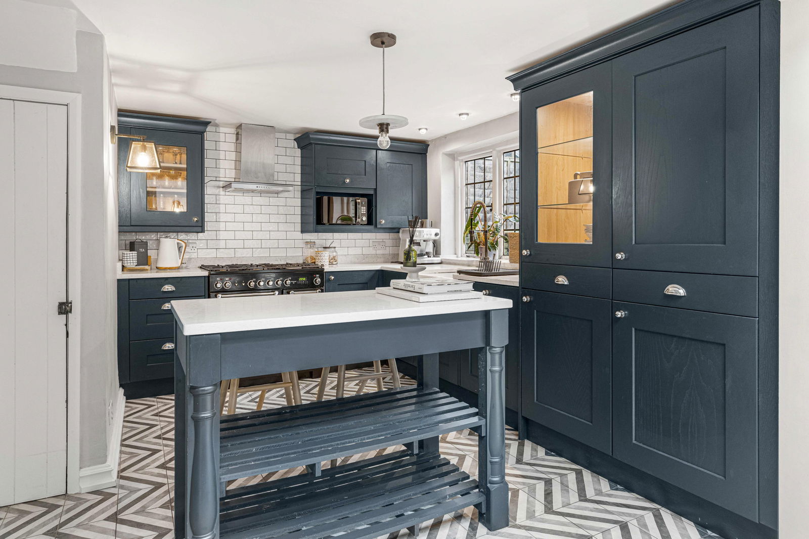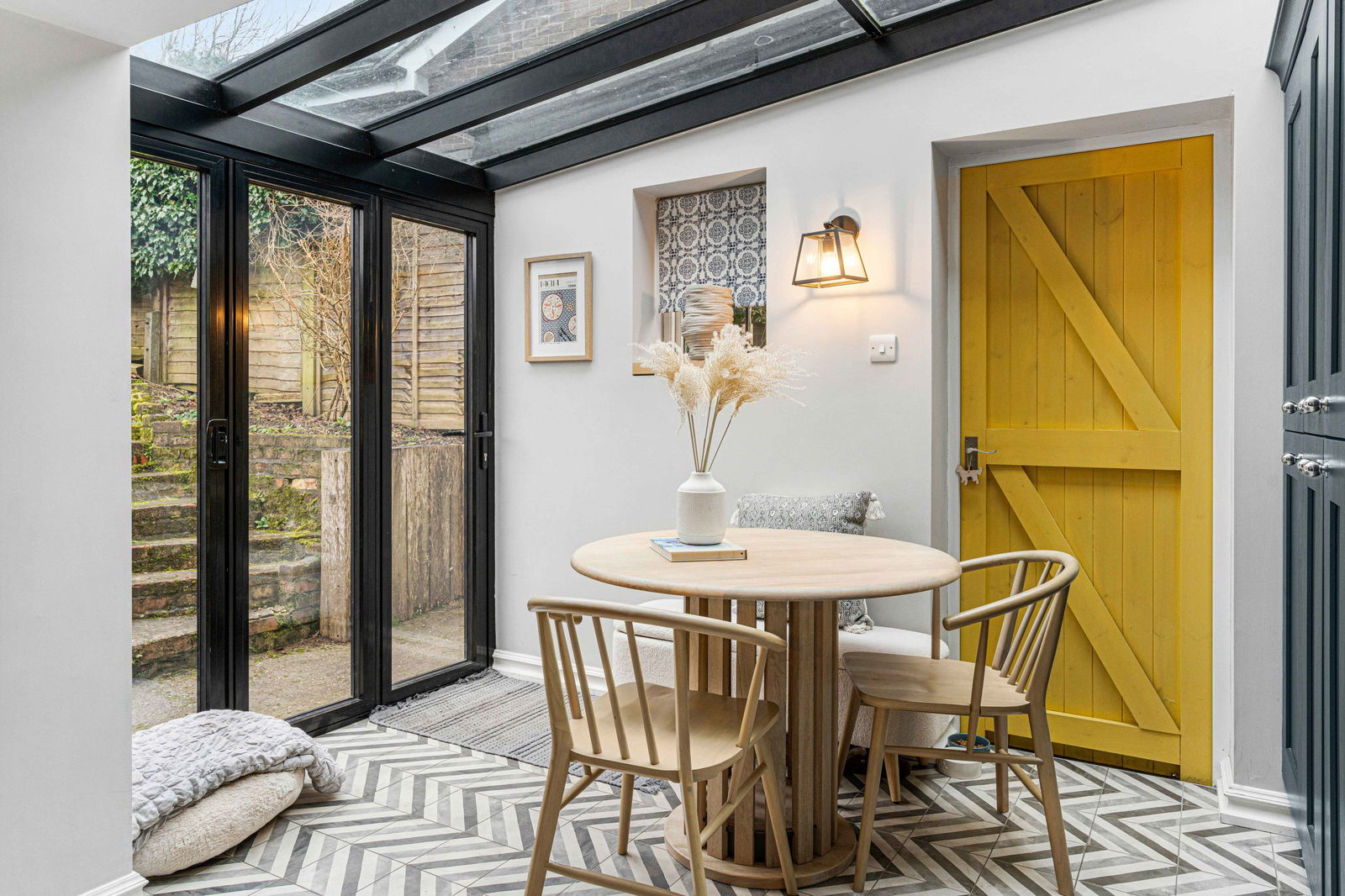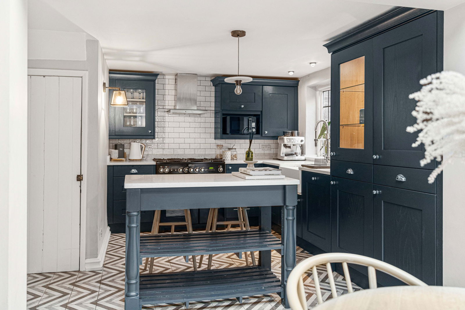 The living room is a delight and enjoys a large bay window to the front aspect, exposed timbers and a red brick fireplace with wood burning stove. Stairs rise to the first floor and a door opens into the kitchen/dining room. Beautifully fitted with an extensive range of wall and base level units with granite worktops and set off by white subway tiled surrounds. There is an island unit, built in dishwasher as well as a second built in fridge. Further matching units provide space for washing machine and tumble dryer and a fridge freezer. There is a butler sink and windows overlooking the rear garden. The dining area has a glazed roof and bi fold doors leading into the garden allowing light to fill the room. This is the hub of the home and a great place for entertaining family and friends.
