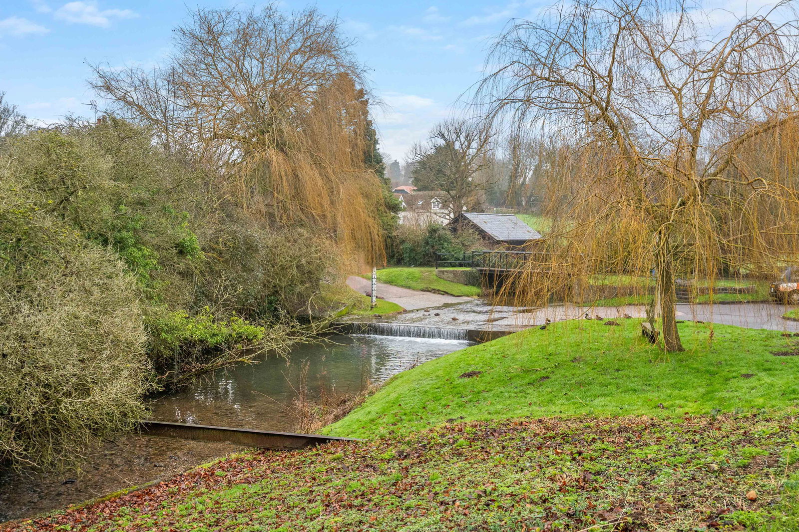 Upstairs, off the landing to the rear is a good size double bedroom overlooking the beautifully landscaped back garden. The bedroom is lovely and light and well fitted with built in wardrobes. Off the landing to the front, is a bath/dressing room that leads into the principal bedroom. There is a roll top bath strategically placed on a raised plinth so one can enjoy the view to the ford. A wash basin sits impressively on an antique Singer sowing machine stand and the room is finished with encaustic tiles, exposed timbers and original floorboards. There is a deep walk-in wardrobe and dressing area. The principal bedroom is a lovely room that is both cosy and spacious with a slightly vaulted ceiling, exposed timbers and windows to both the front and side aspects.