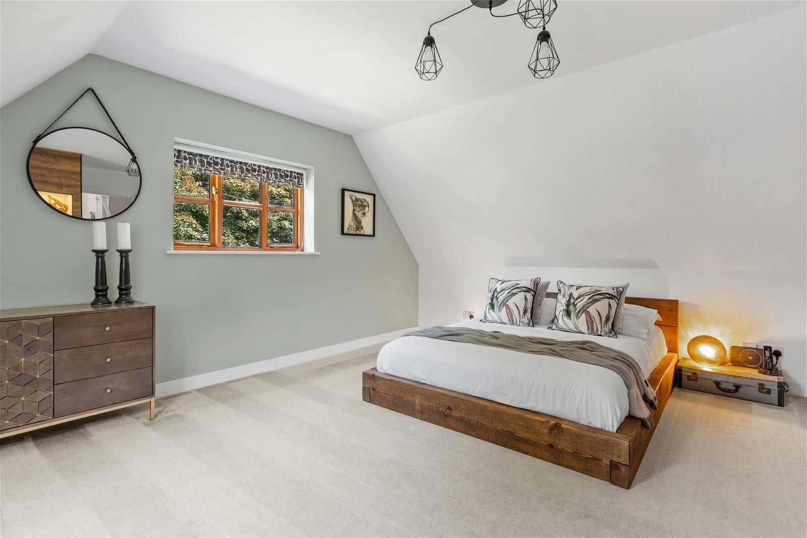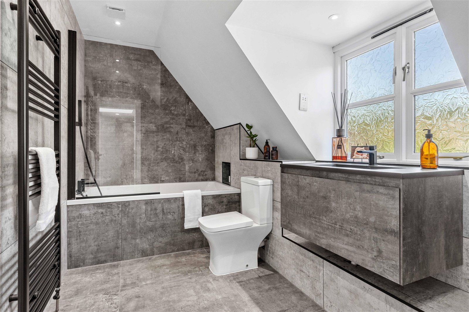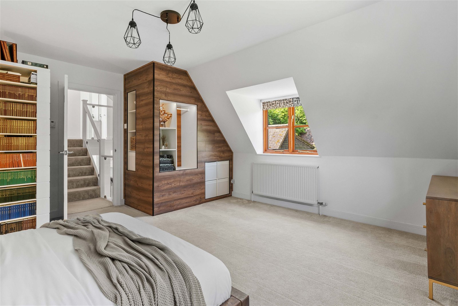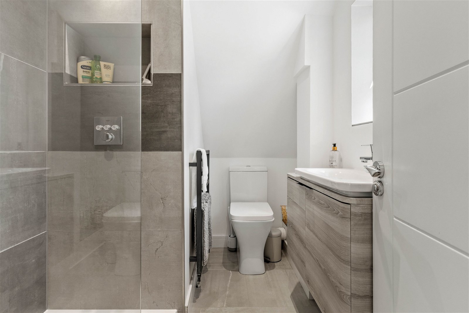 Stairs lead up to a half landing off which one finds an excellent large double bedroom with windows to two aspects, vaulted ceiling and fitted units. The stairs continue up to a further landing with built in cupboards. The main bedroom is a lovely double room with window to the rear overlooking the garden. There is a luxurious en suite shower room that has been beautifully refitted. The third bedroom is another double room with window to the rear and there is also a luxurious refitted family bathroom off the landing.