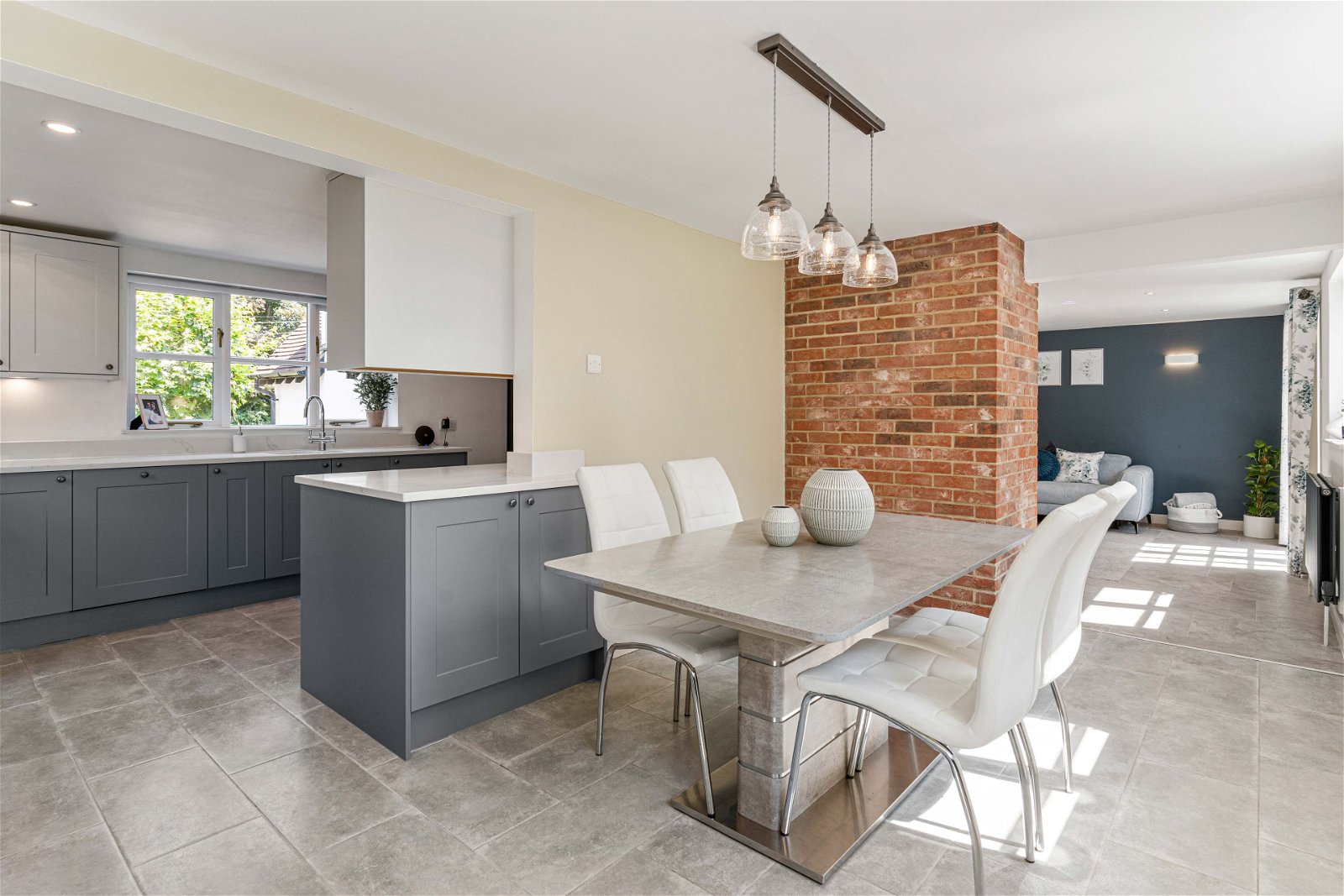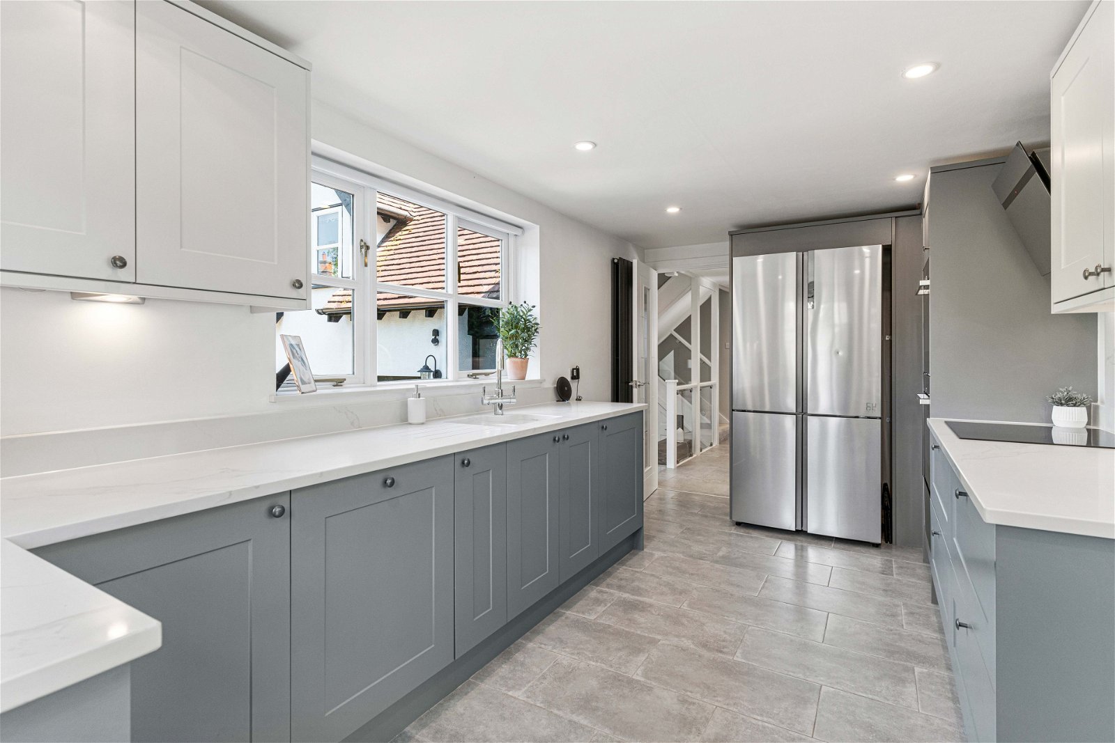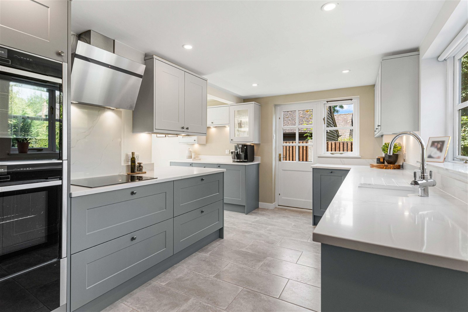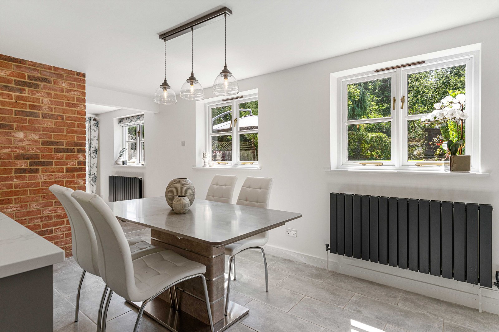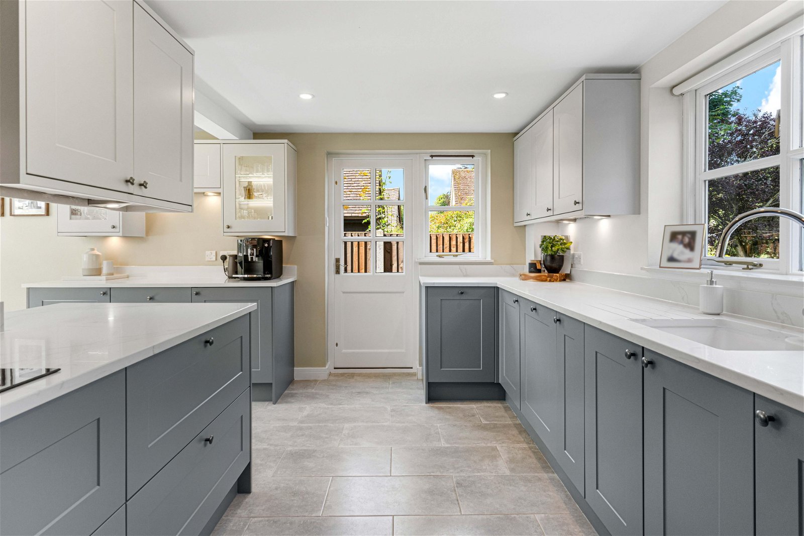 As soon as you walk into New Cottage you notice how light the hallway is. Being split level the owners have cleverly used glazed screens to the stairs and walls allowing the light to fill the room. Off the hall is a refitted cloakroom. The sitting room is found at the rear of the house with French doors and windows opening onto the south facing gardens. A good size light and airy room with a large red brick chimney and open fireplace. To the side of the chimney breast the sitting room opens into the dining room with windows overlooking the garden and being open plan to the kitchen. The kitchen has been refitted with an excellent range of wall and base units with white marble effect granite worktops and under unit lighting. There is a Neff double oven and warming tray, an electric hob with extractor hood and integrated dishwasher. There are window to both front and side aspects and a door leads out to the side. The utility room is also well fitted with a good range of wall and base units with sink and plumbing for washing machine. A door leads into the garage/store room with light and power and electric roller door.