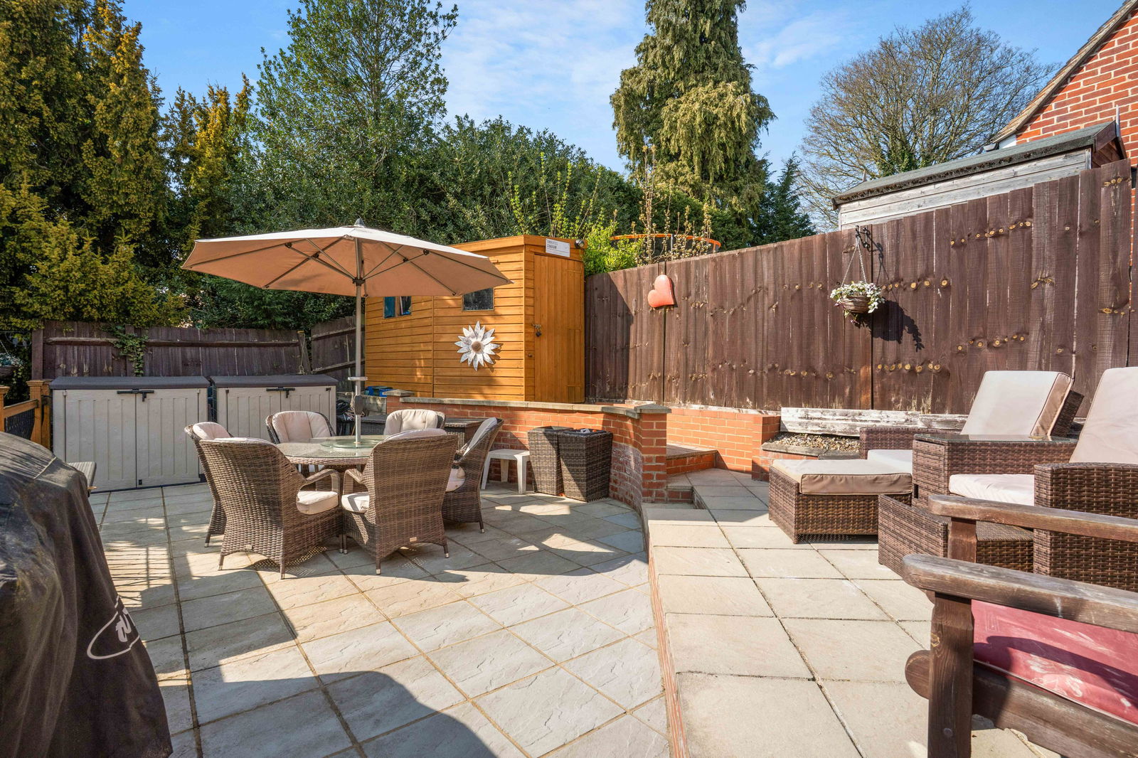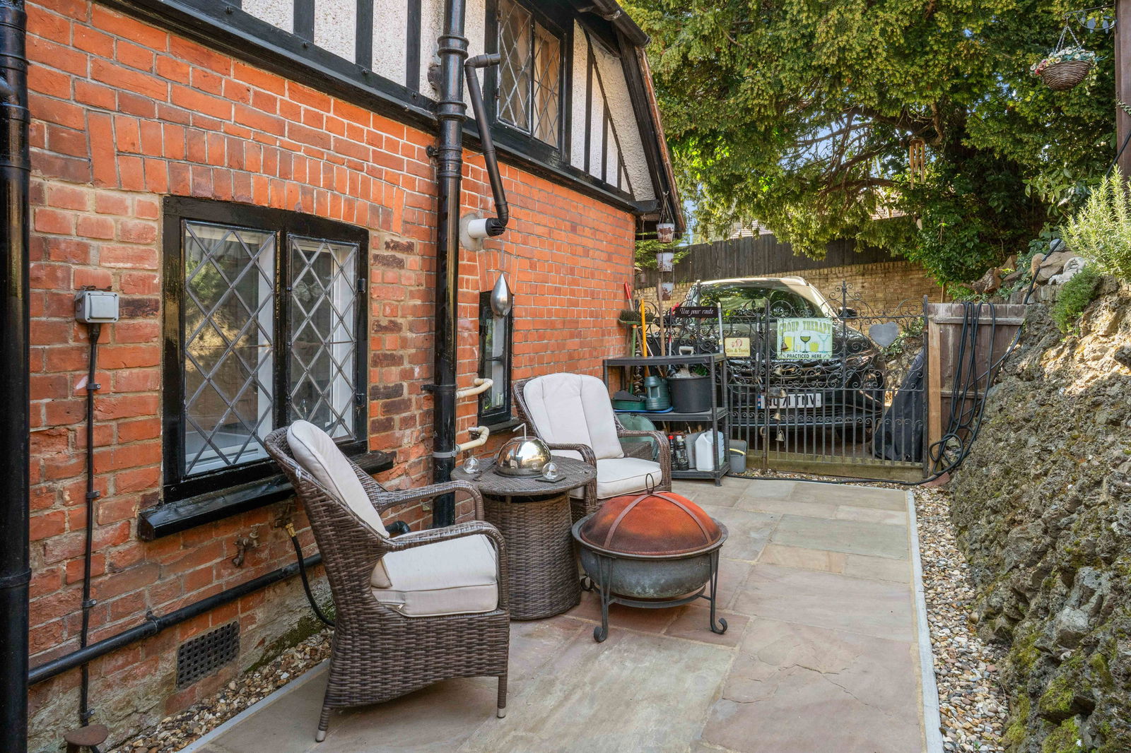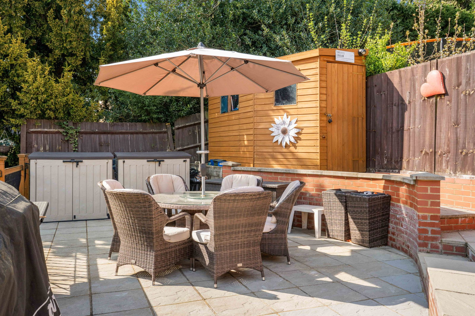 The rear garden has been well designed to offer various levels of patio and seating with a double wrought iron gate to the side which could allow a further car parking space from the one to the side of the property. Steps lead up to a large patio area and wooden shed with power and light.