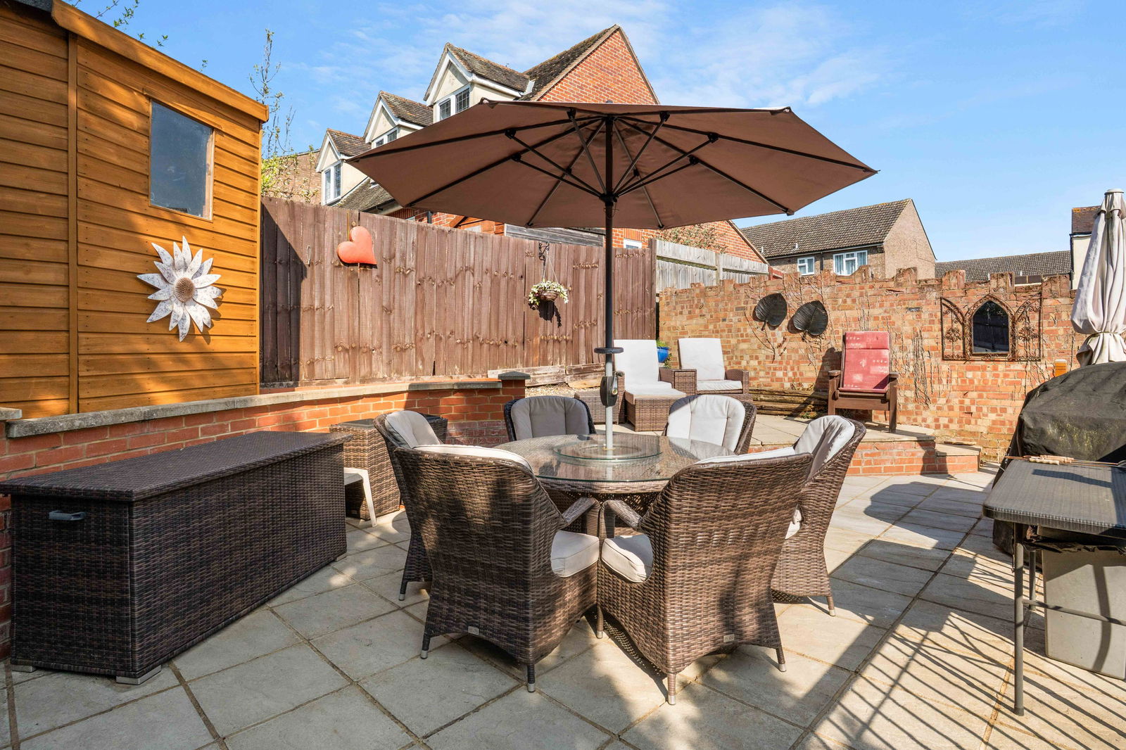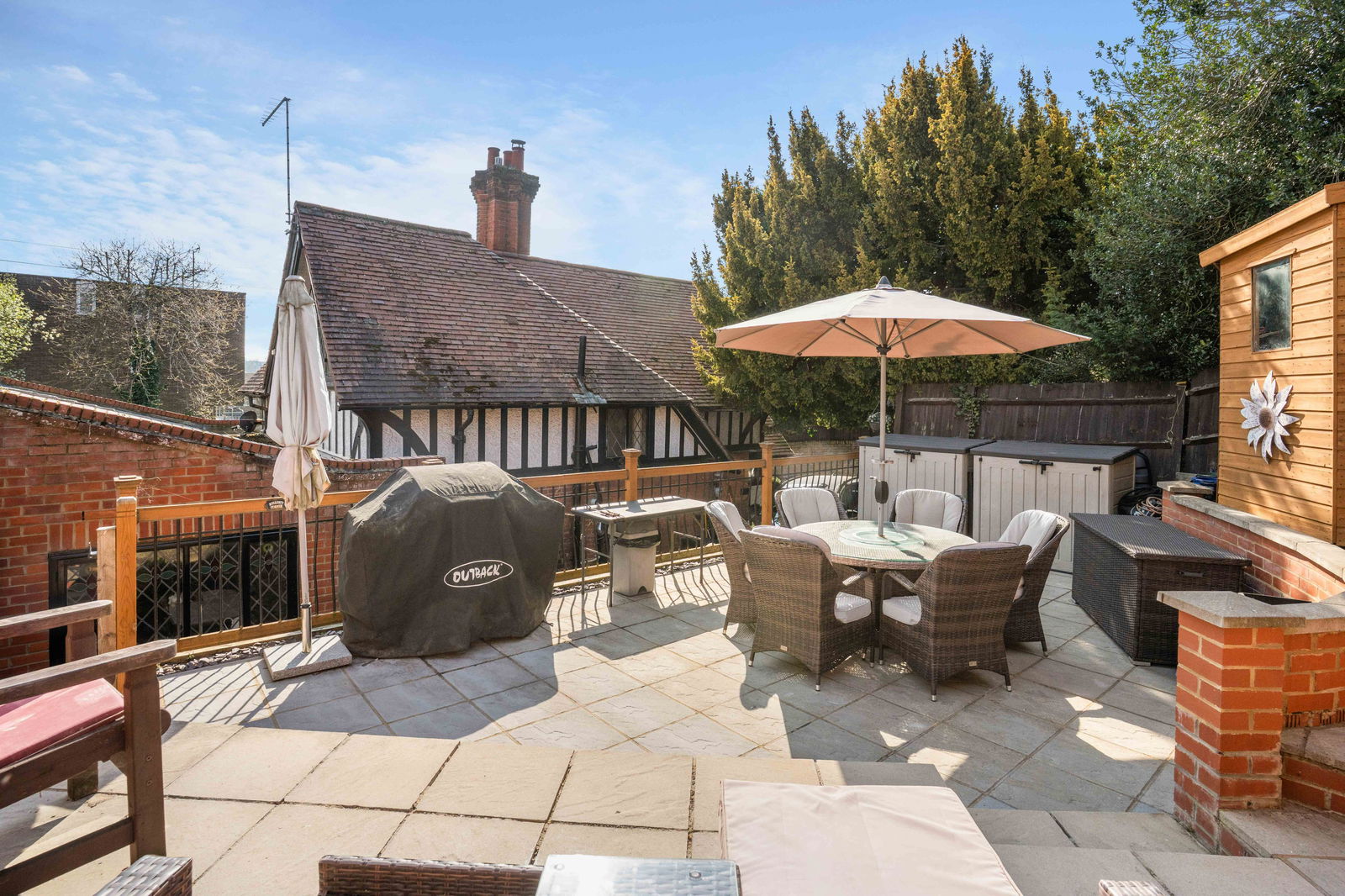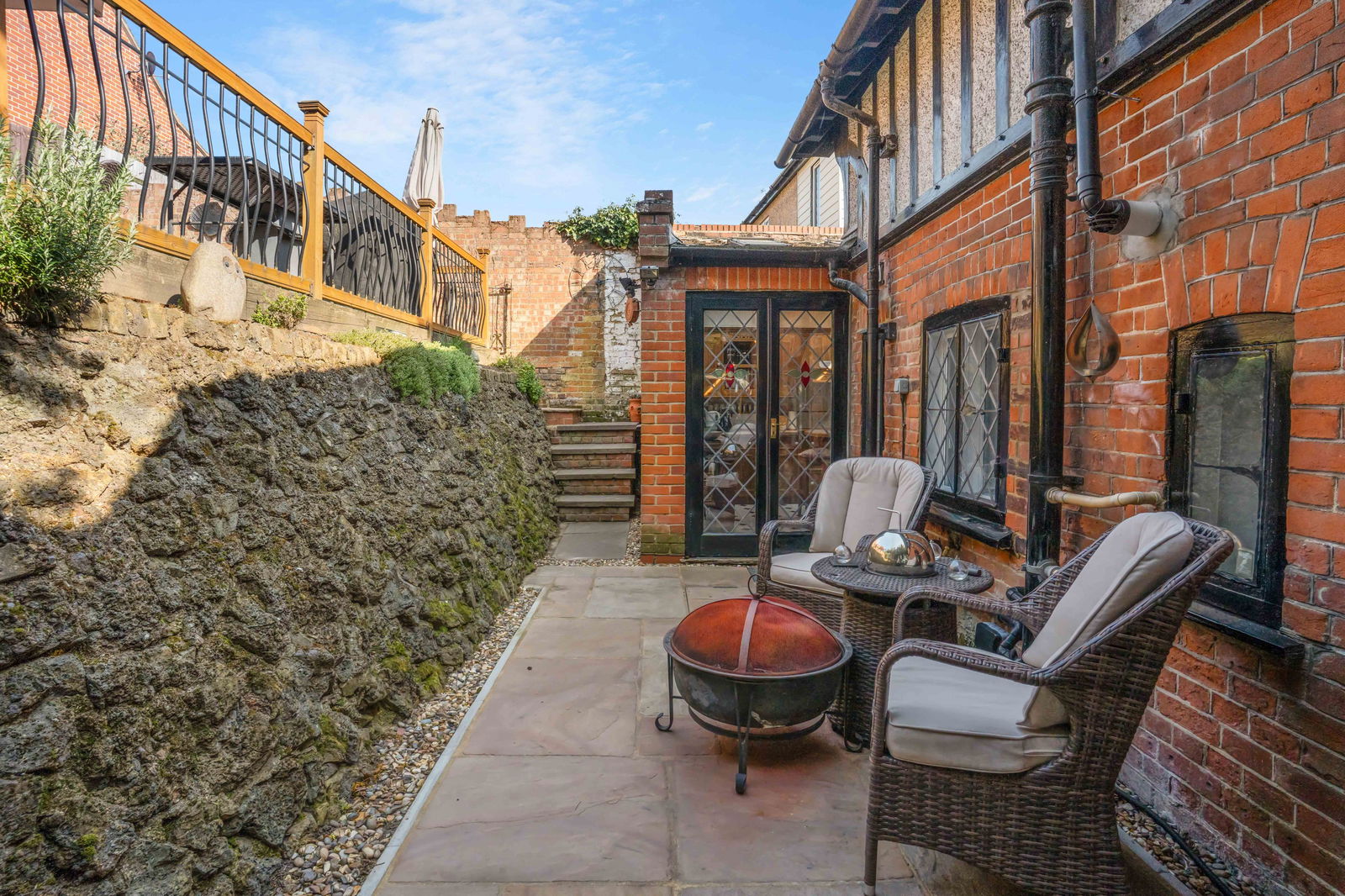 The rear garden has been well designed to offer various levels of patio and seating with a double wrought iron gate to the side which could allow a further car parking space from the one to the side of the property. Steps lead up to a large patio area and wooden shed with power and light.
