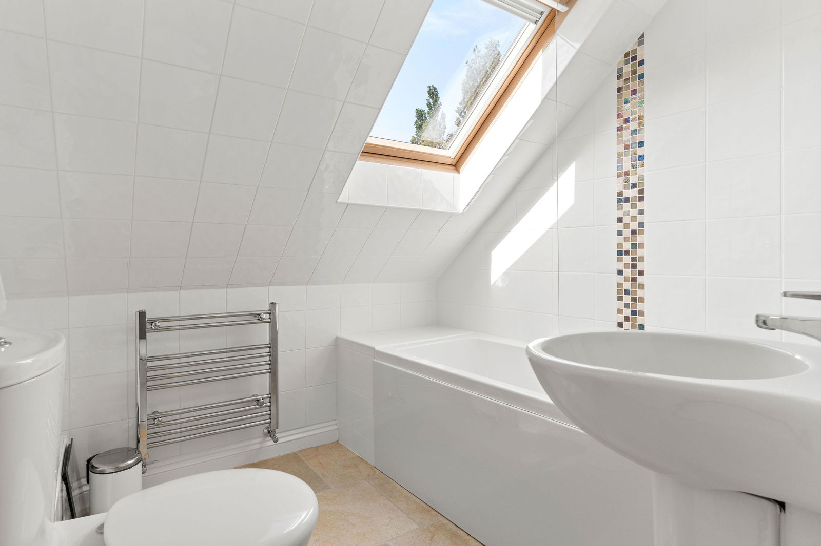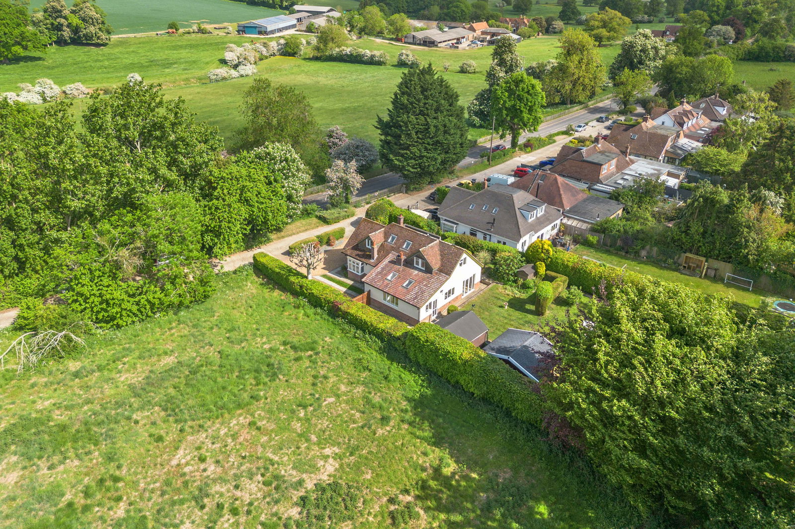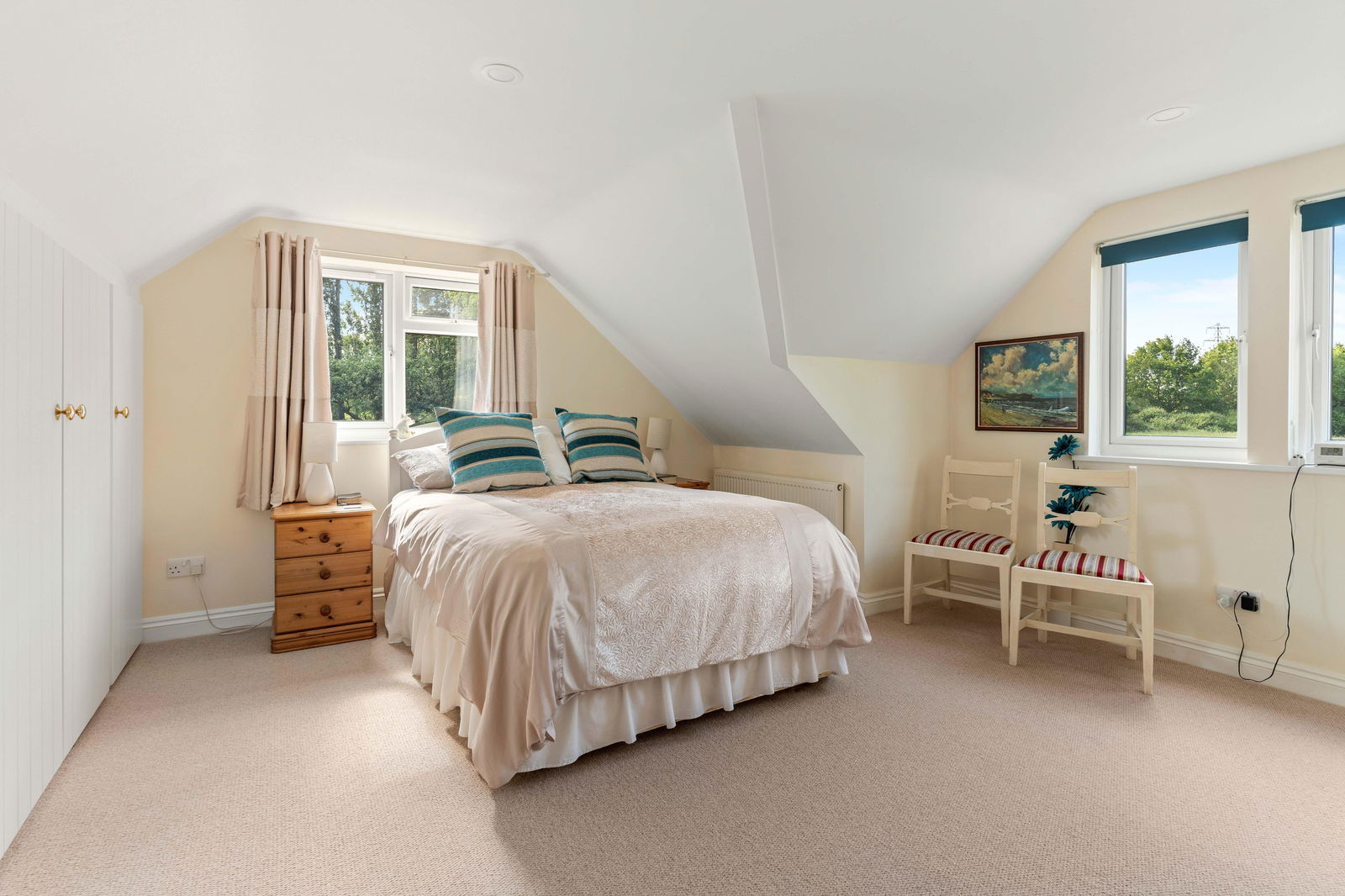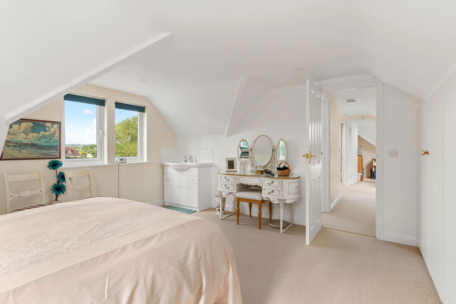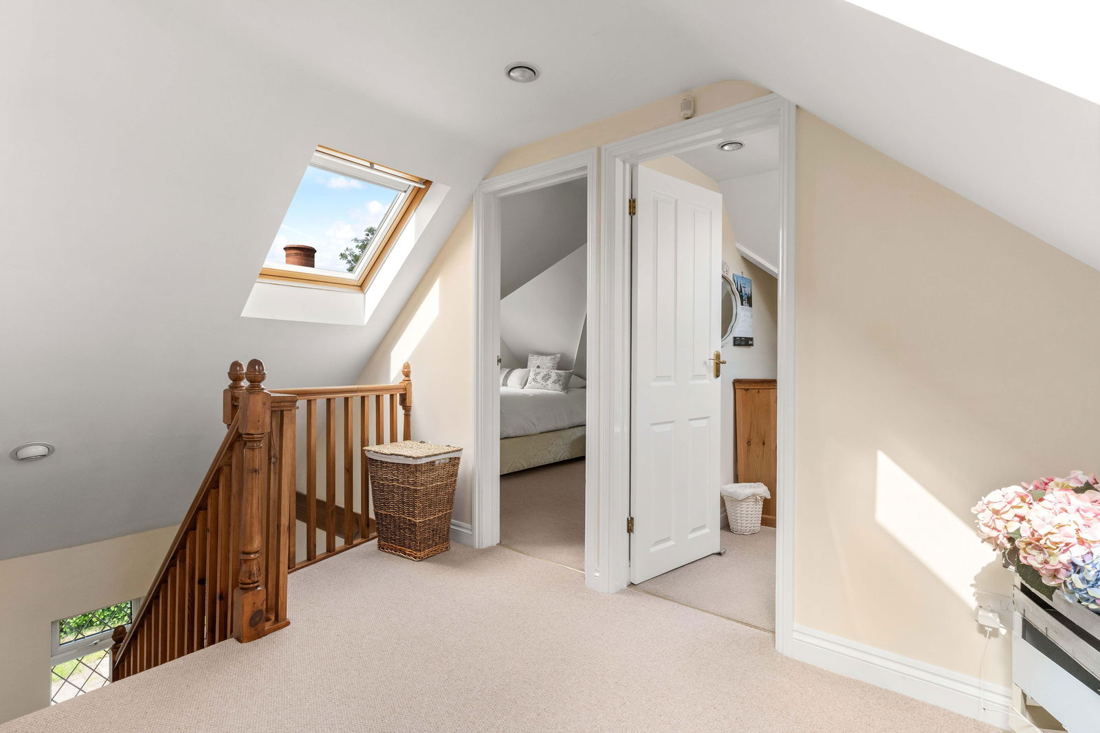 Upstairs is a spacious landing with an airing/linen cupboard, off which one finds the principal bedroom with fitted wardrobes and being double aspect with views over the adjoining field and the garden. There is a family bathroom, attractively fitted with a contemporary modern suite and Velux roof light. There are two further bedrooms, one a nursery room/study and the other a teenagers bedroom with an area for the bed and also a dressing/play area with fitted wardrobes. These rooms are built into the eaves and, as such, have some restricted headroom.