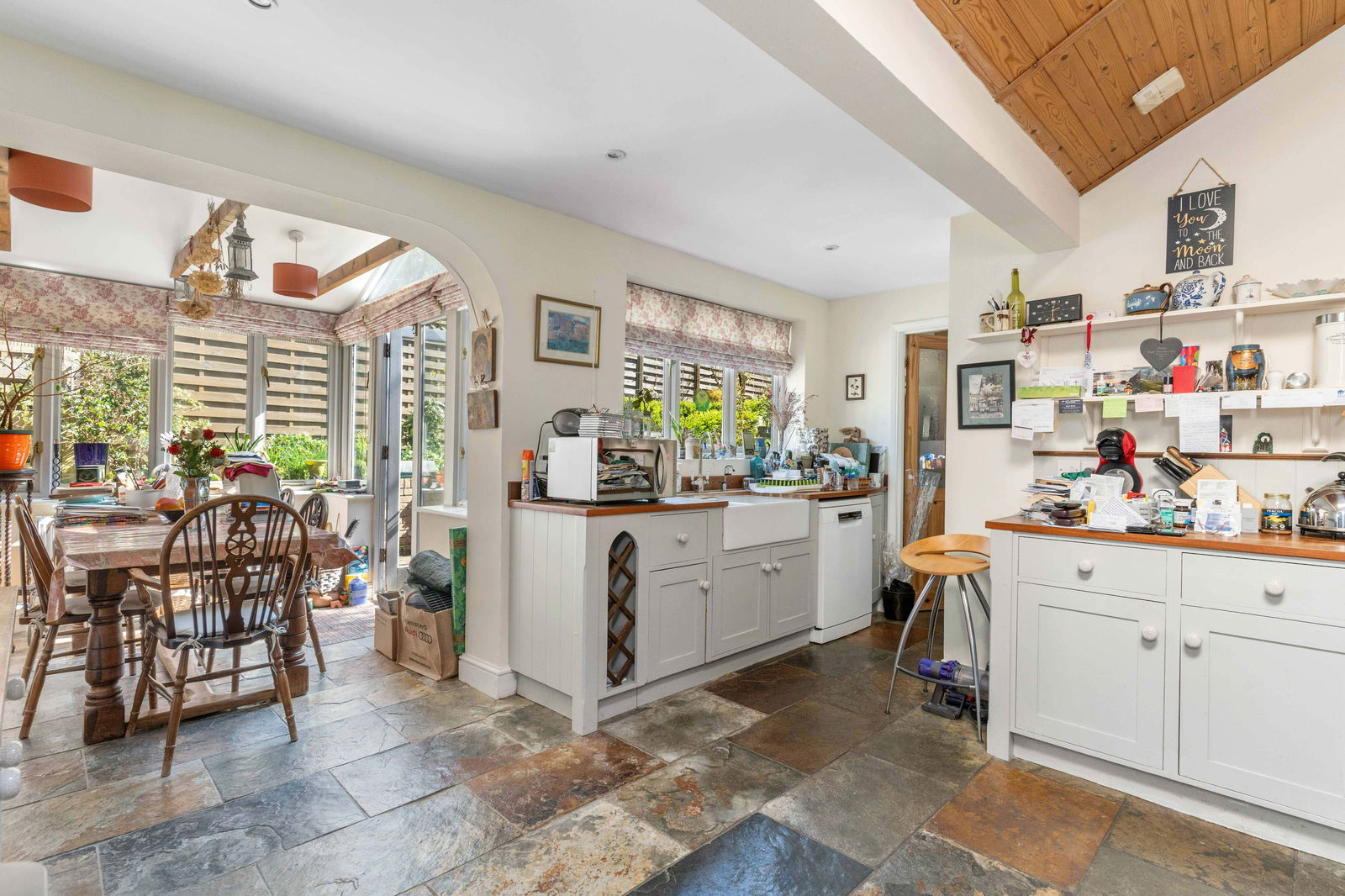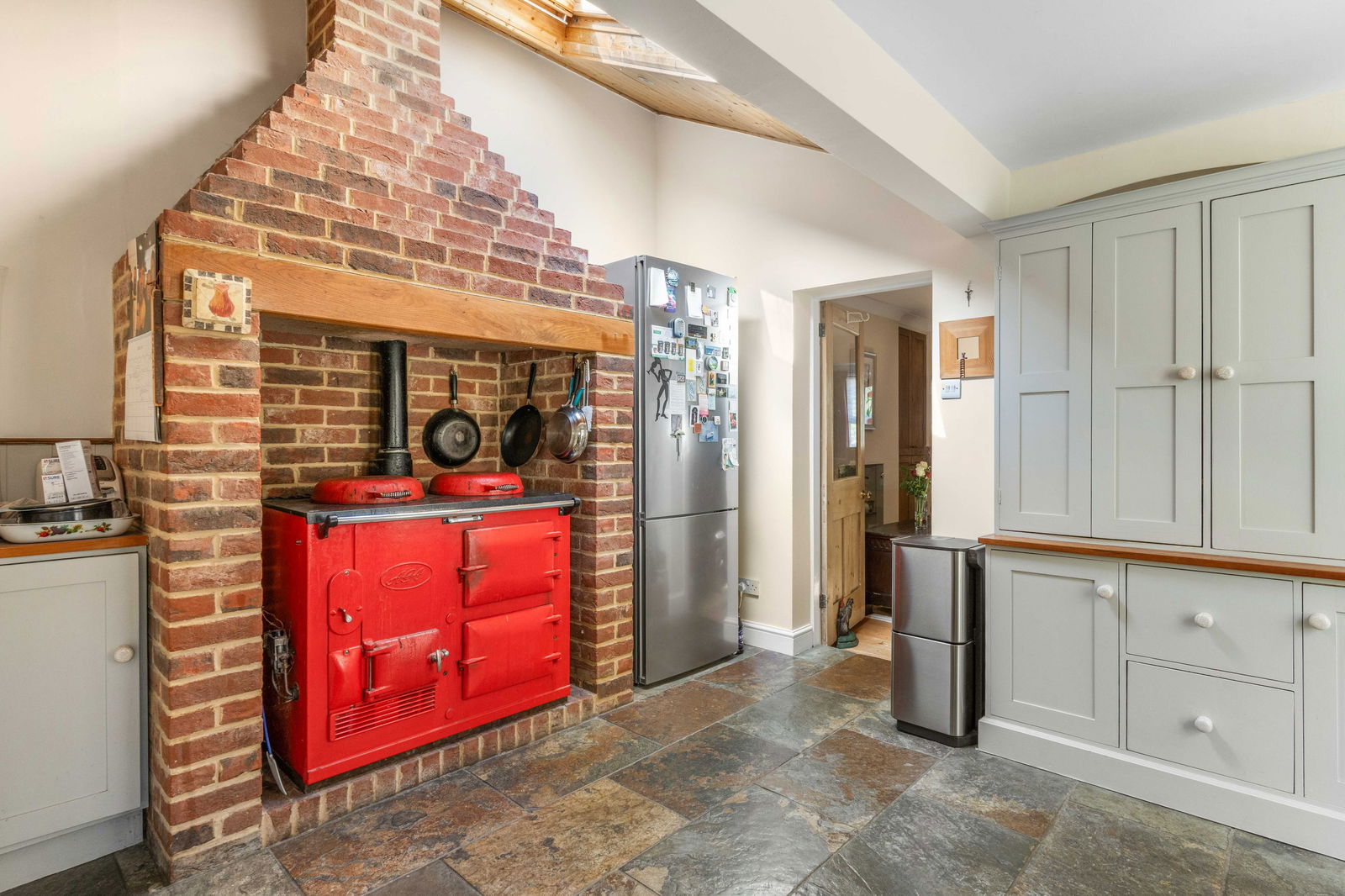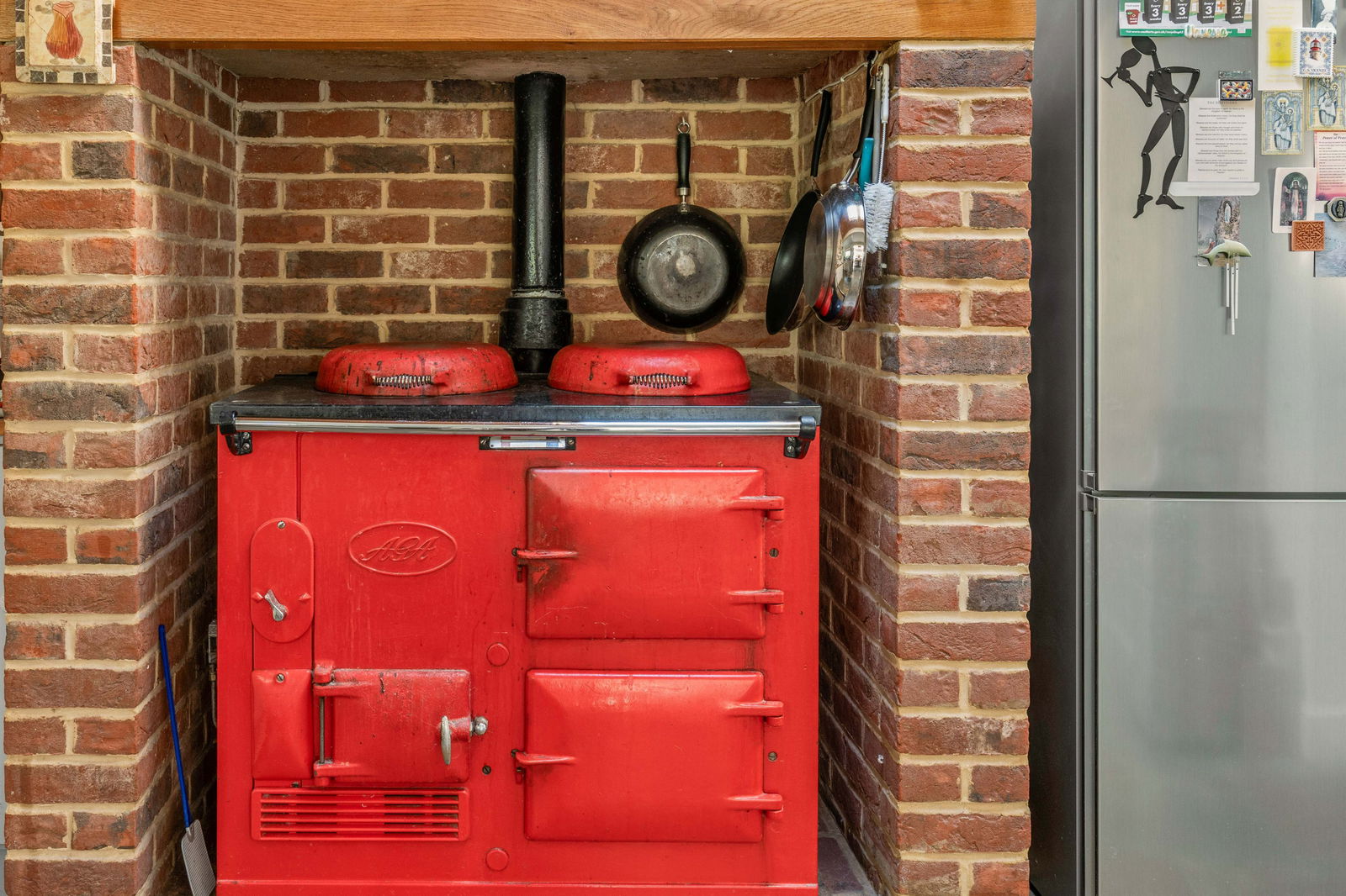 Entering through the wooden front door with glass panels and leaded colour rose detail into the open plan living room, with feature cast iron fireplace with ornate tiling and wooden surround. Wooden floorboards lead to the dining area with built in storage cabinets, coving and ceiling roses. The kitchen and breakfast room are spacious and light, the perfect entertaining space with feature brick chimney and aga making this home warm and cosy in the winter. There are French doors leading out to the garden and lobby area where once was a