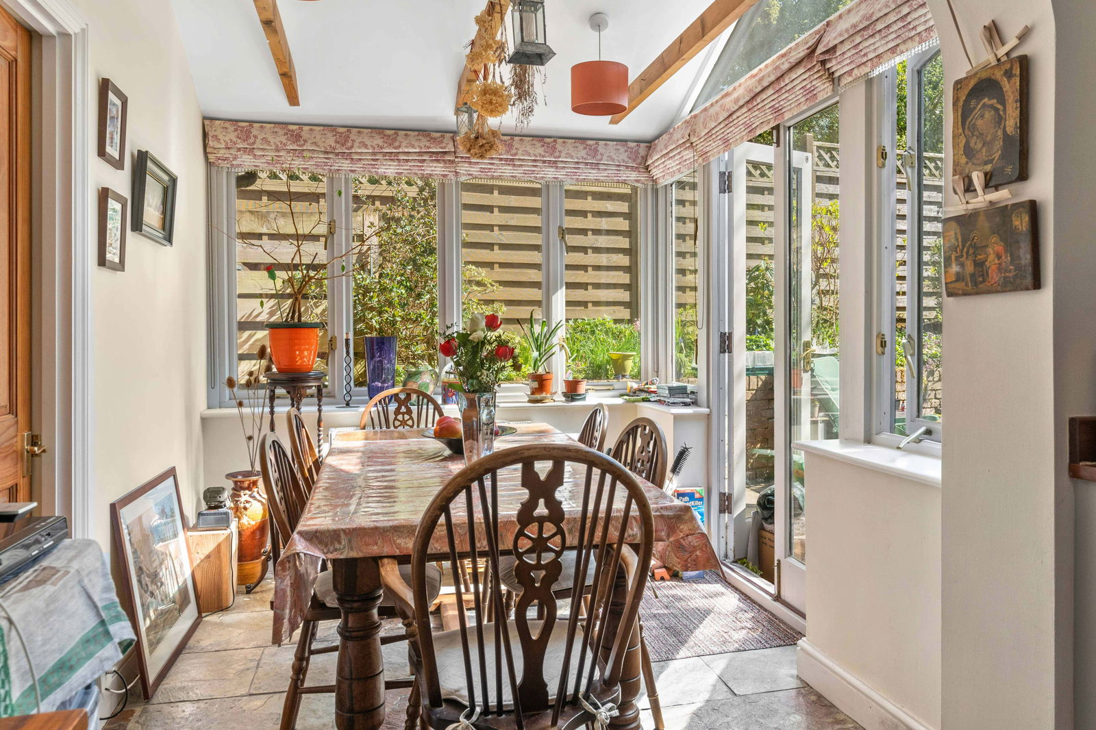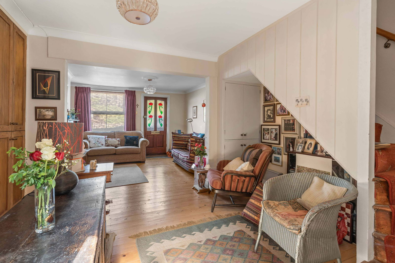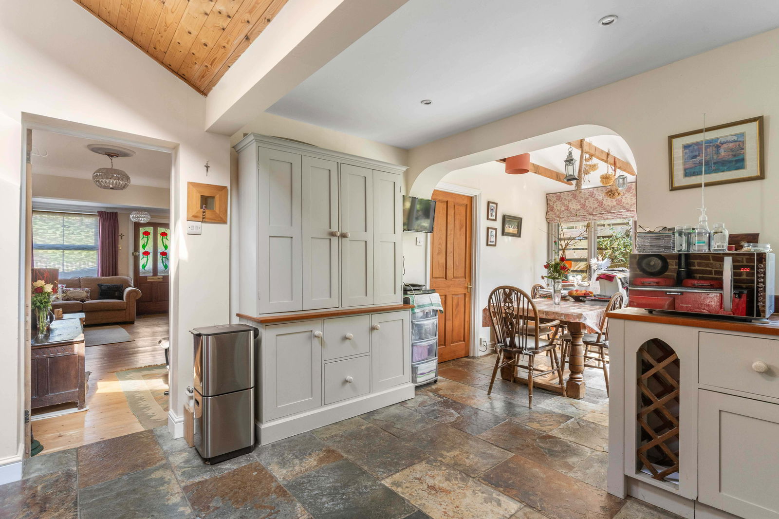 Entering through the wooden front door with glass panels and leaded colour rose detail into the open plan living room, with feature cast iron fireplace with ornate tiling and wooden surround. Wooden floorboards lead to the dining area with built in storage cabinets, coving and ceiling roses. The kitchen and breakfast room are spacious and light, the perfect entertaining space with feature brick chimney and aga making this home warm and cosy in the winter. There are French doors leading out to the garden and lobby area where once was a