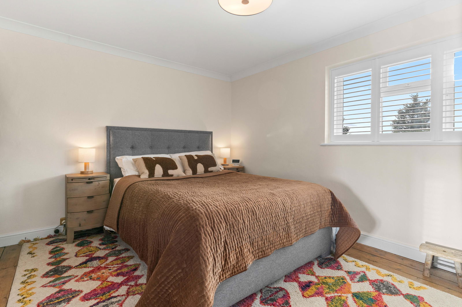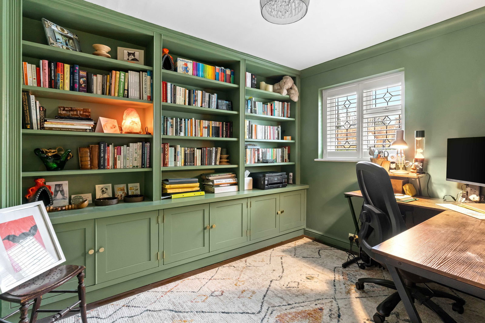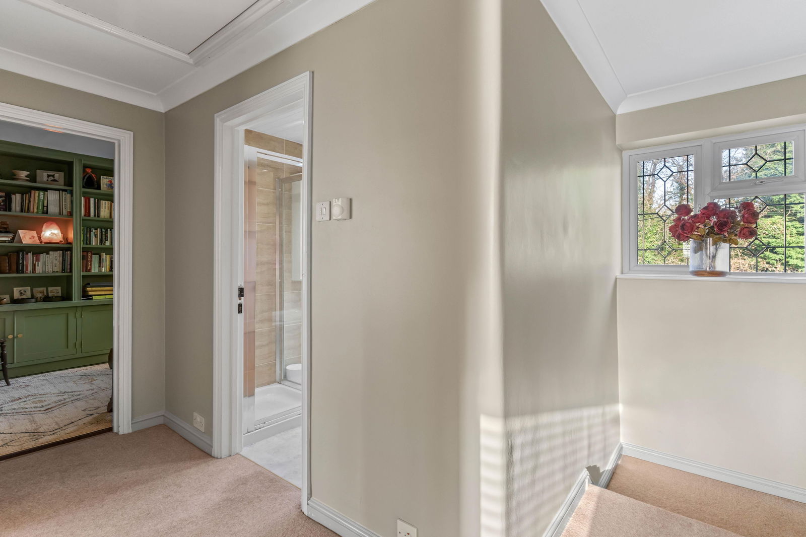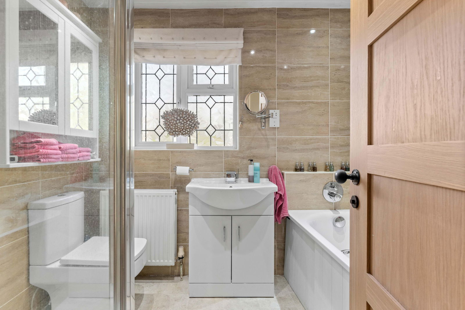 Moving upstairs, the first bedroom is carpeted, has a fitted dressing table and wardrobe with shelving and room for a double bed. The master bedroom also has bespoke fitted wardrobes giving you all the storage you need and, with the treated wooden floorboards, this room feels spacious and uncluttered. The third bedroom has been converted into a study with a beautiful bespoke shelving unit covering one wall. This room could still be reverted into a single bedroom with plenty of storage! The family bathroom sits perfectly between all three bedrooms, and offers a bath and separate shower. Outside on the landing there is access to the loft via a traditional hatch and loft ladder. This room has been boarded, carpeted, has electricity, lighting and heating so could easily be used as a den, or additional workspace. With the addition of dormer windows to give head height, this space also has the potential to be a fourth bedroom (subject to planning consent). All of the bedrooms at the rear of the property share views of distant London and, at night, the landscape is lit with the city lights, most prominent being The Shard.