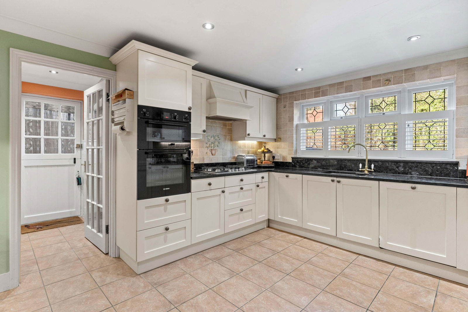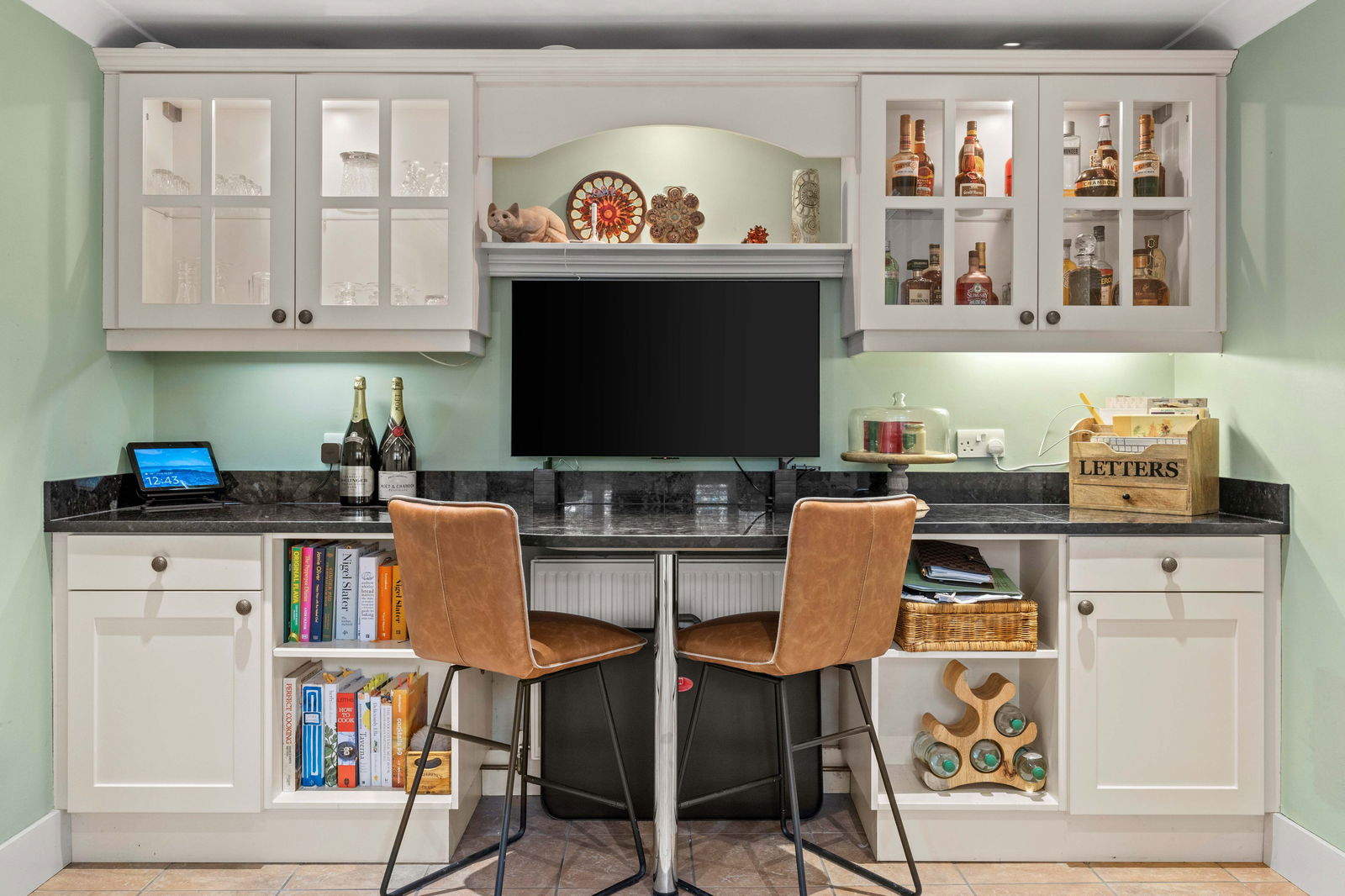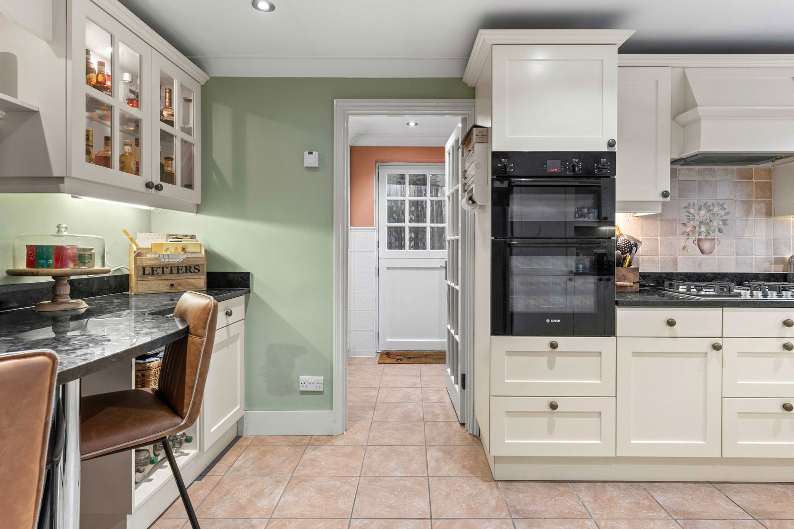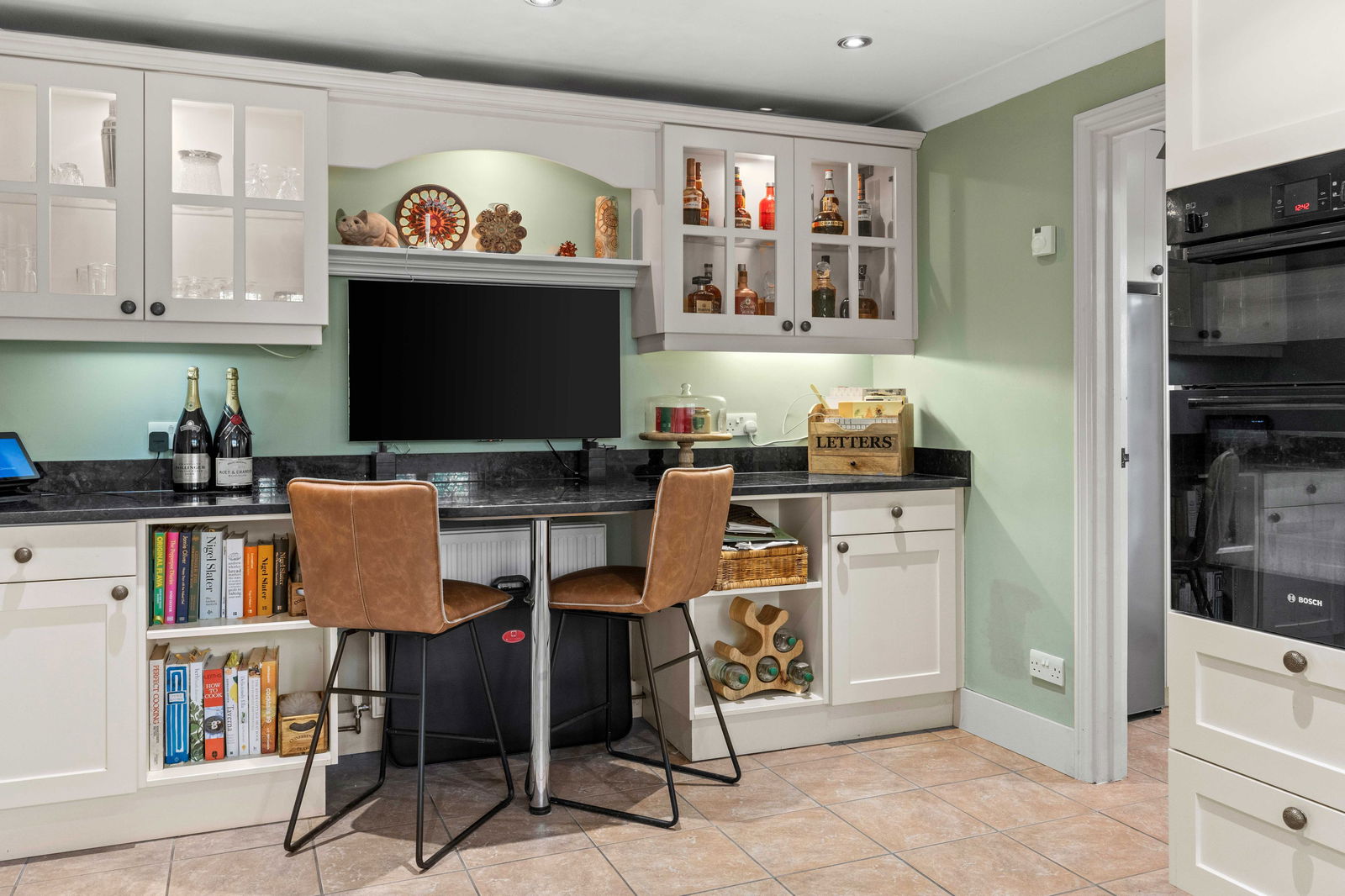 You are welcomed into a spacious hallway with room to hang coats and store shoes. The stained glass in the front door allows light to flood in. Moving through you find the kitchen on your right which looks out onto the driveway. This kitchen has everything you need and more! A full height larder cupboard, a drawer that stores a fold away ironing board and a double bin cupboard, it also offers display cabinets and under counter storage making the most of every inch! There is a fitted oven and grill, with gas hob as well as space for a dishwasher and full height fridge. On the back wall of the kitchen there is a breakfast bar which gives you handy day to day seating and a wall of fitted cupboards, which are a mix of open shelves and glass fronted display cabinets. Leading off from the kitchen you will find a utility room that has space for a full height freezer, a washing machine, tumble dryer and more storage. There is a downstairs cloakroom here too, and the backdoor gives access to the side of the house.
