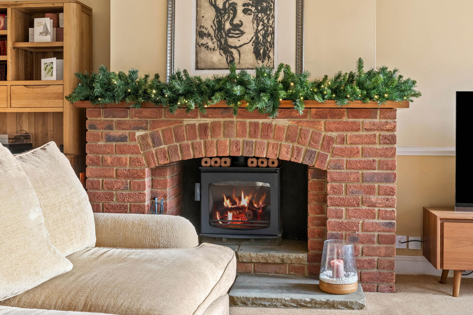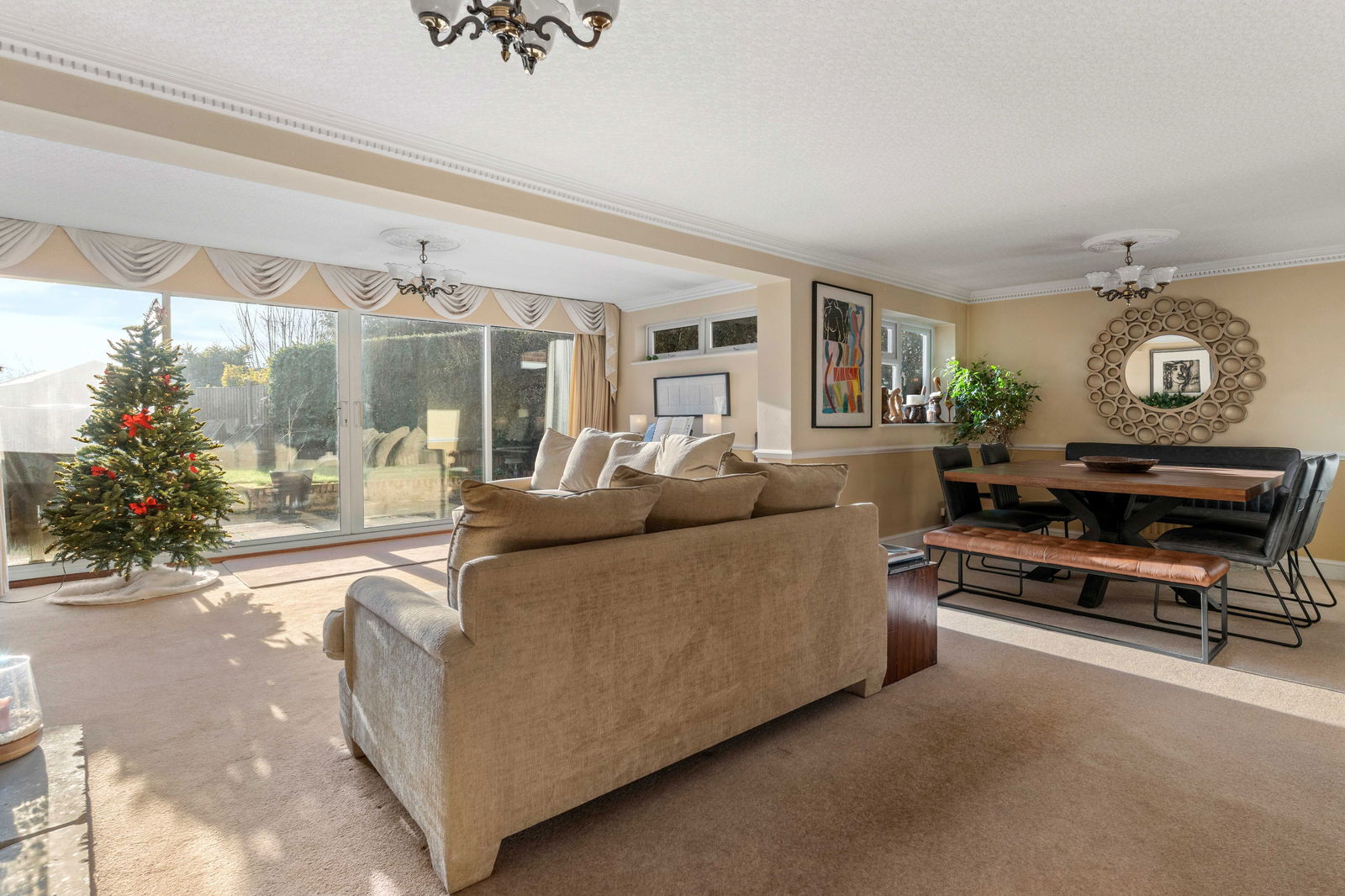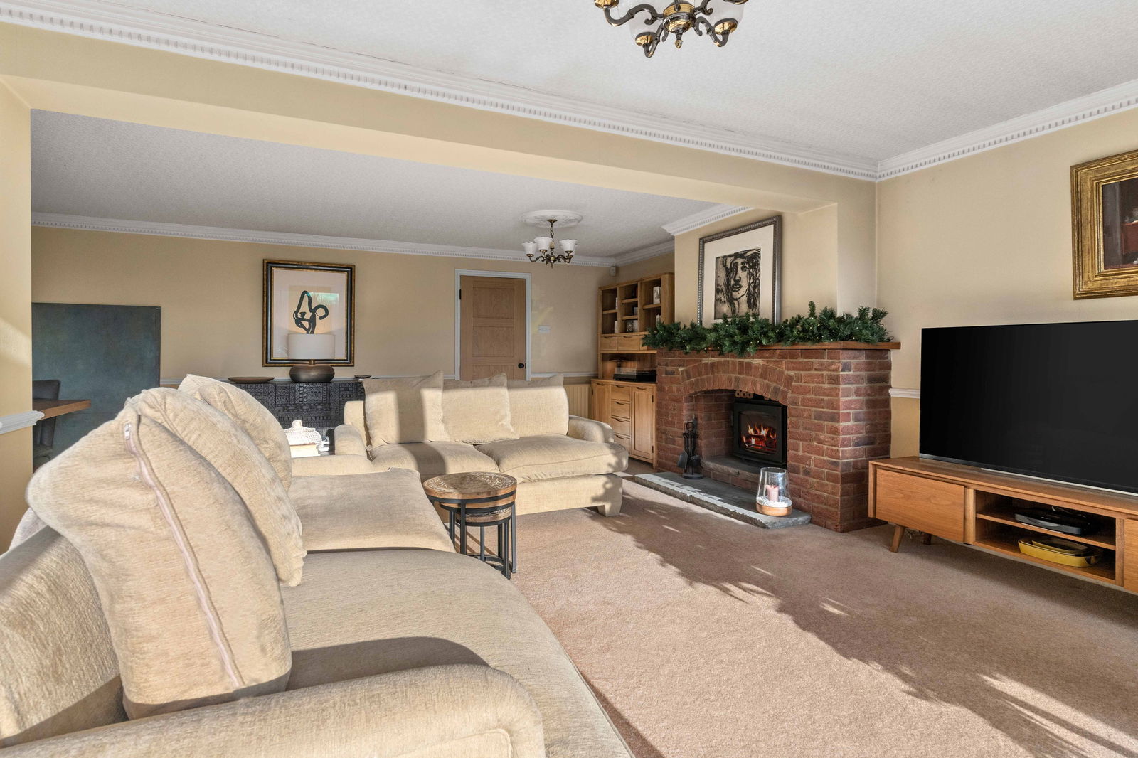 Coming back through the kitchen you enter the stunning lounge diner. This room has been decorated with warm, calming colours and with the substantial light coming in through the 5 metre wide patio doors, it feels like a big space which remains cosy and welcoming. Being a large L shaped room, it offers a place for a large dining room table and more than enough comfortable seating around the recently fitted wood burner. This room is flooded with light as it looks out onto the south facing garden.
