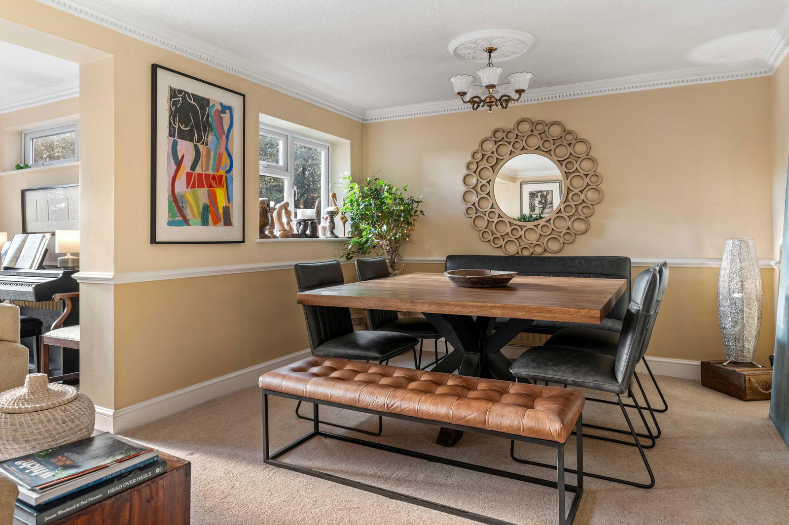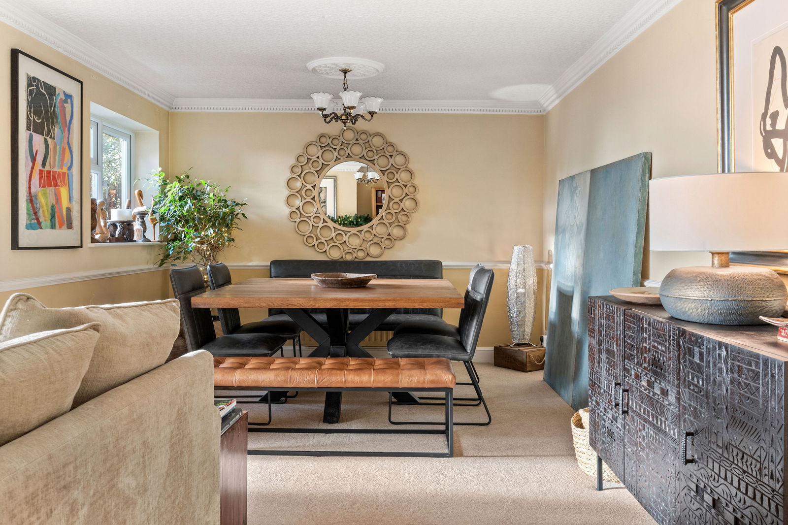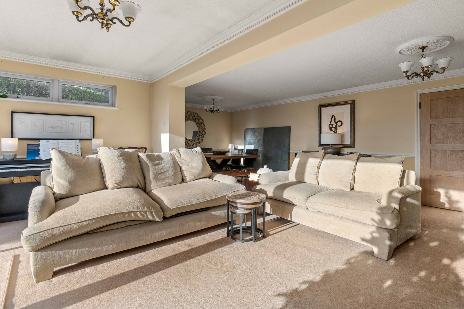 Coming back through the kitchen you enter the stunning lounge diner. This room has been decorated with warm, calming colours and with the substantial light coming in through the 5 metre wide patio doors, it feels like a big space which remains cosy and welcoming. Being a large L shaped room, it offers a place for a large dining room table and more than enough comfortable seating around the recently fitted wood burner. This room is flooded with light as it looks out onto the south facing garden.