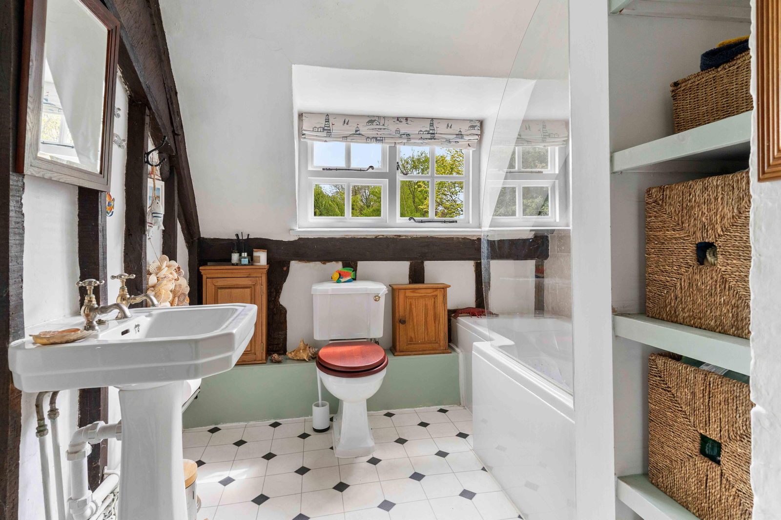 Set back off the lane the front door leads into the reception lobby which in turn opens into the impressive, very good size and charming living room. A spacious yet cosy room with a large red brick open fireplace and exposed ceiling timbers. At the rear is an excellent family/dining area with vaulted ceiling and French doors and windows that open into the garden. This room has a slightly contemporary feel and could easily be divided into two rooms if required. The real hub of the home is the farmhouse style kitchen/breakfast room, a lovely comfortable room in which to sit with family and friends . Fitted with a good range of units and enjoying an 'Esse' range cooker. Adjoining the kitchen is a useful utility room, off which is a downstairs cloakroom/WC.