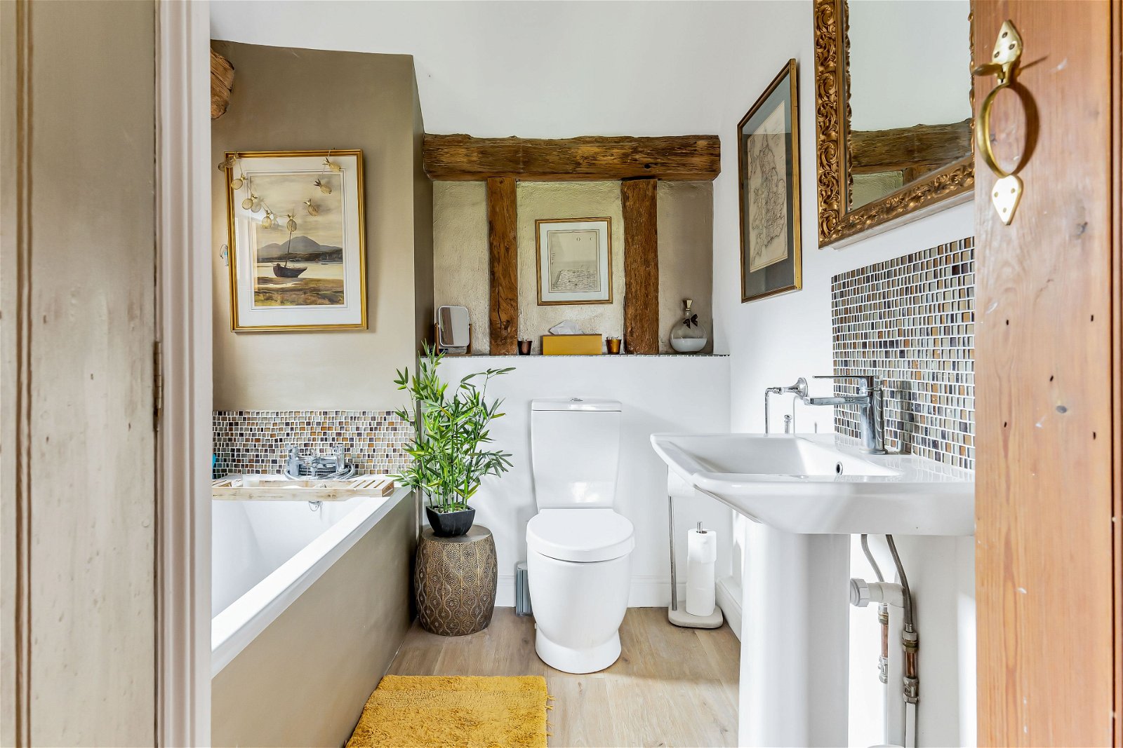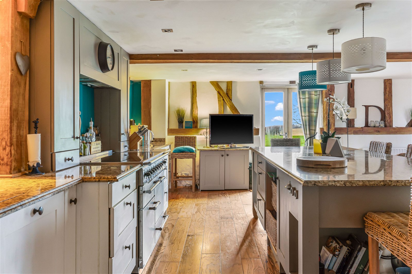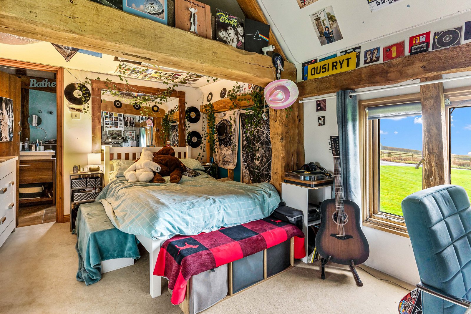 The garden enjoys a high degree of privacy and is approached via a five bar gate that leads into the driveway with parking for several vehicles. There are two patio areas, lawn, flower beds and shrubs. Just off the kitchen, French doors open onto the green and a small sitting area where one can take in the wonderful views over the surrounding countryside.