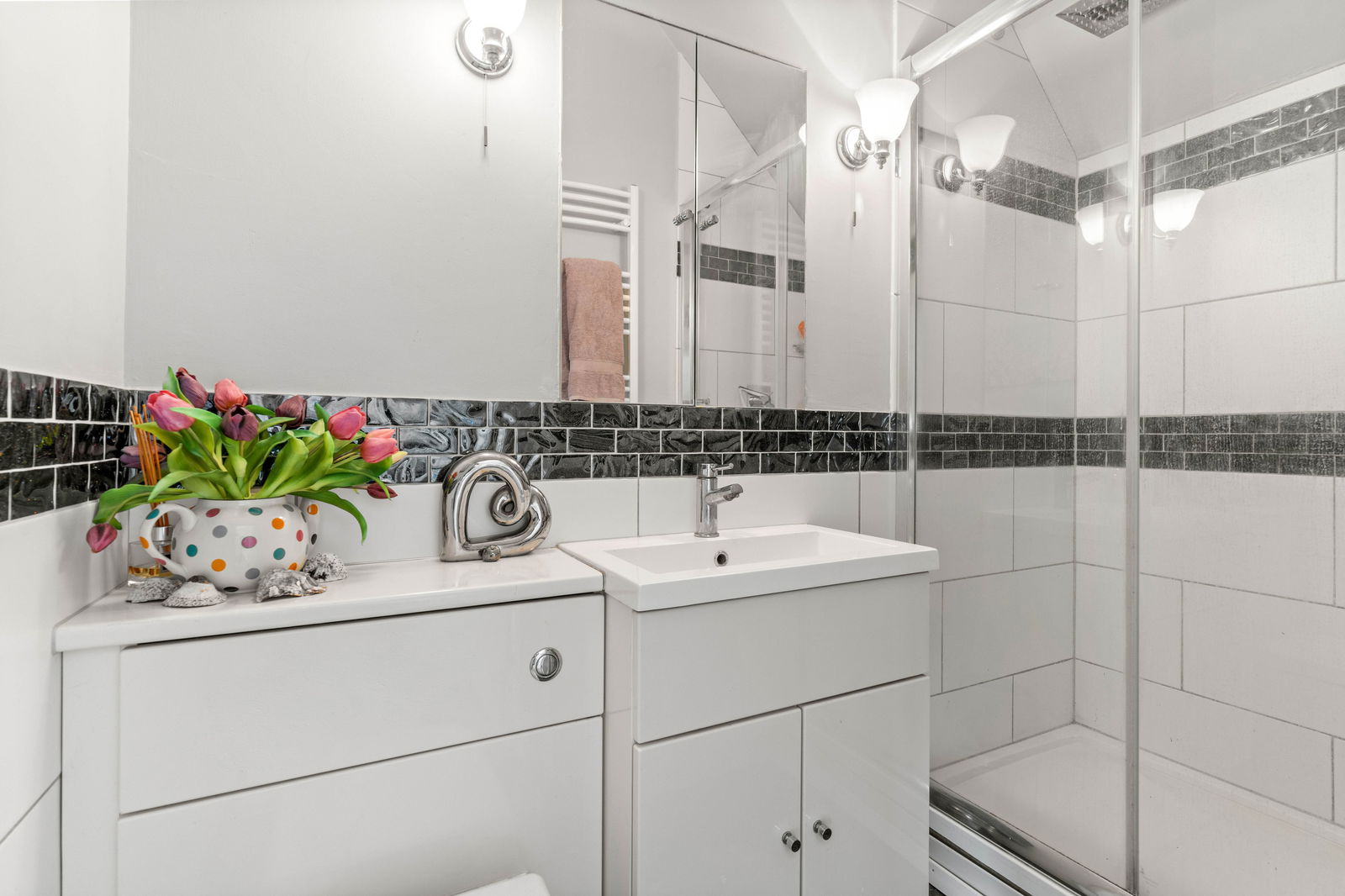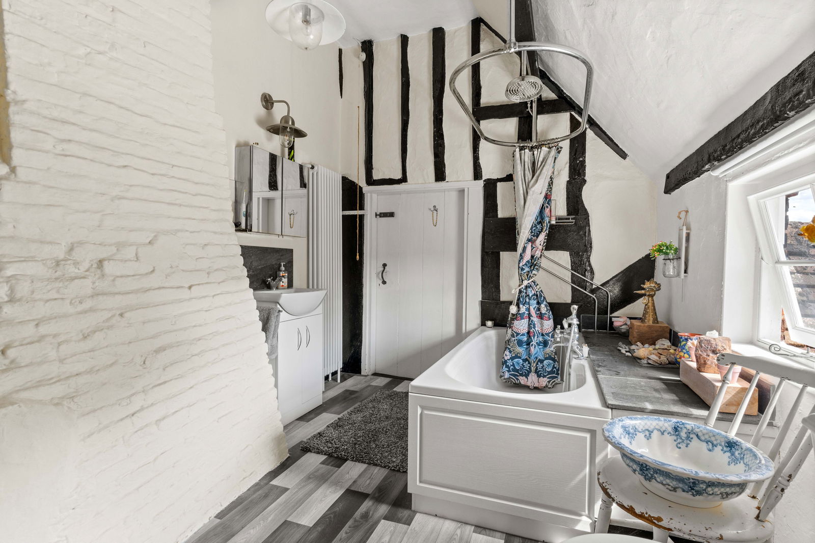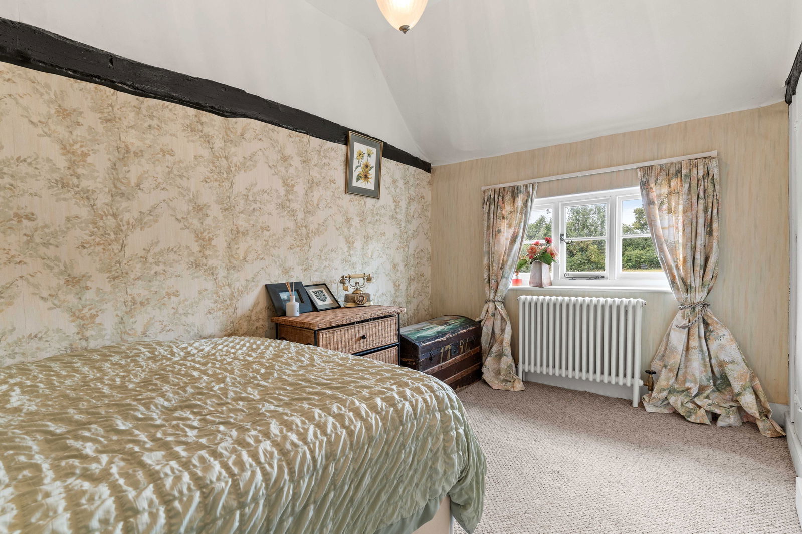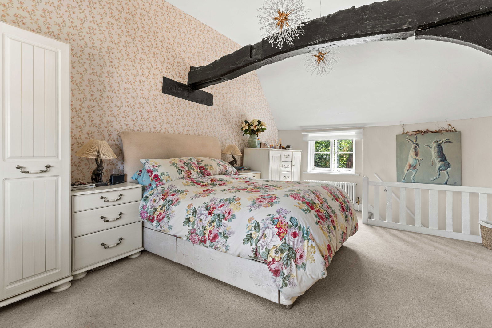Coming up the main stairs of the house, off the landing is the smallest of the bedrooms on the right, which is carpeted and has a fitted cupboard. Up one more step you find a deep cupboard which is a useful walk-in wardrobe, complete with a small window at the end. The corner room is a large double bedroom with beautiful character and fitted wardrobes. The middle bedroom overlooks the farmyard and again, has a fitted wardrobes. The next room is a ‘Jack & Jill’ family bathroom which is full of original features such as a painted brick chimney breast and exposed beams. There is a bath with shower above, a heated towel rail and another door which takes you into the master suite. This large bedroom has the most incredible original beam that spans from one side of the room to the other. There are views over the rear garden and the farmyard, making it light and airy. There is an en suite bathroom with shower and heated towel rail and a set of ‘back’ stairs that take you down to the entrance hall.