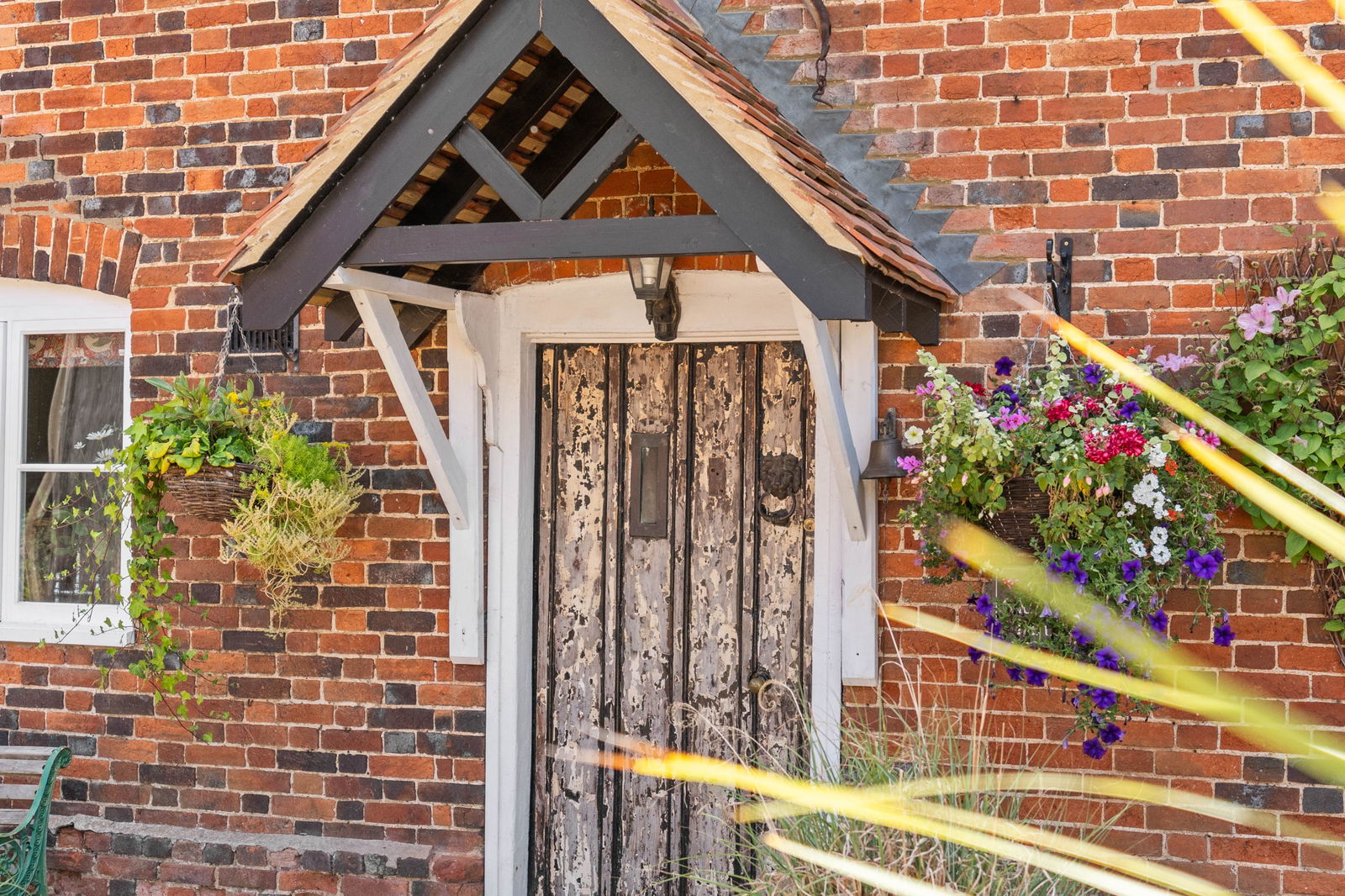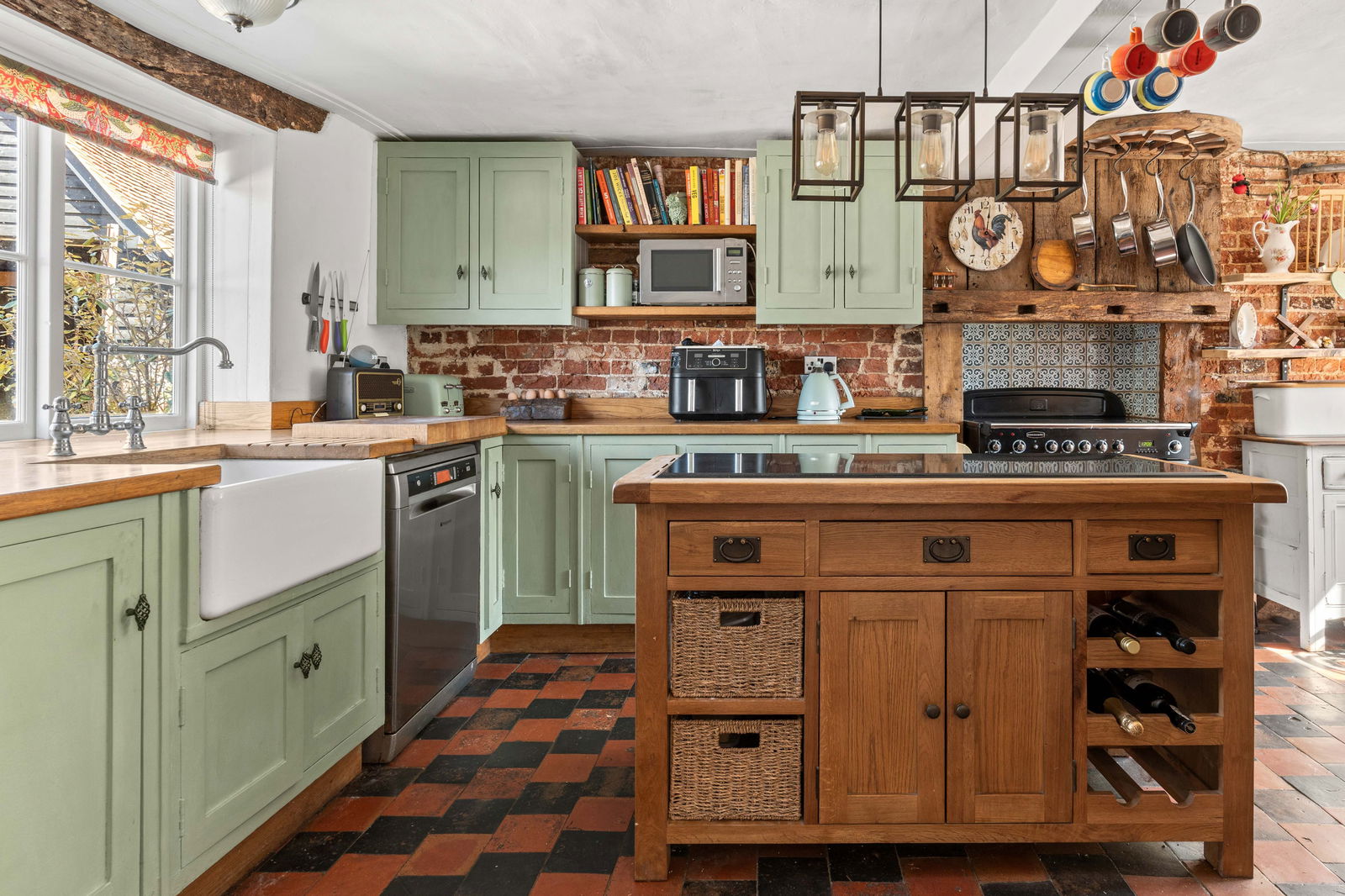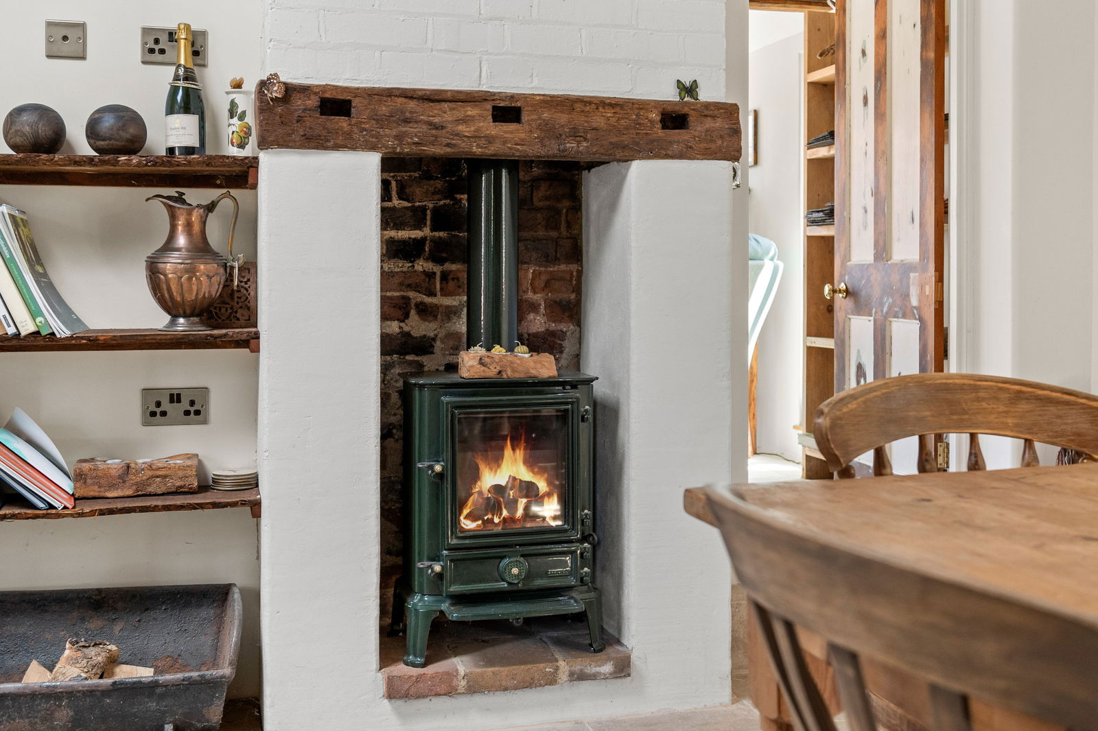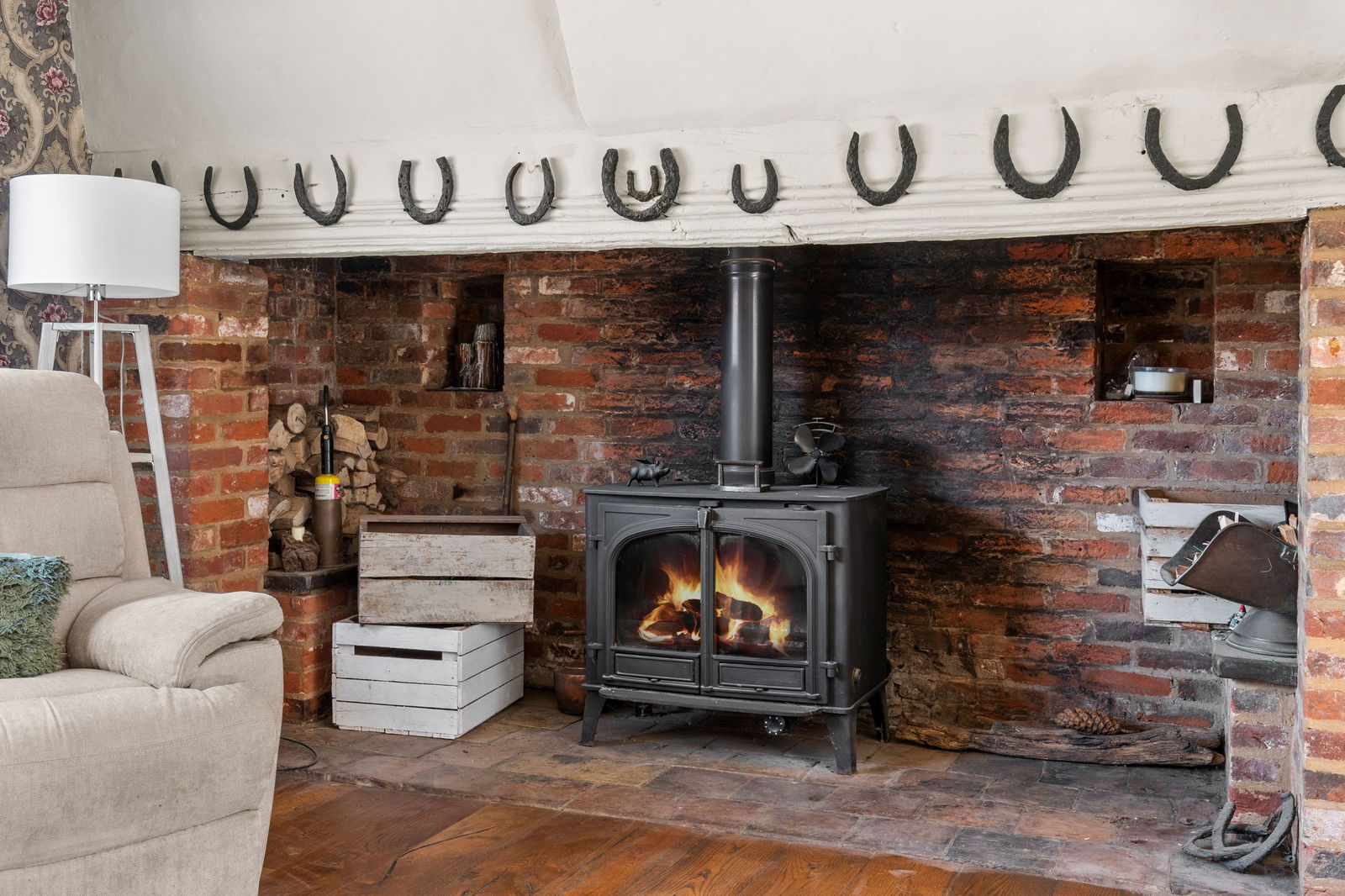 The front door to Old Ramridge Farmhouse is a stunning original wooden door which has been stripped back to reveal the history within the layers of paint. The effect is stylish and unique, setting the tone for this lovingly restored 400-year-old farmhouse. The terracotta and black quarry tiles are set in a diagonal pattern throughout the entrance hall and kitchen which feel traditional and practical for country life! The entrance hall stretches to the rear of the property where the back door opens to a patio area and garden and stained-glass in the part-glazed door lets in sunshine to this generously wide space. The kitchen is a quintessential ‘country kitchen’ with wooden worktops, a butler’s sink, Rangemaster oven in the chimney breast and a modest central island with pendant lighting above. There is a small seating area overlooking the garden, a large pantry cupboard and a walk-in larder. Moving across the hall to the first of the reception rooms, currently set up as a lounge, we find a large Inglenook fireplace with wood burner as the focal point of the room. The room has wooden floorboards and stunning original wall panelling as well as cast iron radiators and views over the farmyard and back garden. Planning permission was sought and approved to replace all the windows in the house with high quality wooden double glazing which provides insultation and warmth not usually found in a house of this age. The next room is set up as a study, but again, is a versatile space and has been used as a lounge and a formal dining room in the past! There is an ultrafast internet connection due to fibre optic cables running direct to the property. The stone fireplace with open fire adds period charm to this room and windows overlooking the front and side gardens make it light and airy.