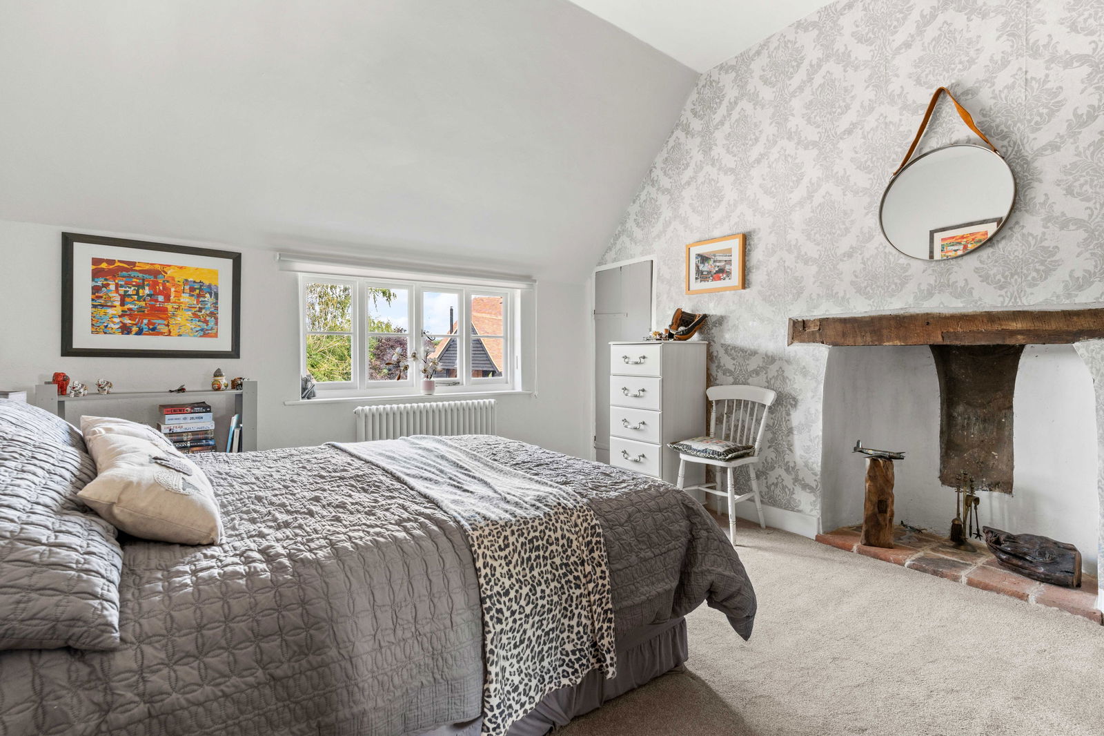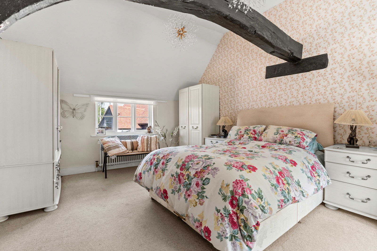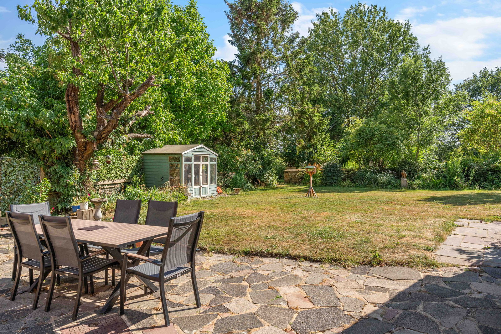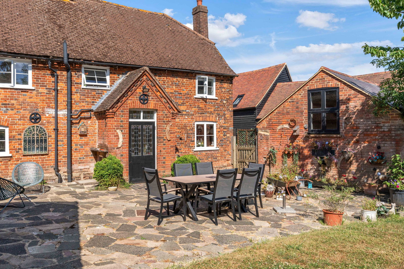 This area then leads to the bottom of the main stairs, but also to a back door onto the enclosed patio and a step up takes you into the rear section of the house, which was originally a connected barn. This whole space has been transformed and could easily provide separate living accommodation for a relative, visiting guests, an au pair or it would even work well a holiday let business as it also has its own entrance. The utility area has a cloakroom, a sink, stacked washing machine and tumble dryer, work surface and storage cupboards, making it a practical and useful room which could also be a small kitchen if required. Moving past another back door, you enter the stunning converted barn section of the property, where a full height gabled ceiling and gorgeous beams demonstrate the sympathetic restoration that this area has undergone. There is a small shower room and toilet off this room, a characterful wood burner and underfloor heating under the limestone tiled floor. Stepping up into the ‘Well Room’ this unique room has been centred around the 45m well that provides natural spring water from a Chilterns spring. This could be another (literally) untapped source of income as it has been tested and approved as water that could be sold to the public. Self-sufficiently, the family use it for their own supply (as well as being on the mains). The bright and sunny room itself has reinforced safety glass covering the well, which has a light fitted to showcase this unusual feature. The outside wall of the room is double glazed with floor to ceiling panes of glass, and a door opening out to the patio area. Again, this room could be a home office, a sunroom or (if using this area of the house as an annex) a bedroom.