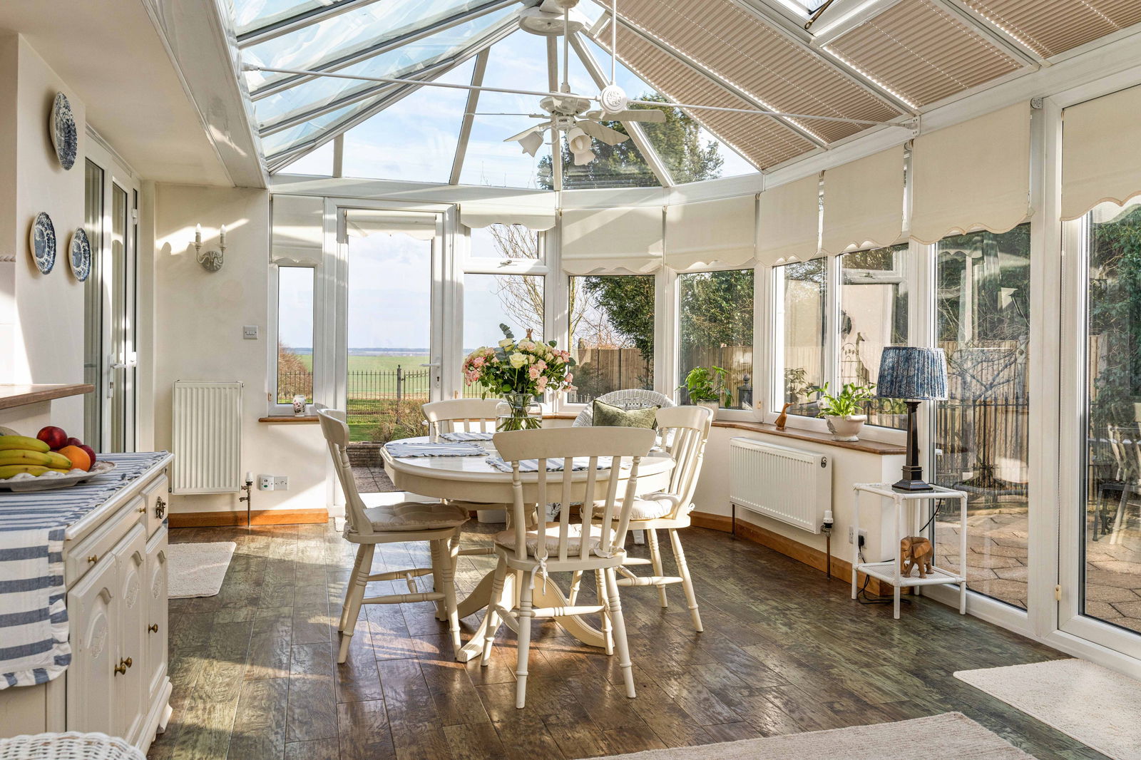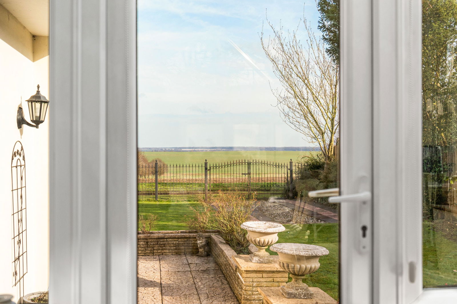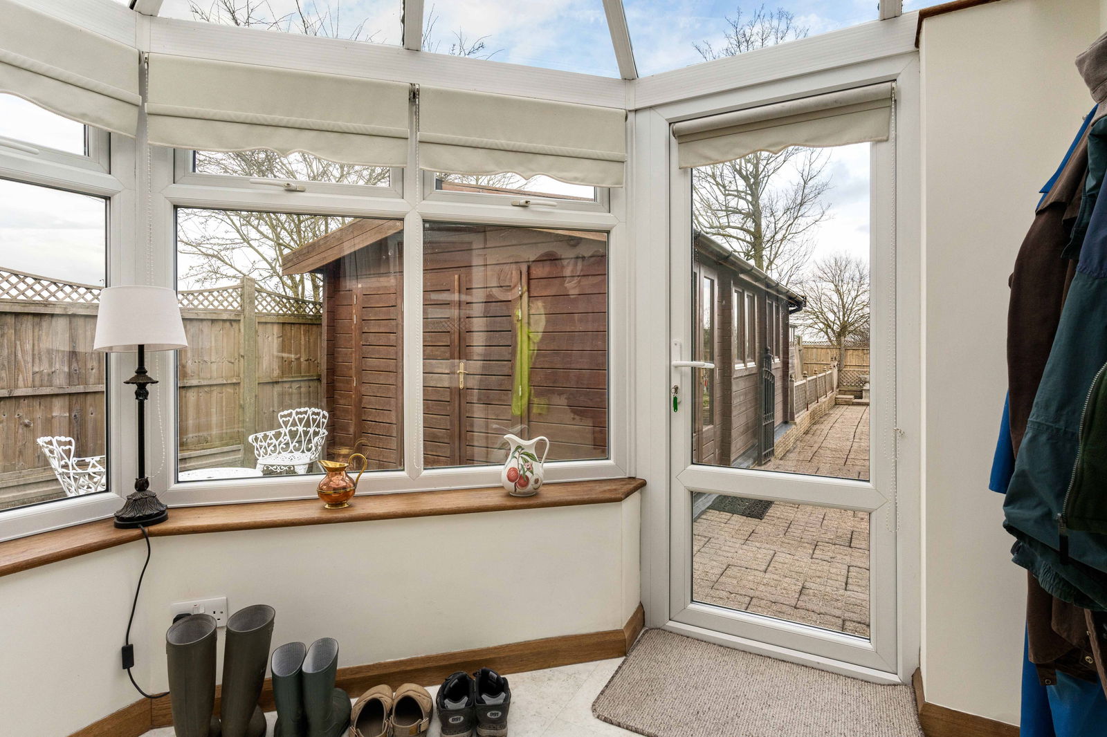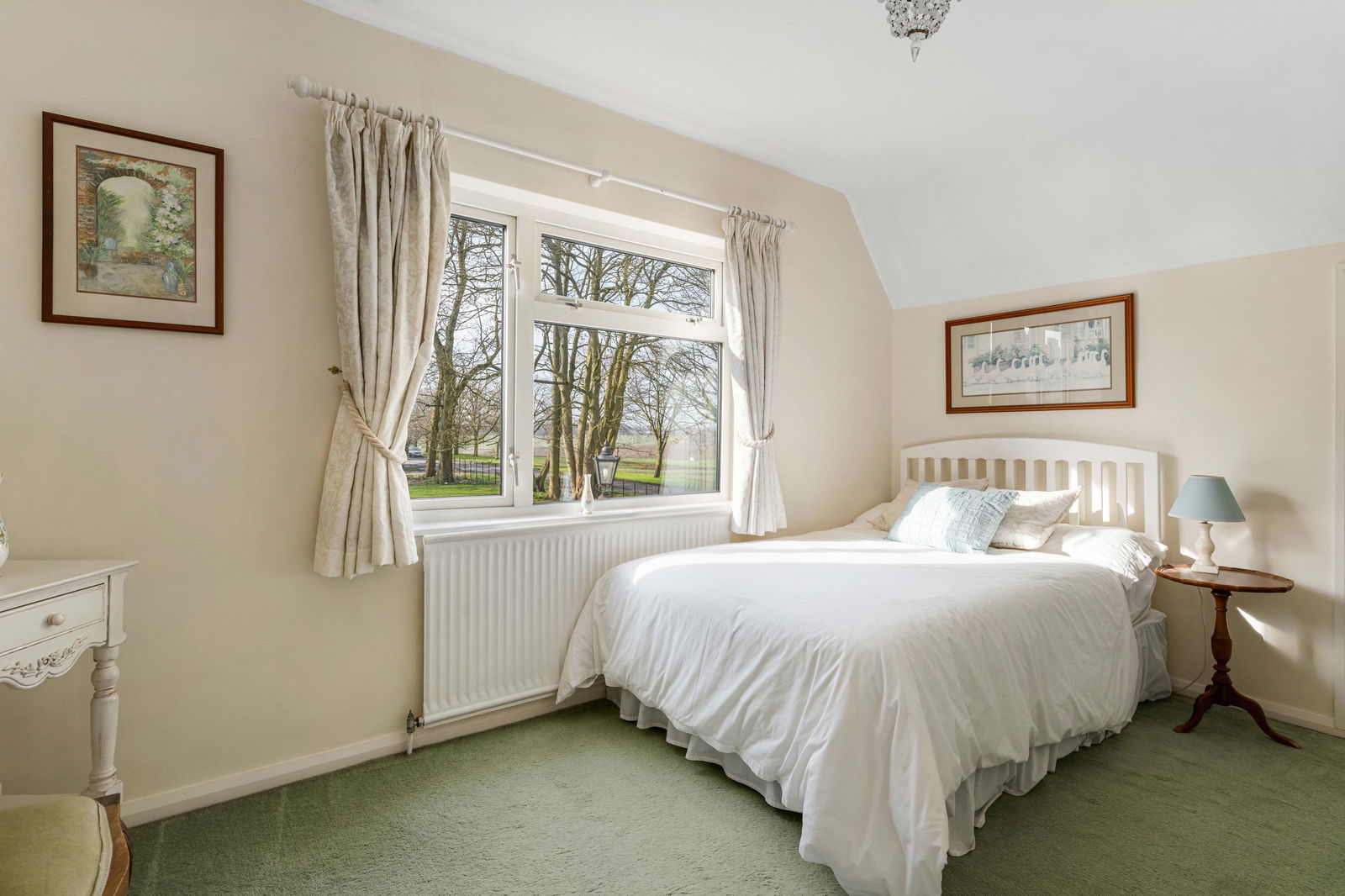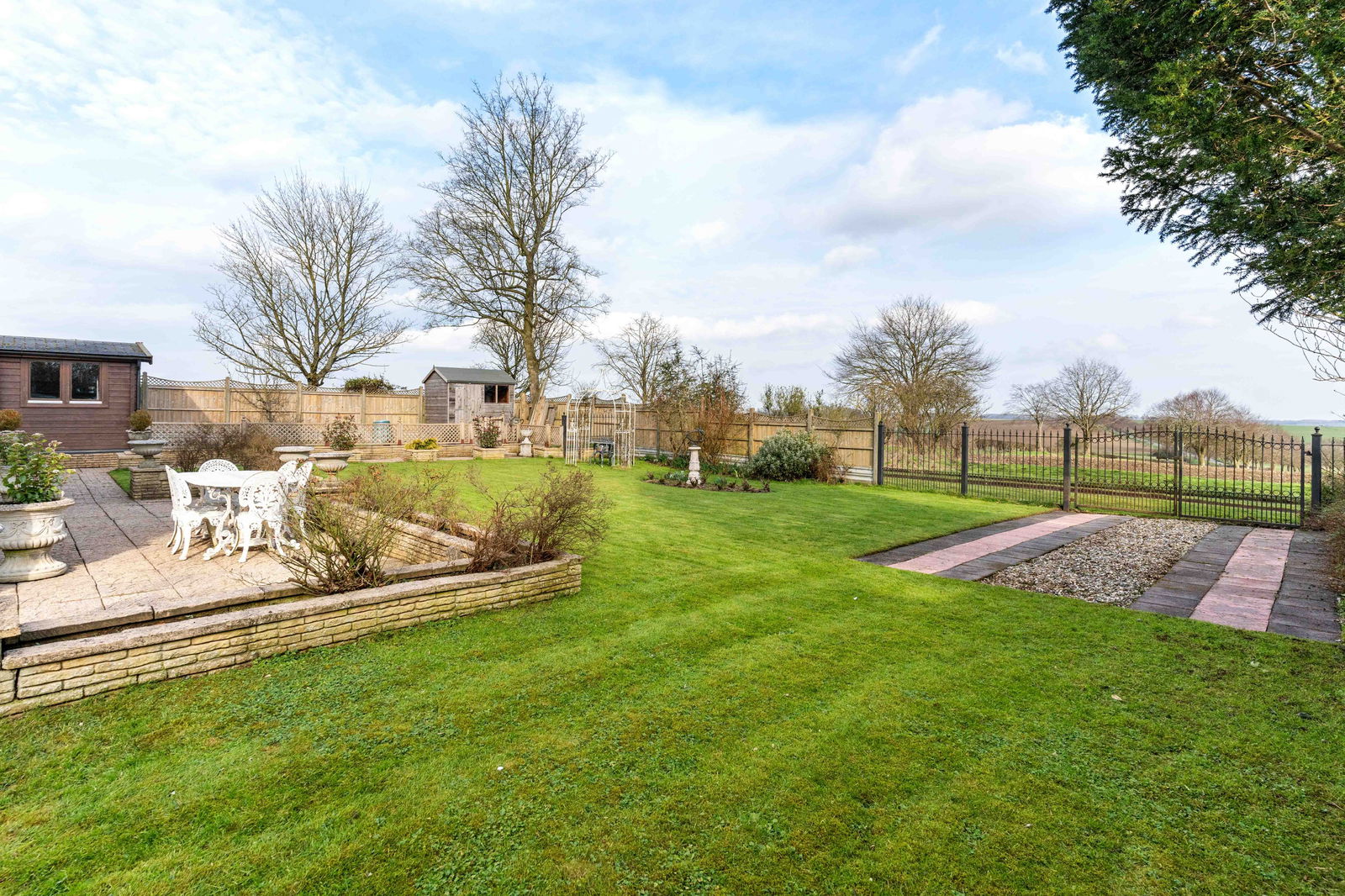 Hawthorns welcomes you with an incredibly light and spacious hallway; enough room to store everyone’s coats and shoes, the roof light is a super addition! This area leads off to the lounge, the kitchen and bedrooms. At the front of the house there are 3 rooms; a small study with a floor to ceiling window, a family bathroom with corner bath and the first of four bedrooms which is currently set up as a large study, all over-looking the front lawn and the beautiful trees opposite. The second downstairs double bedroom is at the rear of the house, with fitted wardrobes and views of the back garden, it’s a lovely sunny space. The utility area with sink, washing machine and tumble dryer leads to the back porch which has plenty of room for outdoor coats and boots. The double glazed door opens to the single garage where you find the boiler, lots of shelving for storage and space for a car. Back into the centre of the house to the the hub of the home; the kitchen. It has plenty of wall and under counter units, a built in double oven with hob and offers many possibilities to reconfigure. It has been enhanced by opening up the window to the large conservatory which is used as a dining area with comfortable seating. This conservatory is heated and very much feels part of the house, offering a fantastically versatile space to use throughout the year. It has double doors and a single door leading out to the patio and garden. Moving back into the main house, there is a formal dining area, making the most of the open plan layout, and 3 steps down takes you into the generous lounge. This large, light filled room is a natural entertaining space, with a fantastic set of patio doors overlooking the garden and views of the fields beyond. From the dining area, the open staircase leads you up onto a small landing. Overlooking the front garden, there is a double bedroom with built in wardrobes. The large family bathroom offers more views over the open fields towards Royston, and has a separate shower and bath. The largest bedroom is at the back of the house, with large windows offering views of the garden and farmland beyond.