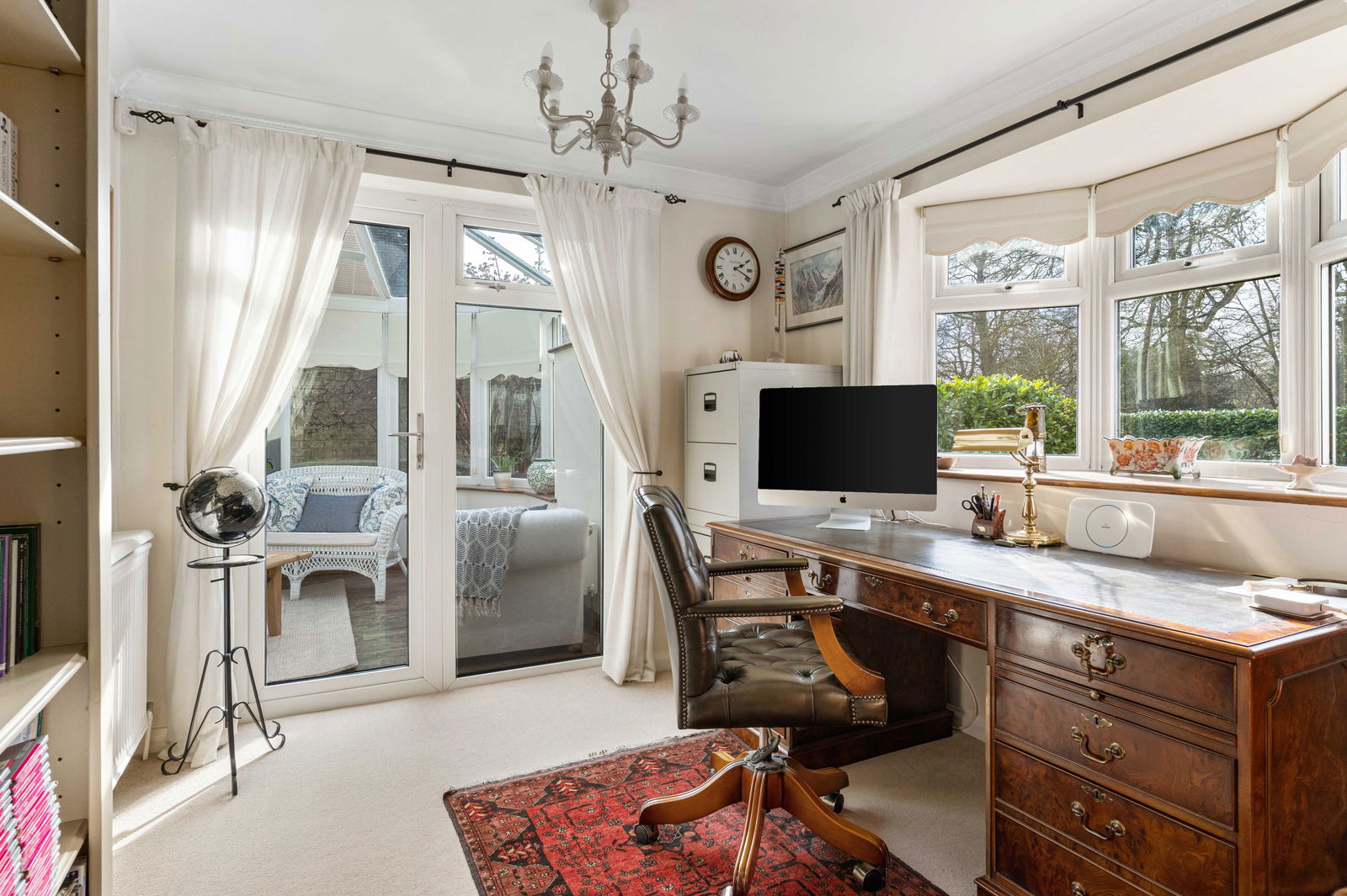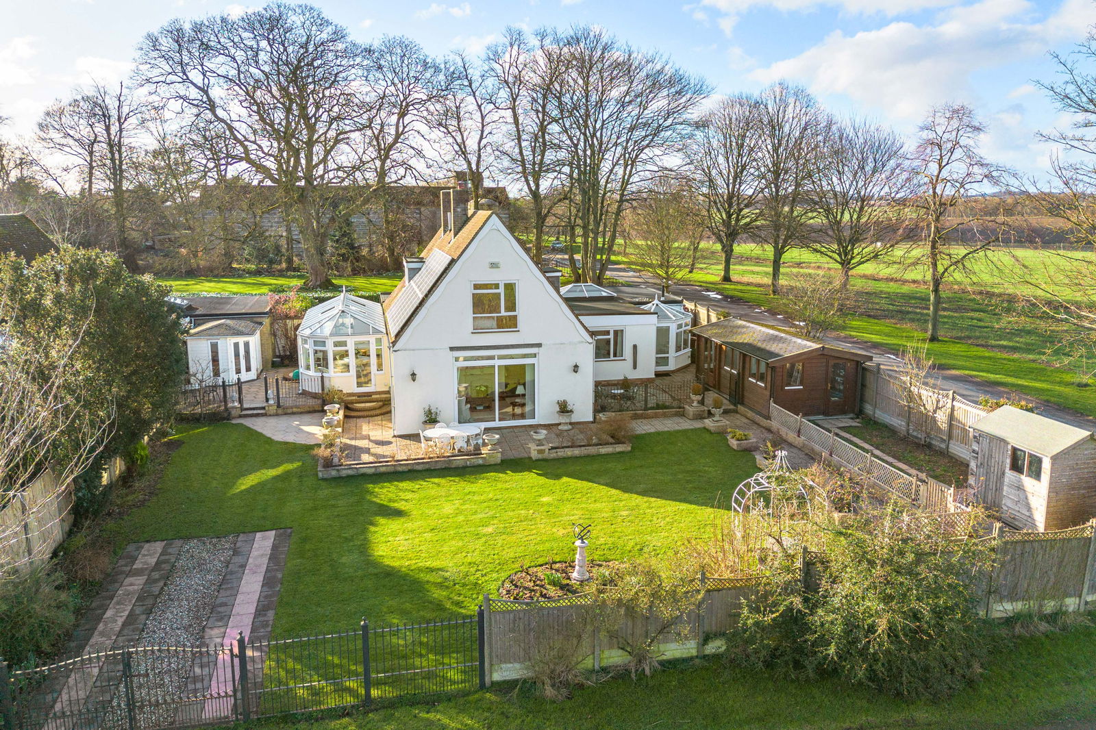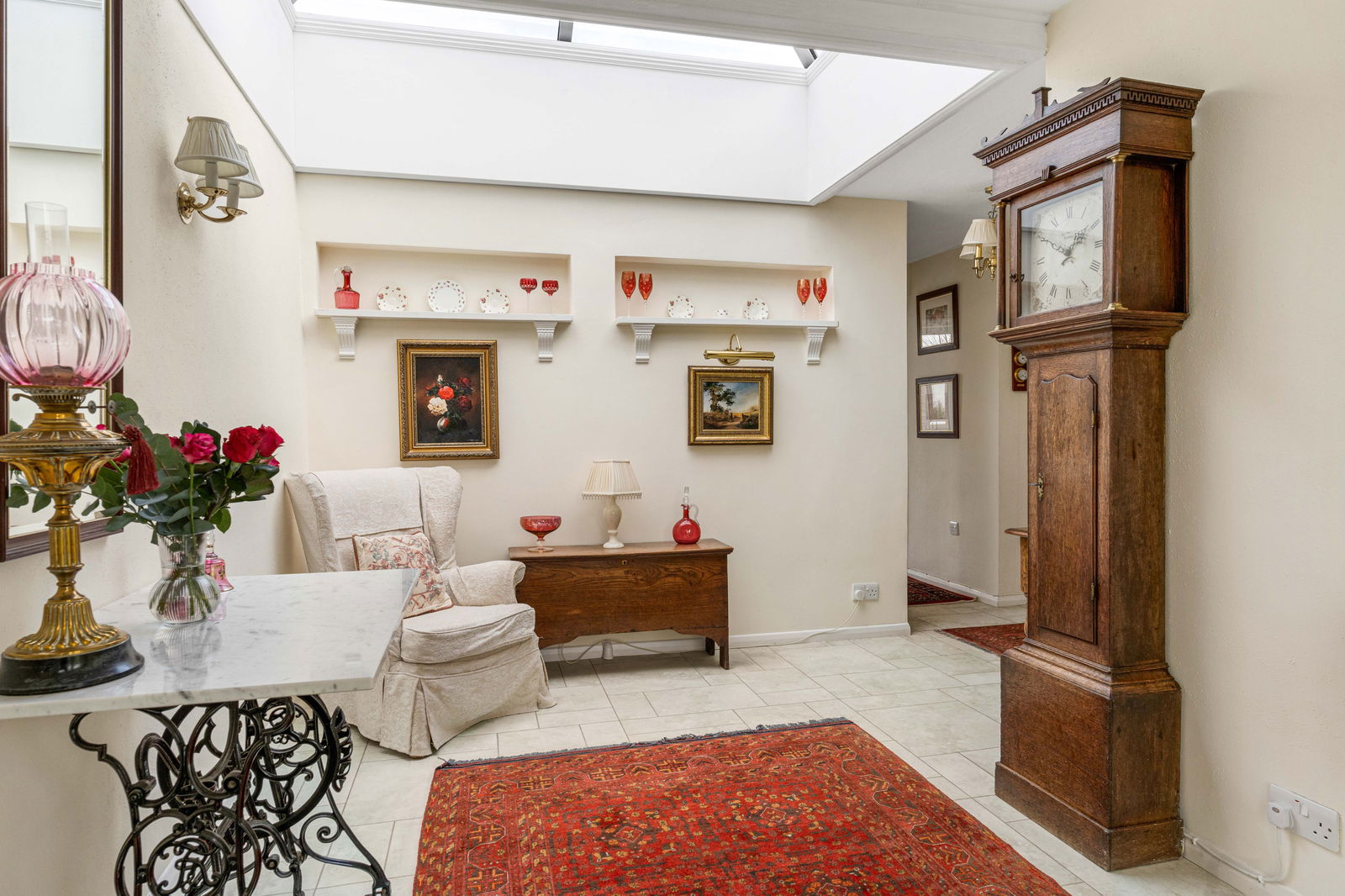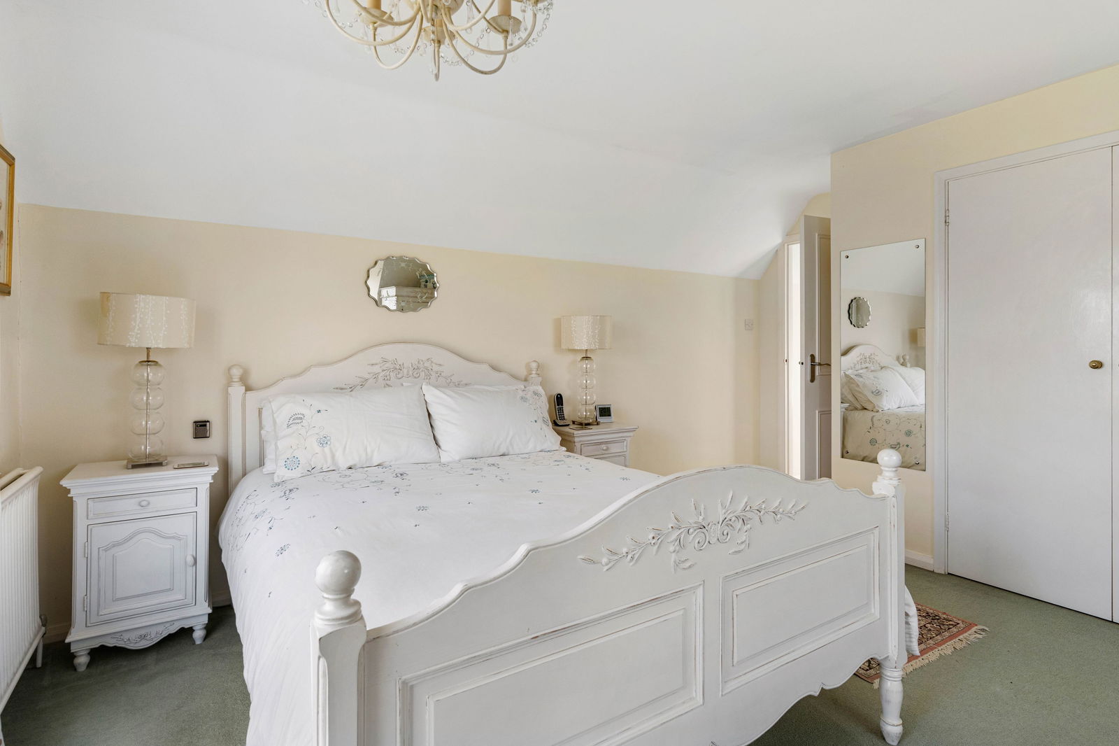 Hawthorns welcomes you with an incredibly light and spacious hallway; enough room to store everyone’s coats and shoes, the roof light is a super addition! This area leads off to the lounge, the kitchen and bedrooms. At the front of the house there are 3 rooms; a small study with a floor to ceiling window, a family bathroom with corner bath and the first of four bedrooms which is currently set up as a large study, all over-looking the front lawn and the beautiful trees opposite. The second downstairs double bedroom is at the rear of the house, with fitted wardrobes and views of the back garden, it’s a lovely sunny space. The utility area with sink, washing machine and tumble dryer leads to the back porch which has plenty of room for outdoor coats and boots. The double glazed door opens to the single garage where you find the boiler, lots of shelving for storage and space for a car. Back into the centre of the house to the the hub of the home; the kitchen. It has plenty of wall and under counter units, a built in double oven with hob and offers many possibilities to reconfigure. It has been enhanced by opening up the window to the large conservatory which is used as a dining area with comfortable seating. This conservatory is heated and very much feels part of the house, offering a fantastically versatile space to use throughout the year. It has double doors and a single door leading out to the patio and garden. Moving back into the main house, there is a formal dining area, making the most of the open plan layout, and 3 steps down takes you into the generous lounge. This large, light filled room is a natural entertaining space, with a fantastic set of patio doors overlooking the garden and views of the fields beyond. From the dining area, the open staircase leads you up onto a small landing. Overlooking the front garden, there is a double bedroom with built in wardrobes. The large family bathroom offers more views over the open fields towards Royston, and has a separate shower and bath. The largest bedroom is at the back of the house, with large windows offering views of the garden and farmland beyond.