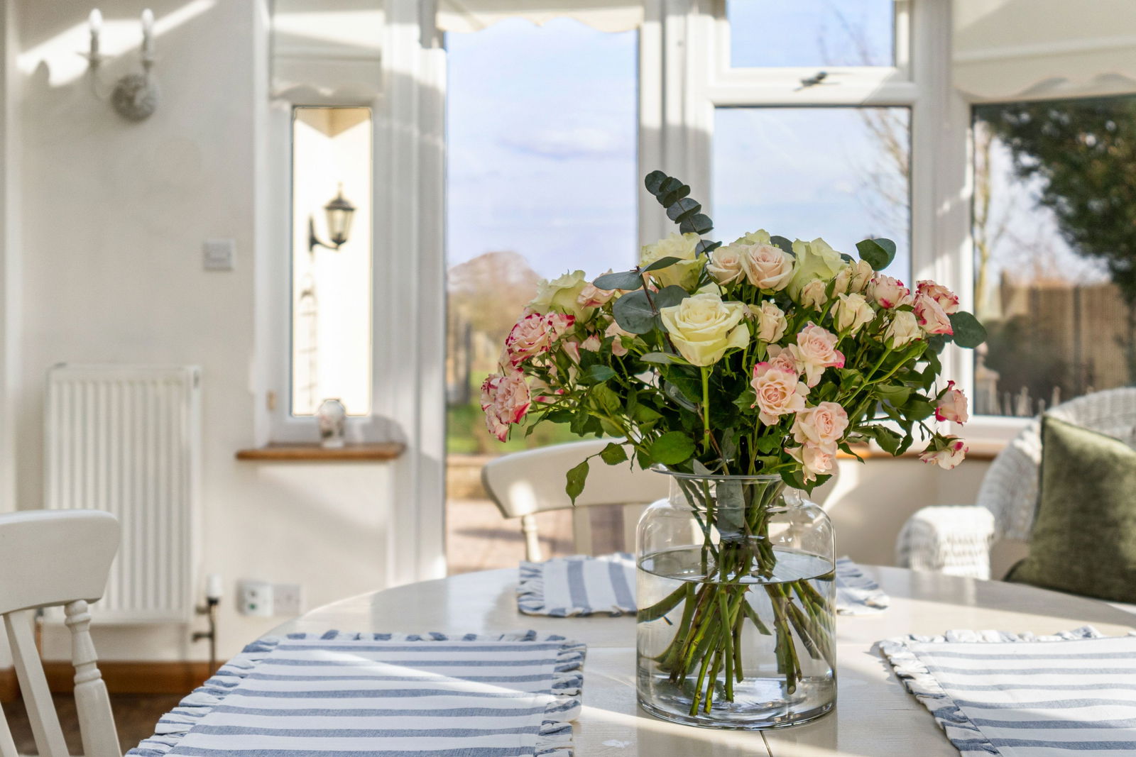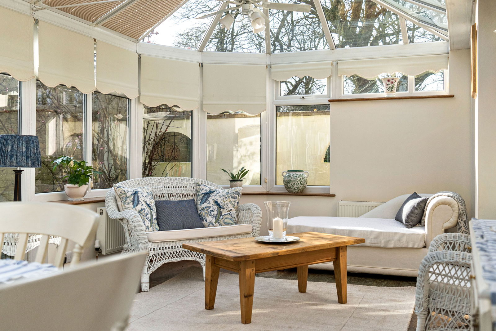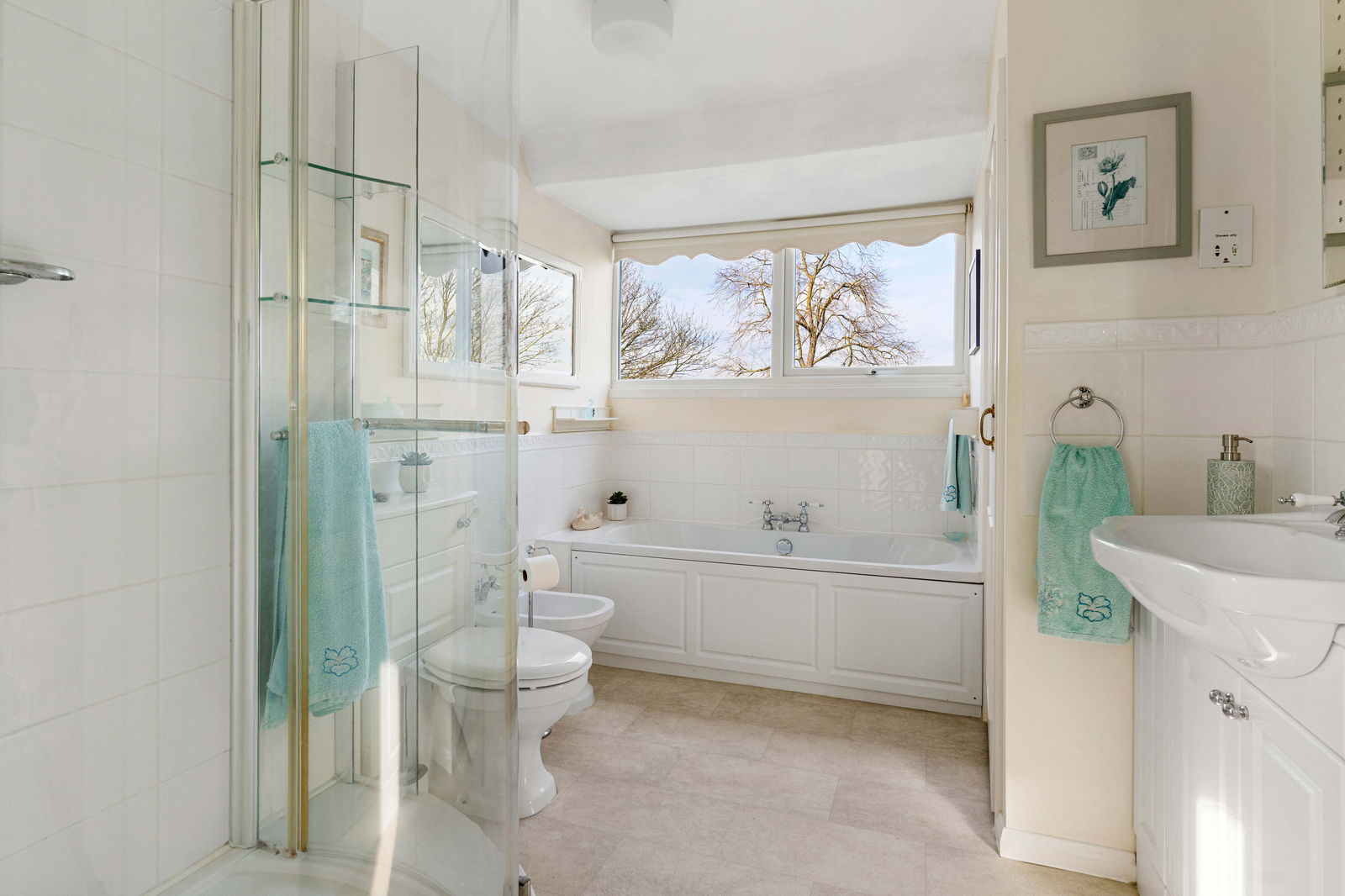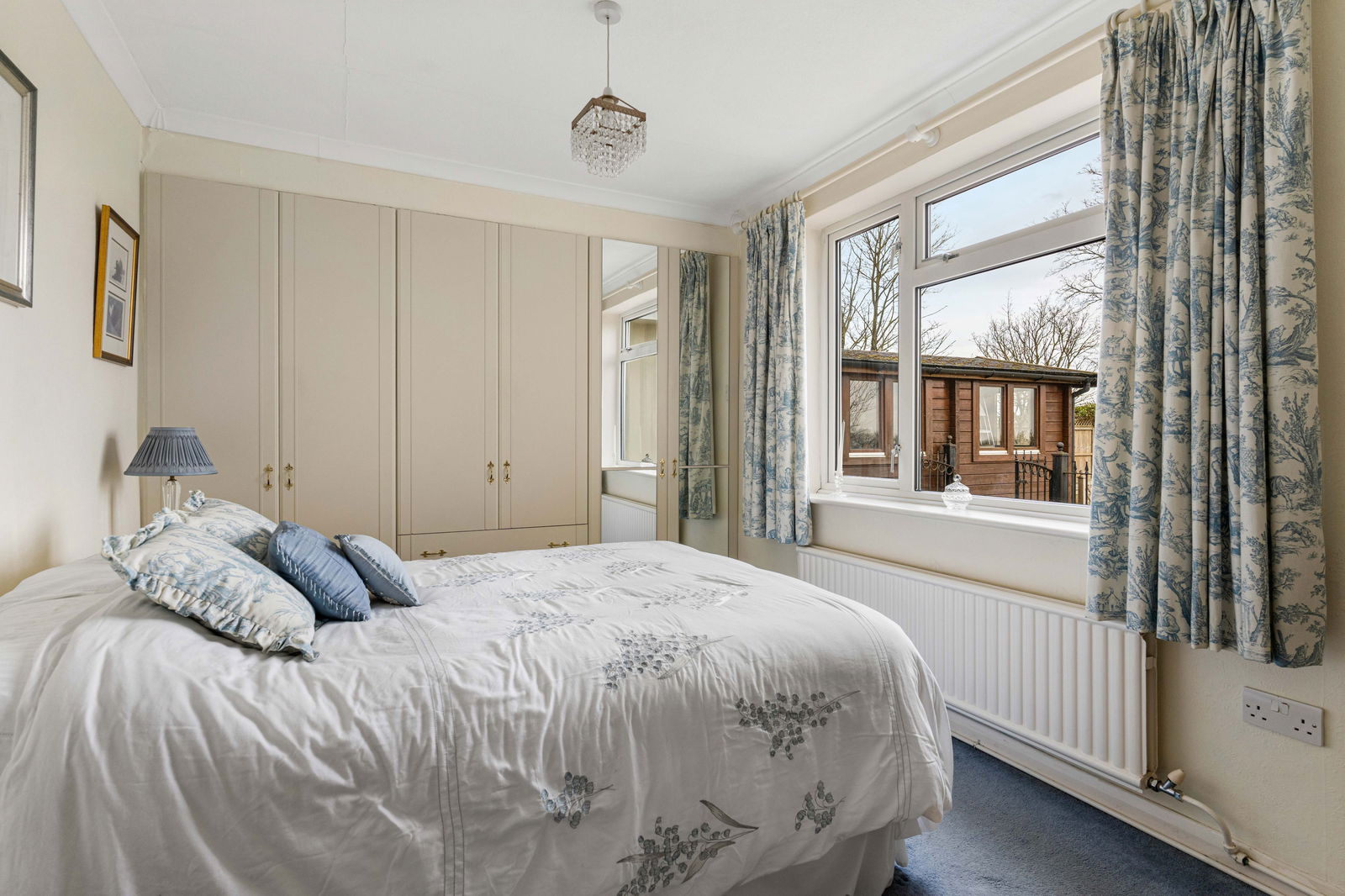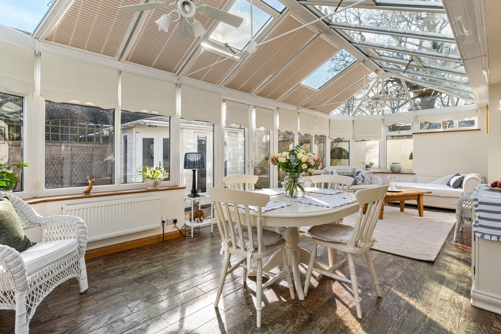Hawthorns welcomes you with an incredibly light and spacious hallway; enough room to store everyone’s coats and shoes, the roof light is a super addition! This area leads off to the lounge, the kitchen and bedrooms. At the front of the house there are 3 rooms; a small study with a floor to ceiling window, a family bathroom with corner bath and the first of four bedrooms which is currently set up as a large study, all over-looking the front lawn and the beautiful trees opposite. The second downstairs double bedroom is at the rear of the house, with fitted wardrobes and views of the back garden, it’s a lovely sunny space. The utility area with sink, washing machine and tumble dryer leads to the back porch which has plenty of room for outdoor coats and boots. The double glazed door opens to the single garage where you find the boiler, lots of shelving for storage and space for a car. Back into the centre of the house to the the hub of the home; the kitchen. It has plenty of wall and under counter units, a built in double oven with hob and offers many possibilities to reconfigure. It has been enhanced by opening up the window to the large conservatory which is used as a dining area with comfortable seating. This conservatory is heated and very much feels part of the house, offering a fantastically versatile space to use throughout the year. It has double doors and a single door leading out to the patio and garden. Moving back into the main house, there is a formal dining area, making the most of the open plan layout, and 3 steps down takes you into the generous lounge. This large, light filled room is a natural entertaining space, with a fantastic set of patio doors overlooking the garden and views of the fields beyond. From the dining area, the open staircase leads you up onto a small landing. Overlooking the front garden, there is a double bedroom with built in wardrobes. The large family bathroom offers more views over the open fields towards Royston, and has a separate shower and bath. The largest bedroom is at the back of the house, with large windows offering views of the garden and farmland beyond.