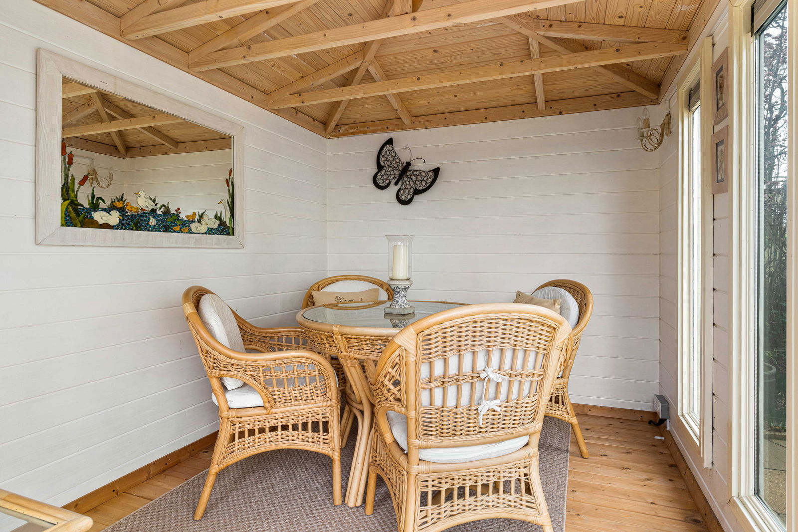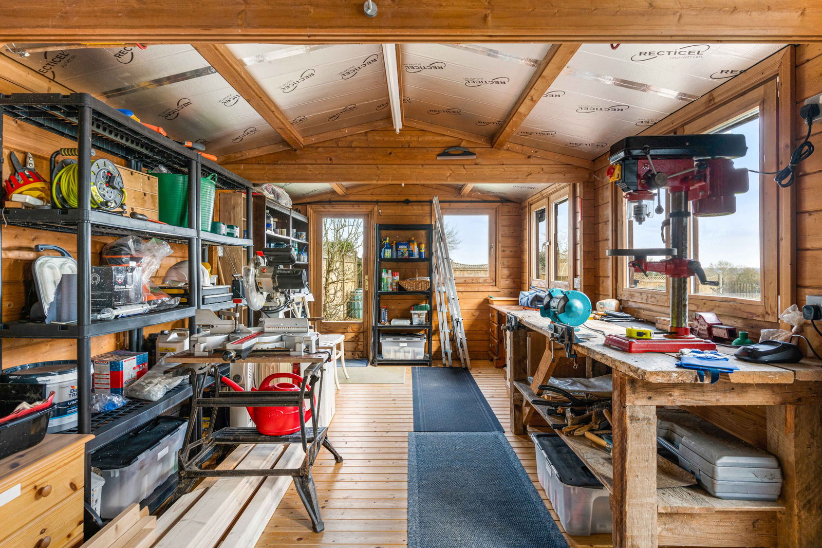 The front of the Hawthorns has a section of lawn, parking on a gravel drive for up to 3 cars and a side gate which gives access for the oil tank and through to the rear garden. Using that side entrance, the back door porch is on your right and a well-built outbuilding in front of you. With triple doors that open fully at the end for easy access, and double doors at the side, insulation, electricity and double glazing, this room could be a home office, a gym, hobby room, music room; the possibilities are endless! There is a small patio area just outside to catch the morning sun, some raised beds and a small shed in the corner. The lawn is well kept, and includes a paved area for parking a large vehicle in front of the rear garden gates. On the other side of the house there is a raised patio area and a small summerhouse. This garden has many useful spaces, is not overlooked and makes the most of the fantastic landscape to the rear with its unobstructed skyline.