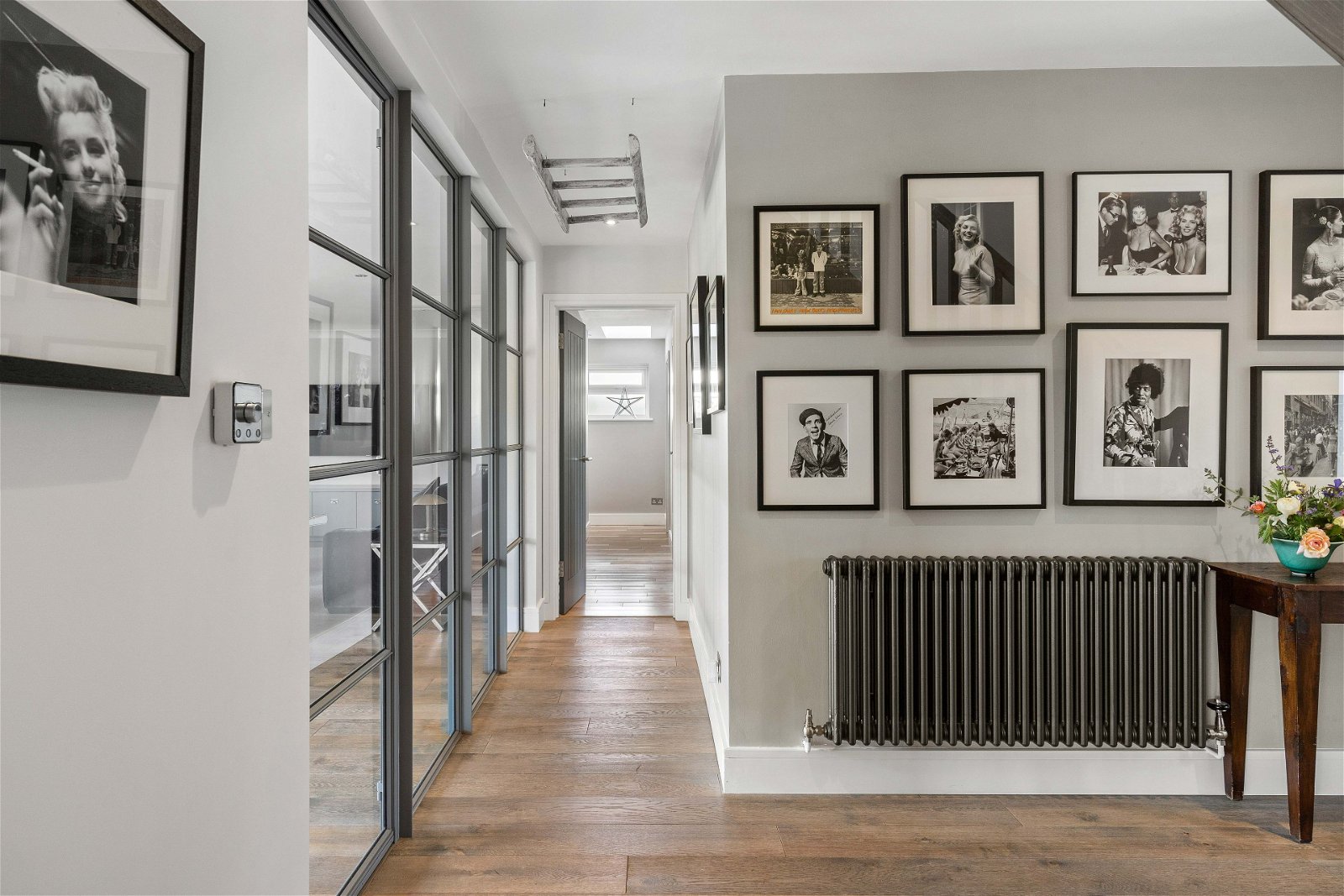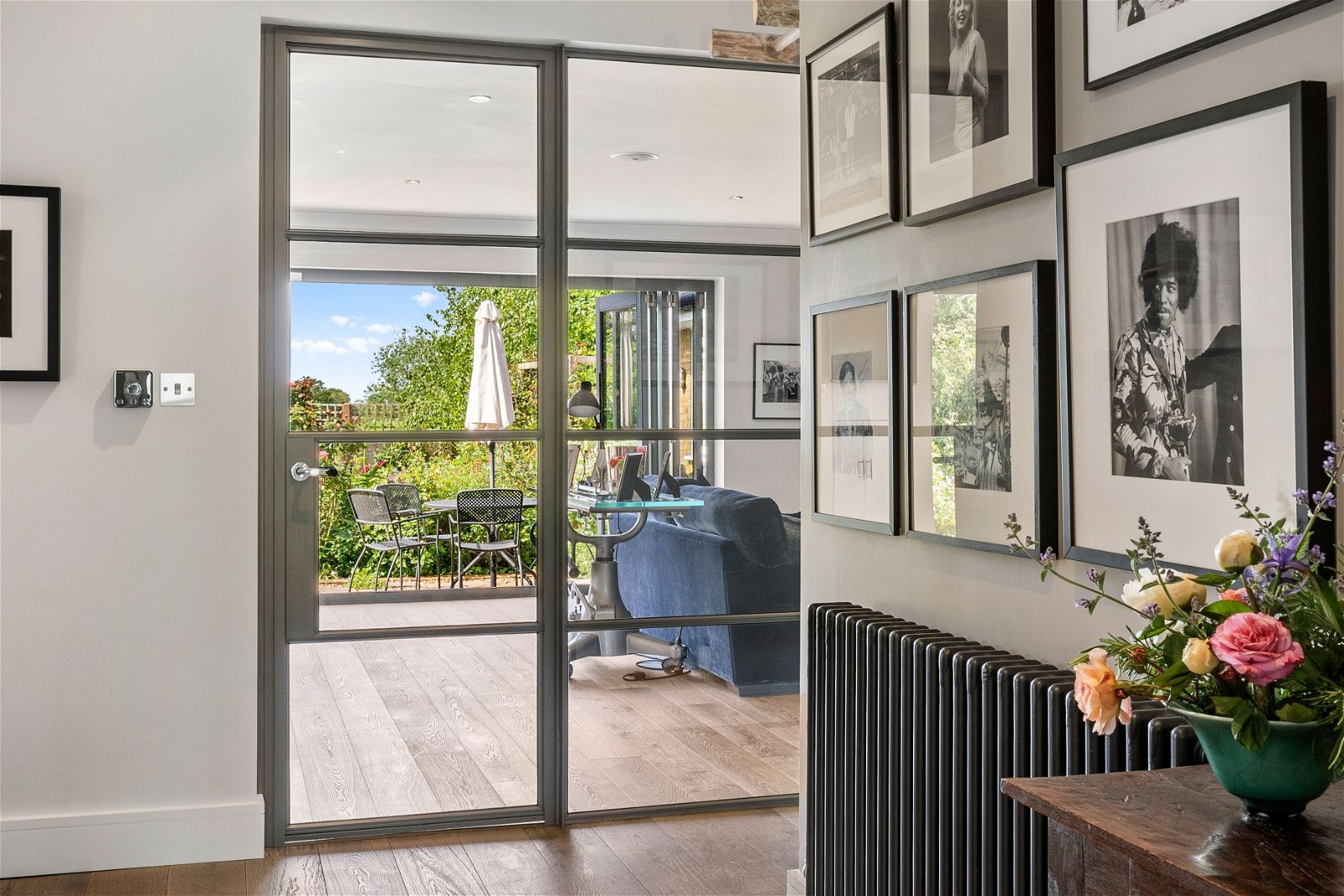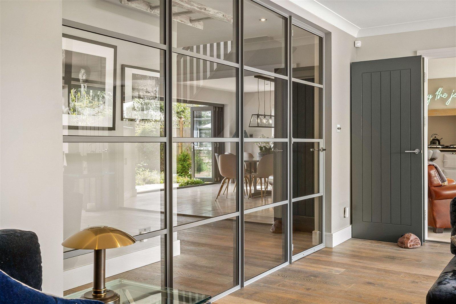 Into a light and airy hallway, with wooden limed grey oak flooring continuing up the staircase and into the living and sitting room. A modern, feature glass wall with doorway leading into the living room, with stunning views to the garden, feature fireplace with bi folding doors throughout the rear of this home, leading out to the garden. This is a great entertaining space, connecting all the family and making it the