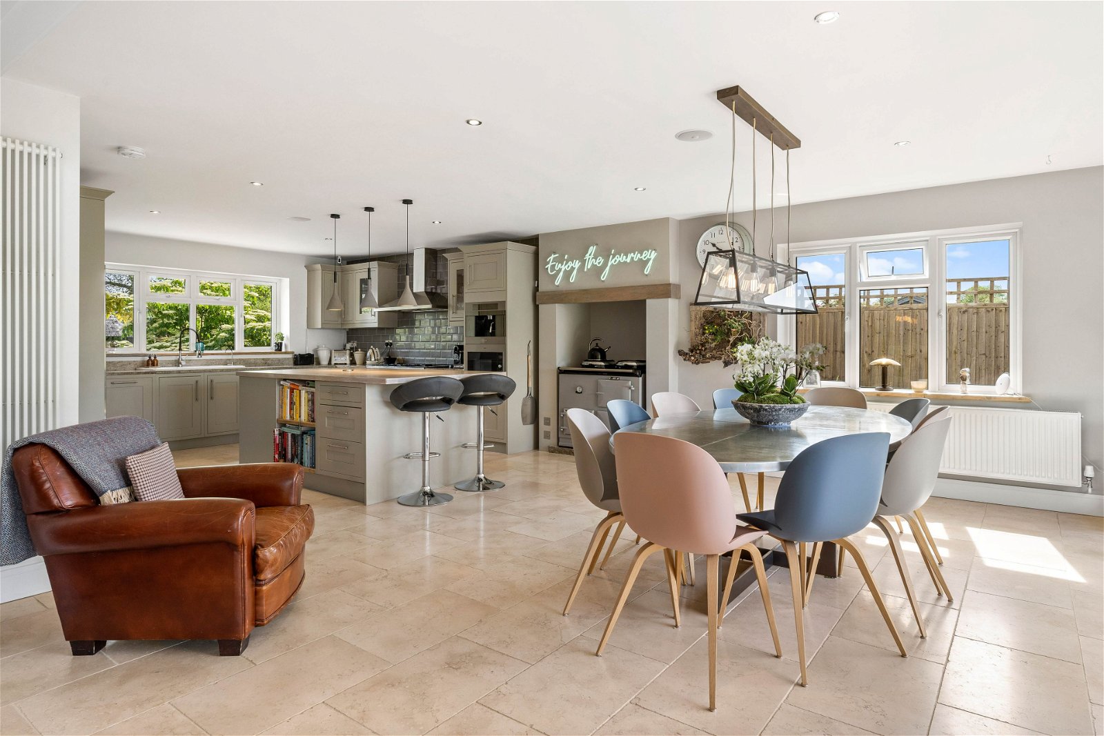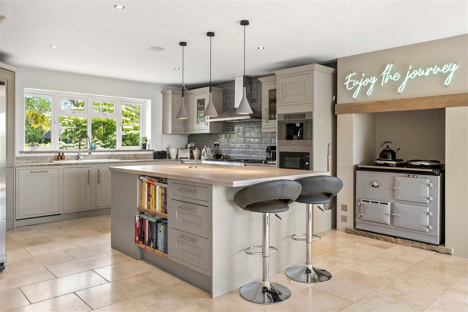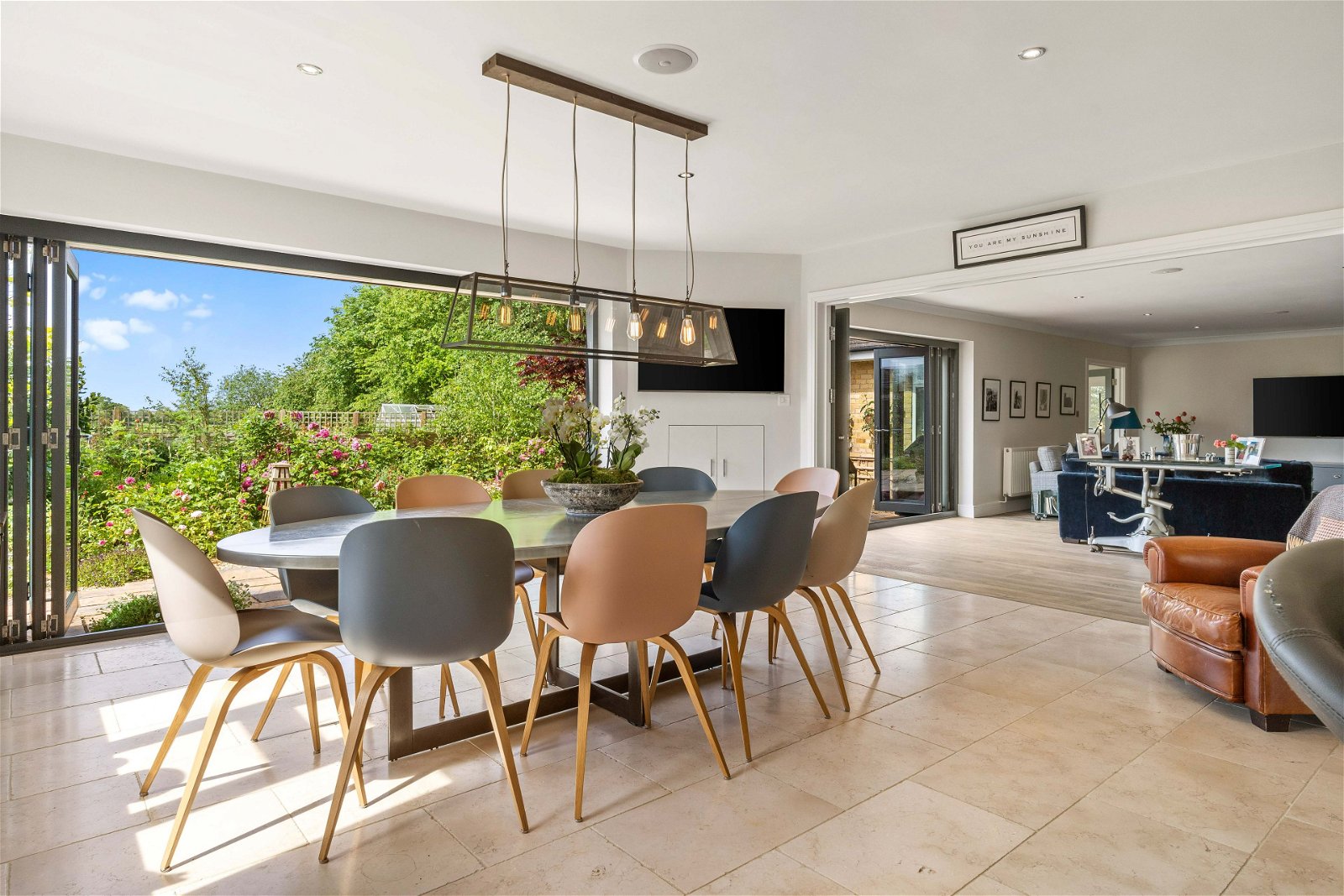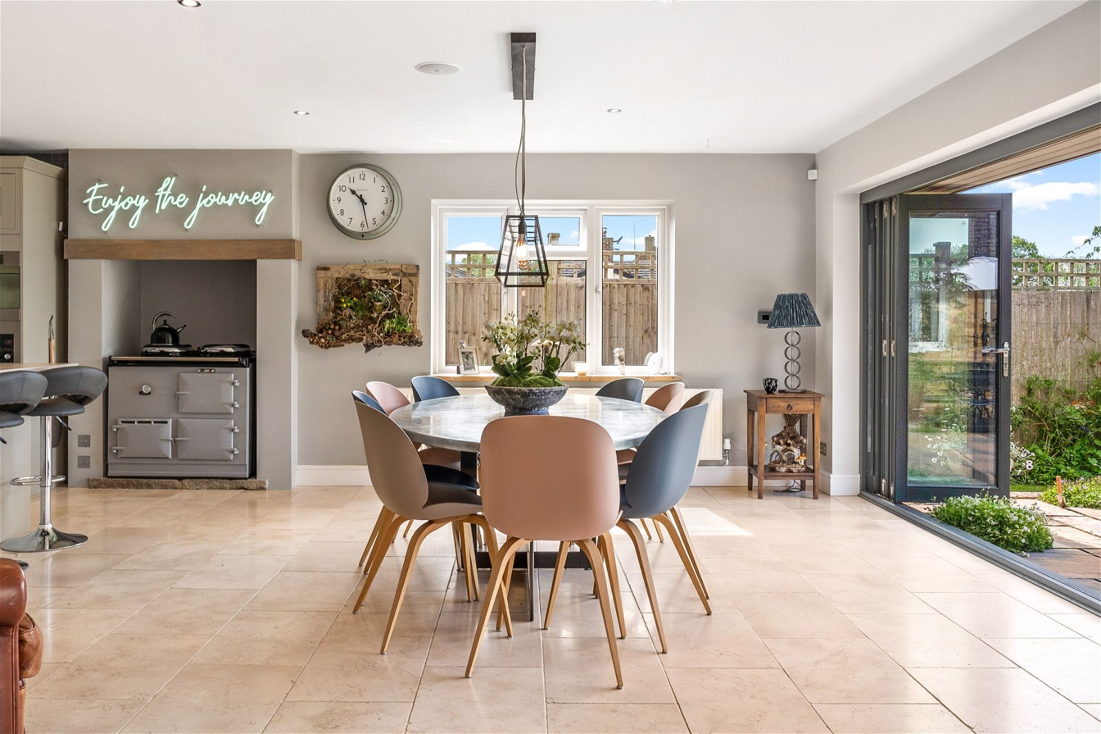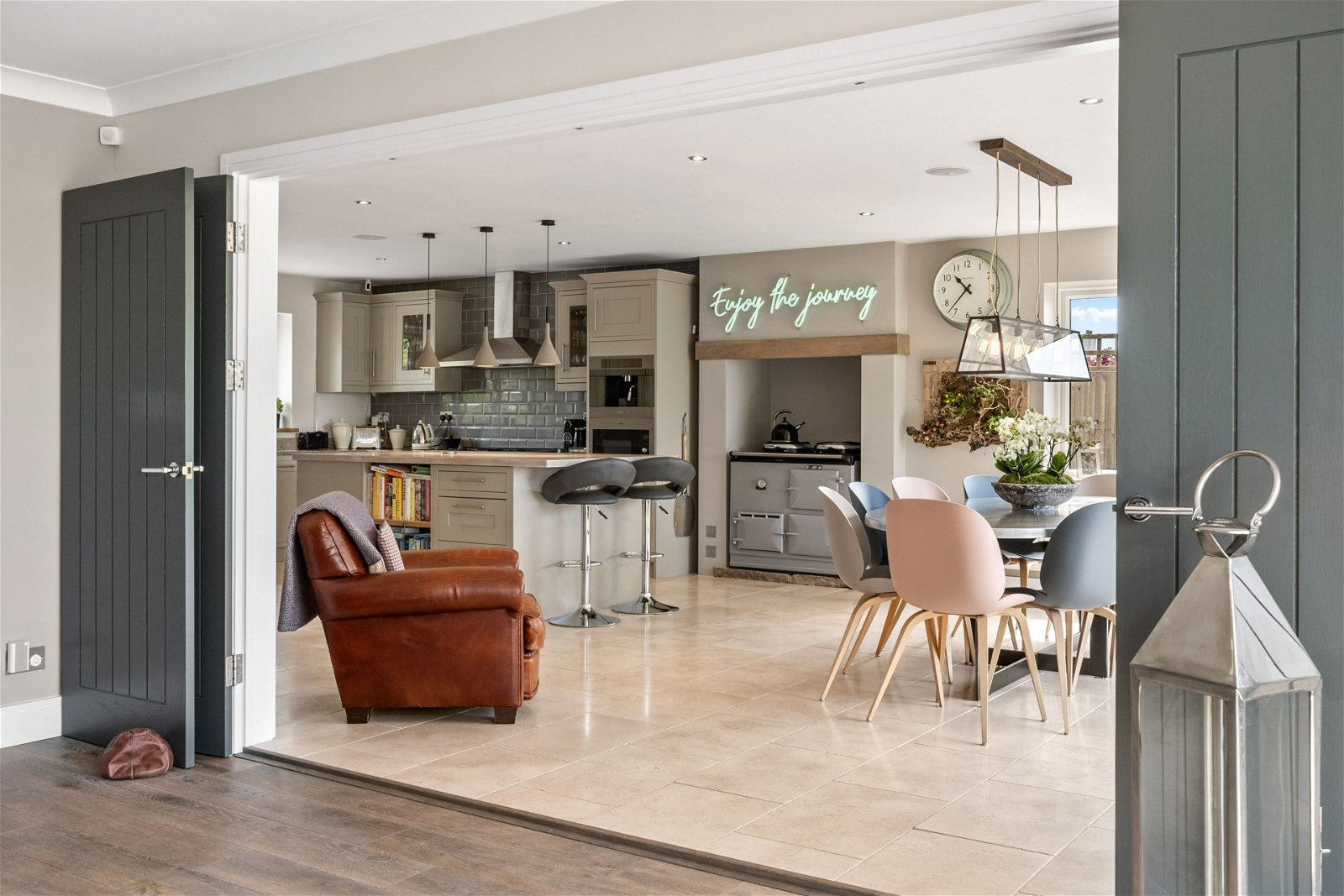 heart of the home. The bespoke kitchen is beautifully fitted with range master and Aga, and various built-in appliances. Under floor heating beneath the Limestone tiled floor, various modern radiators and surround sound fitted within the kitchen and living area. There are bi folding doors separating the kitchen diner to the living room a French door into the sitting area. The sitting room is a relaxing place to take in the wonderful garden or read a book with French doors straight out to the garden. This home accommodates for multi-generational living and offers a bedroom with ensuite on the ground floor, separate utility room and cloakroom.