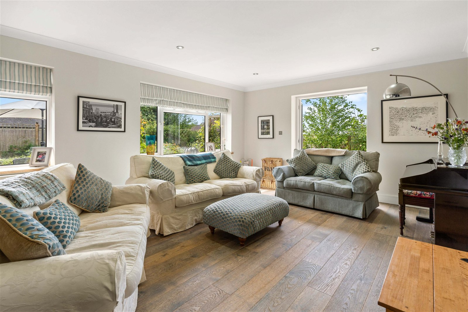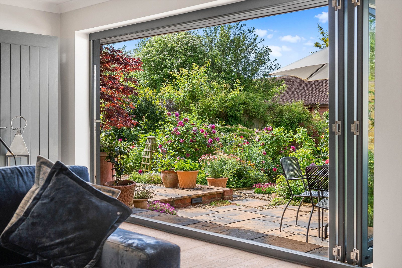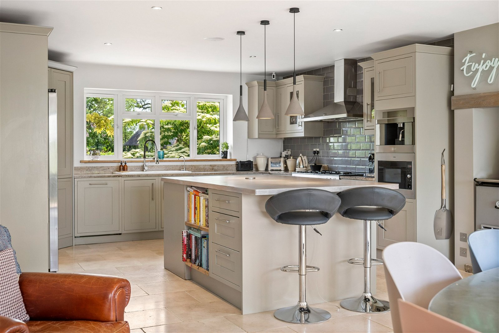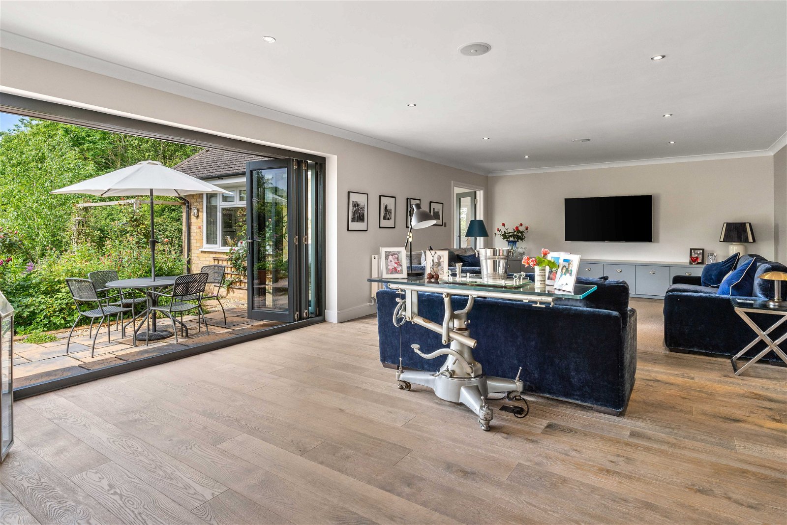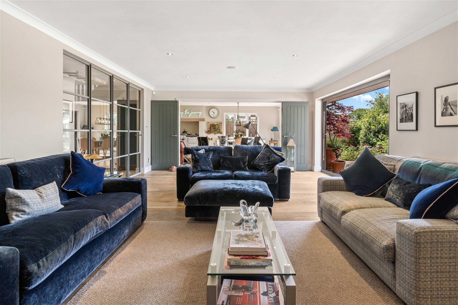 heart of the home. The bespoke kitchen is beautifully fitted with range master and Aga, and various built-in appliances. Under floor heating beneath the Limestone tiled floor, various modern radiators and surround sound fitted within the kitchen and living area. There are bi folding doors separating the kitchen diner to the living room a French door into the sitting area. The sitting room is a relaxing place to take in the wonderful garden or read a book with French doors straight out to the garden. This home accommodates for multi-generational living and offers a bedroom with ensuite on the ground floor, separate utility room and cloakroom.