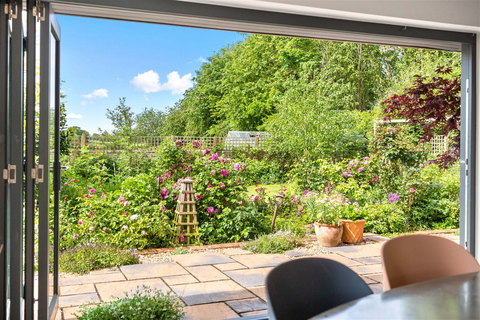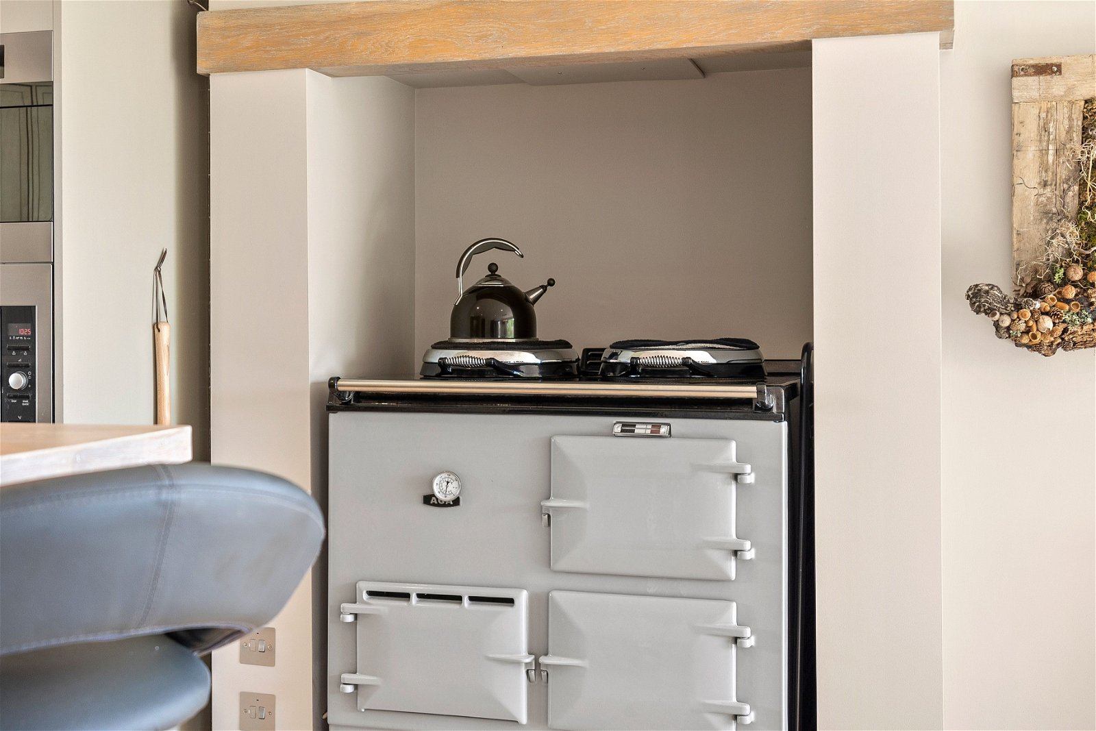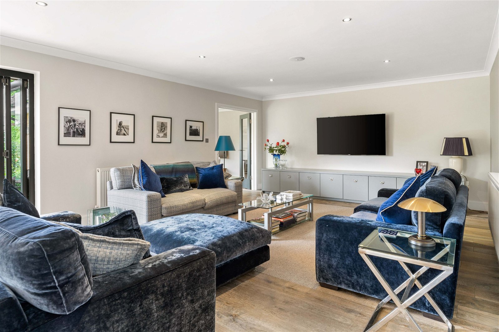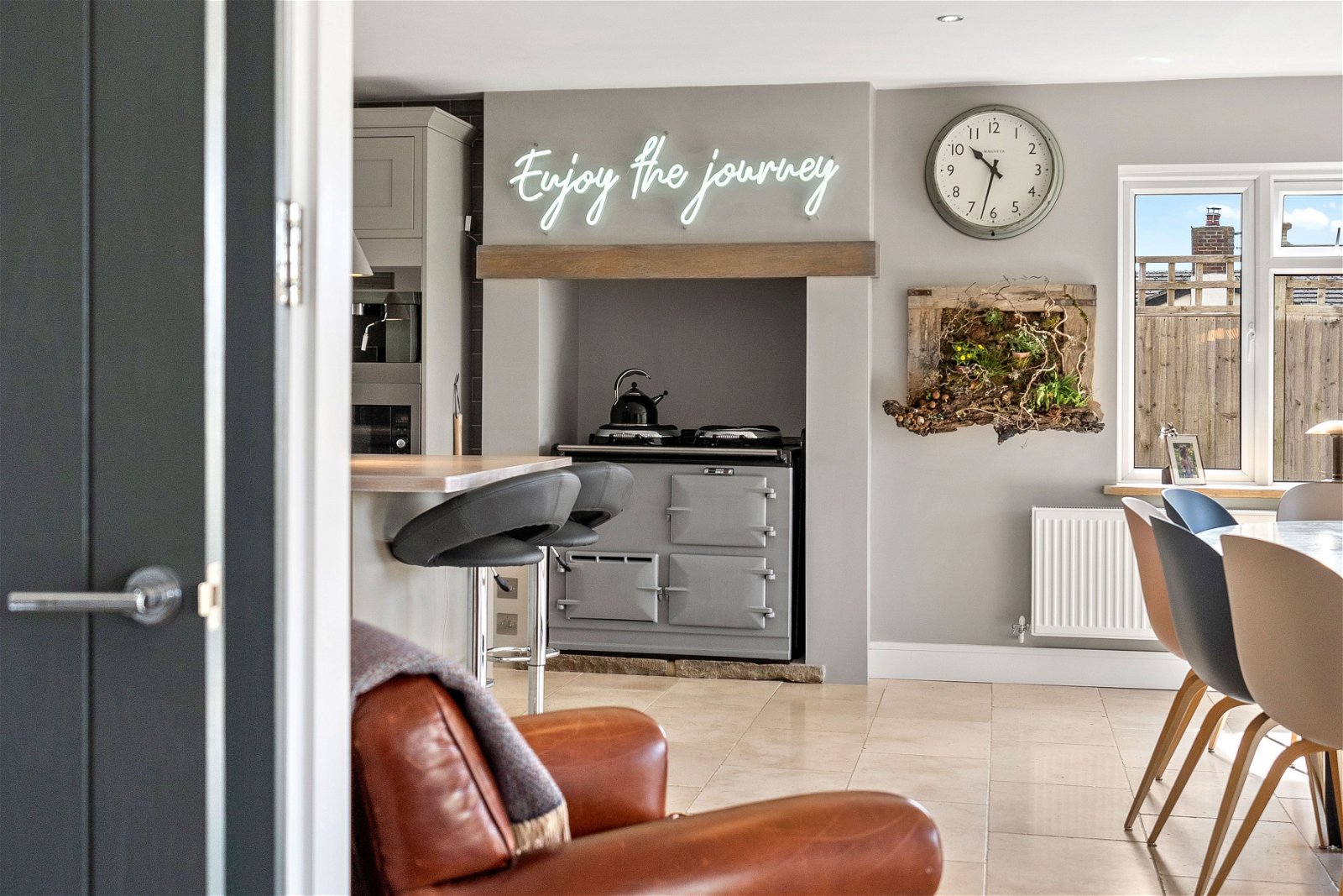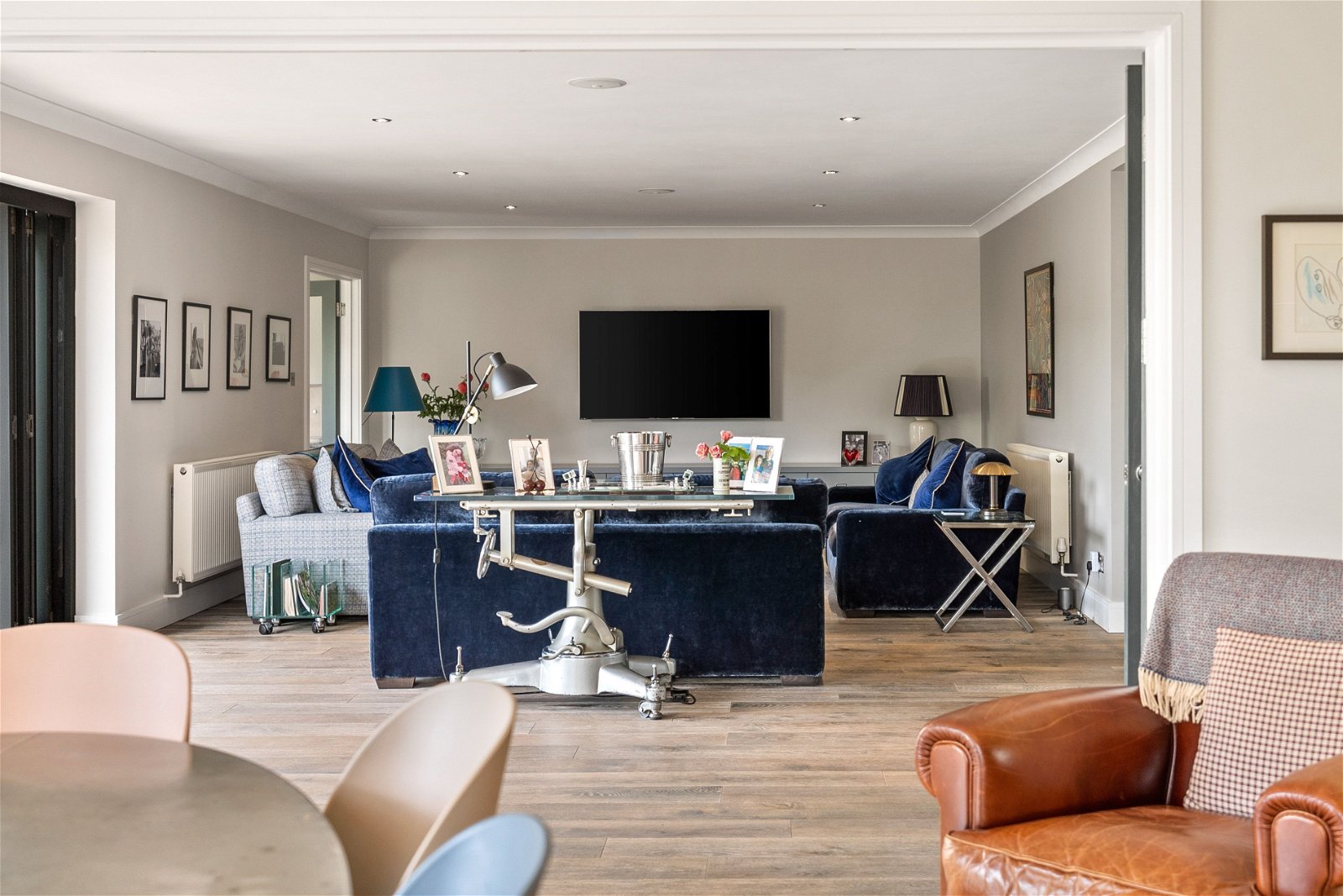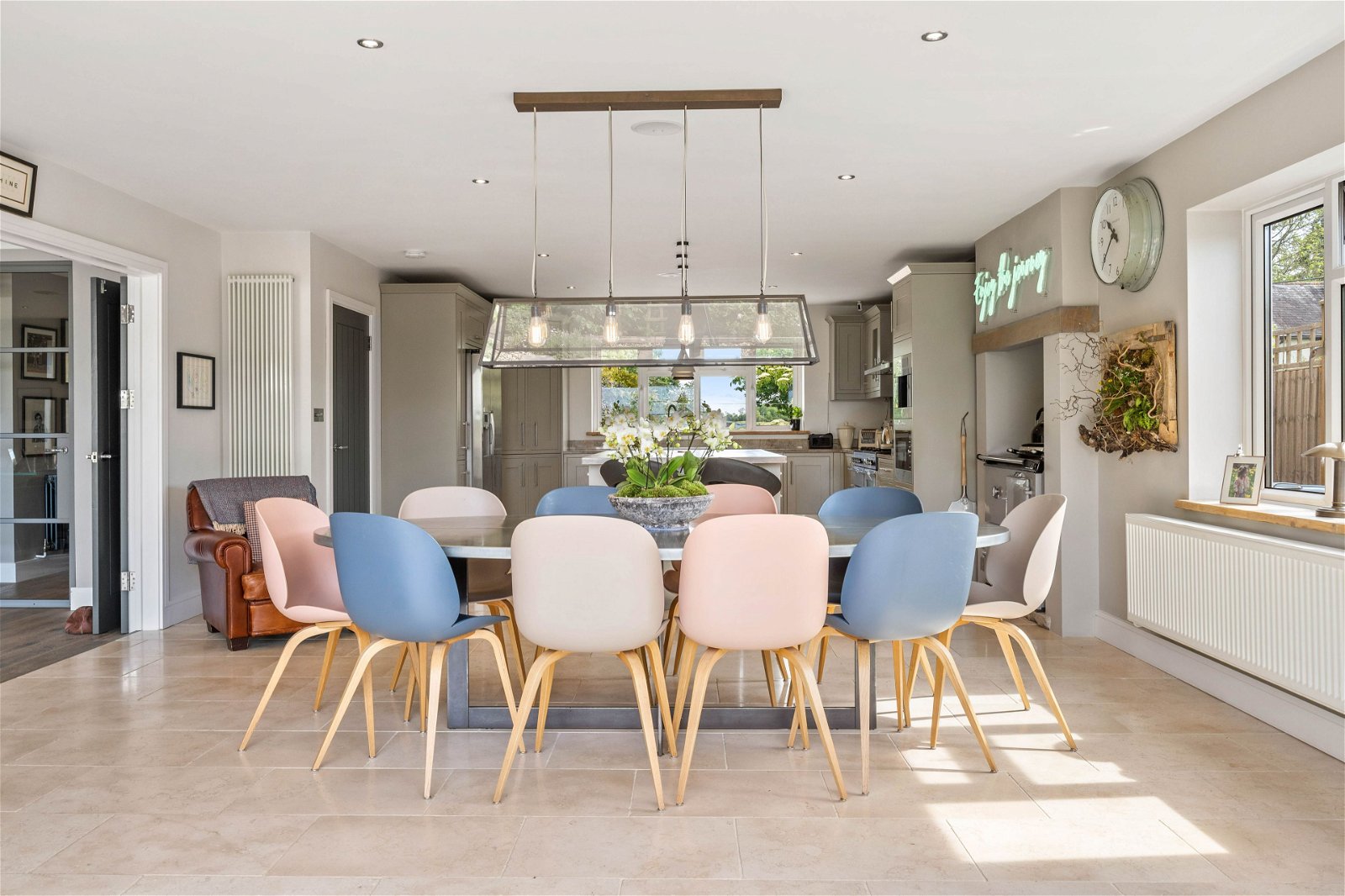 heart of the home. The bespoke kitchen is beautifully fitted with range master and Aga, and various built-in appliances. Under floor heating beneath the Limestone tiled floor, various modern radiators and surround sound fitted within the kitchen and living area. There are bi folding doors separating the kitchen diner to the living room a French door into the sitting area. The sitting room is a relaxing place to take in the wonderful garden or read a book with French doors straight out to the garden. This home accommodates for multi-generational living and offers a bedroom with ensuite on the ground floor, separate utility room and cloakroom.