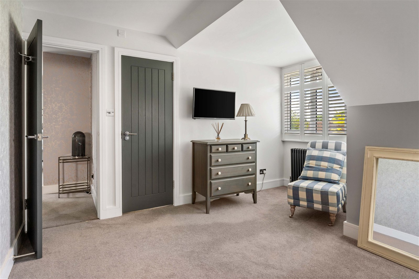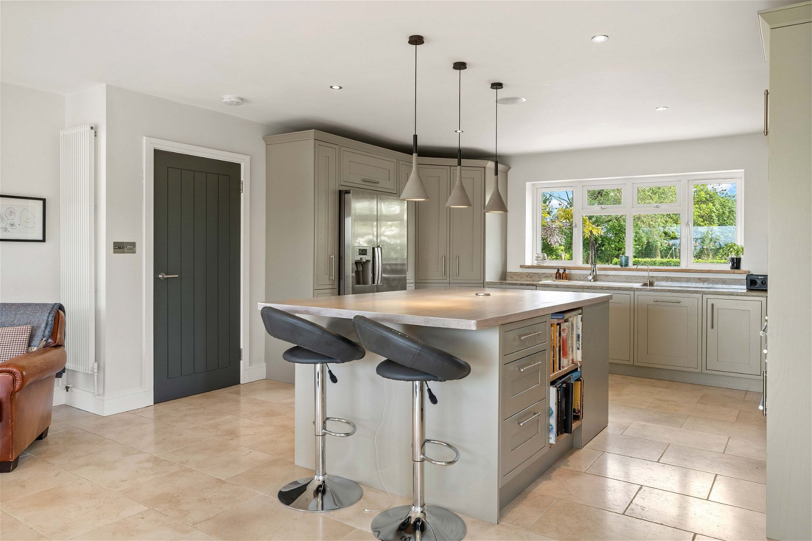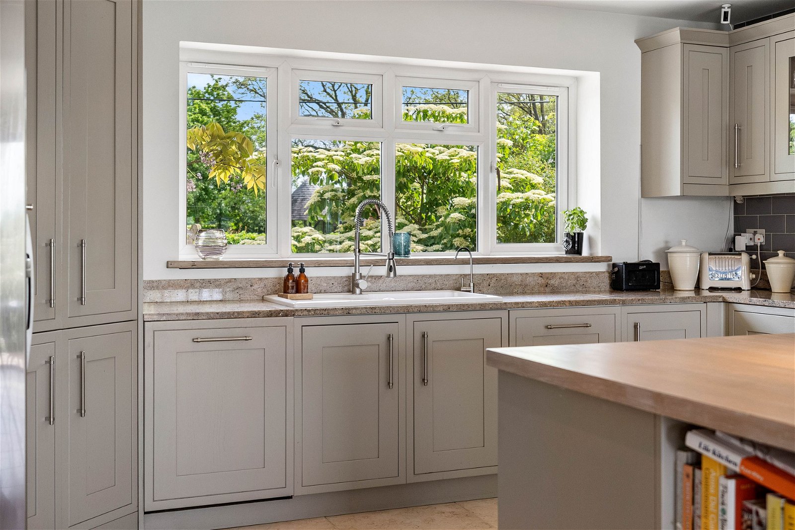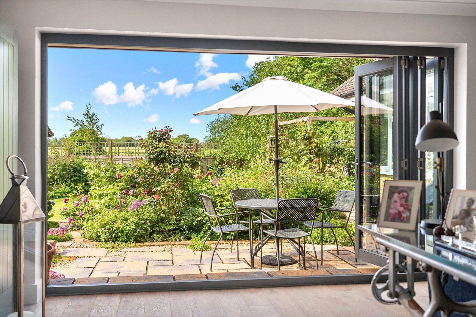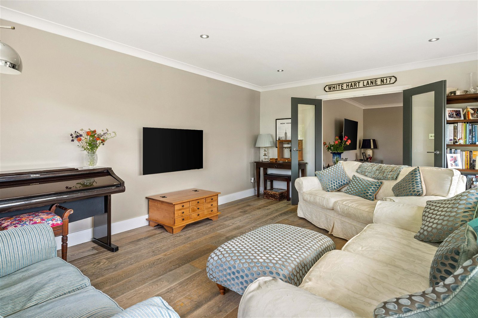heart of the home. The bespoke kitchen is beautifully fitted with range master and Aga, and various built-in appliances. Under floor heating beneath the Limestone tiled floor, various modern radiators and surround sound fitted within the kitchen and living area. There are bi folding doors separating the kitchen diner to the living room a French door into the sitting area. The sitting room is a relaxing place to take in the wonderful garden or read a book with French doors straight out to the garden. This home accommodates for multi-generational living and offers a bedroom with ensuite on the ground floor, separate utility room and cloakroom.