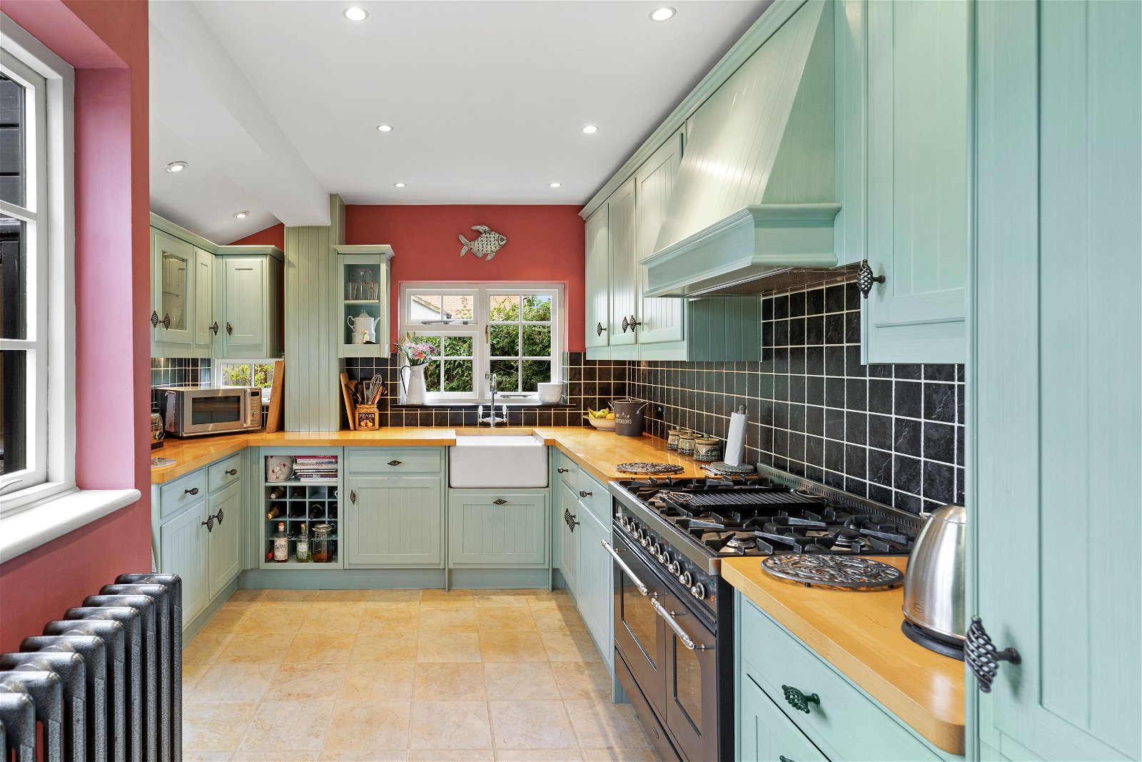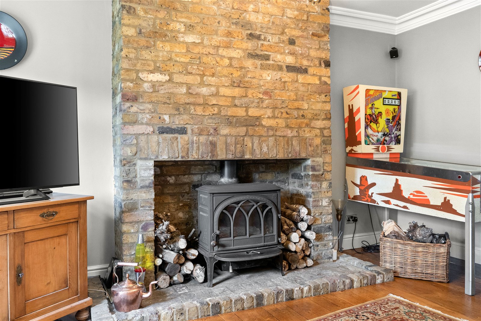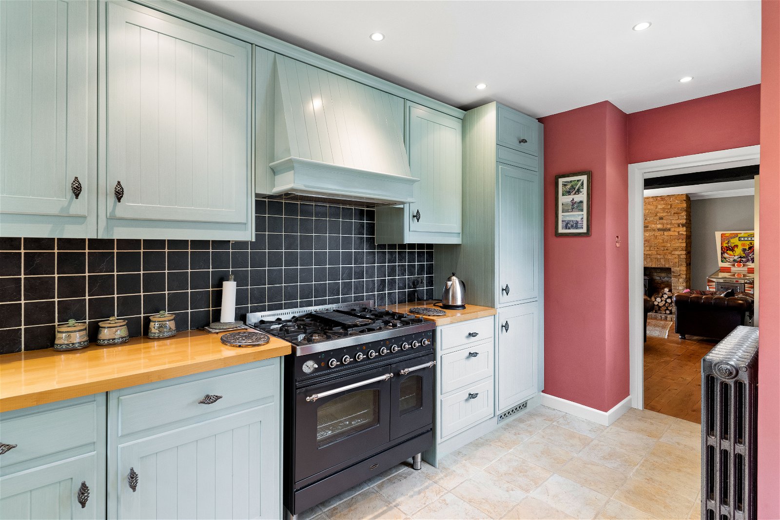 The porch this gives access to the front of the house where you walk through into the sitting room. The floors are French Oak, taken from a barn in France, there is a beautiful and original open fireplace, stairs rise to the first floor with a useful under stairs storage cupboard and front aspect facing window allowing plenty of light into the room. Passing the stairs one moves into the main lounge, a fabulous room with a large brick fireplace housing a log burning stove, two front aspect windows with cast iron reclaimed radiators below, French Oak flooring and access to the dining room and Kitchen. The Dining room is a really bright and welcoming room with French doors to the rear garden and windows to side filling the room with natural light, this really is a great room for entertaining. The kitchen hosts a good range of base and wall storage units with wood worktop surfaces, tiled splash backs, space for a large range cooker gas oven with cooker hood above, integrated fridge freezer. There is a window to side with butler sink below, a further two more windows to the rear - one with cast iron reclaimed radiator below and glass panel door to rear giving access to the garden and what would've been the original outside wc.