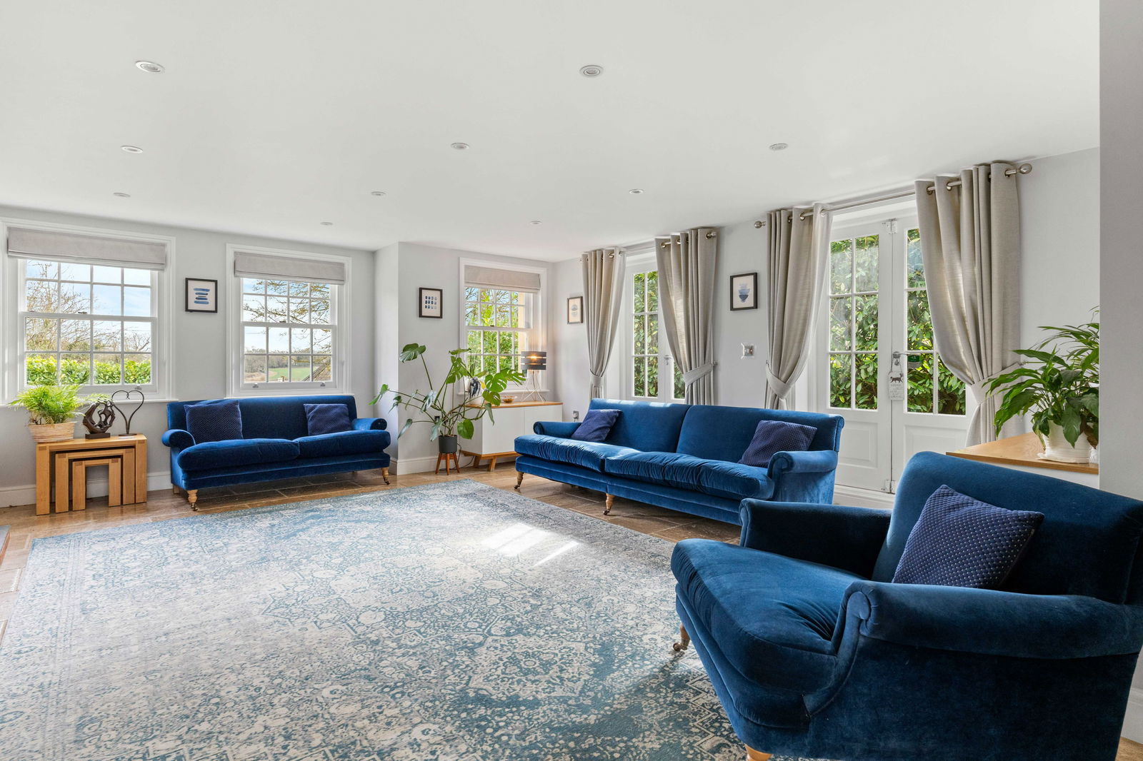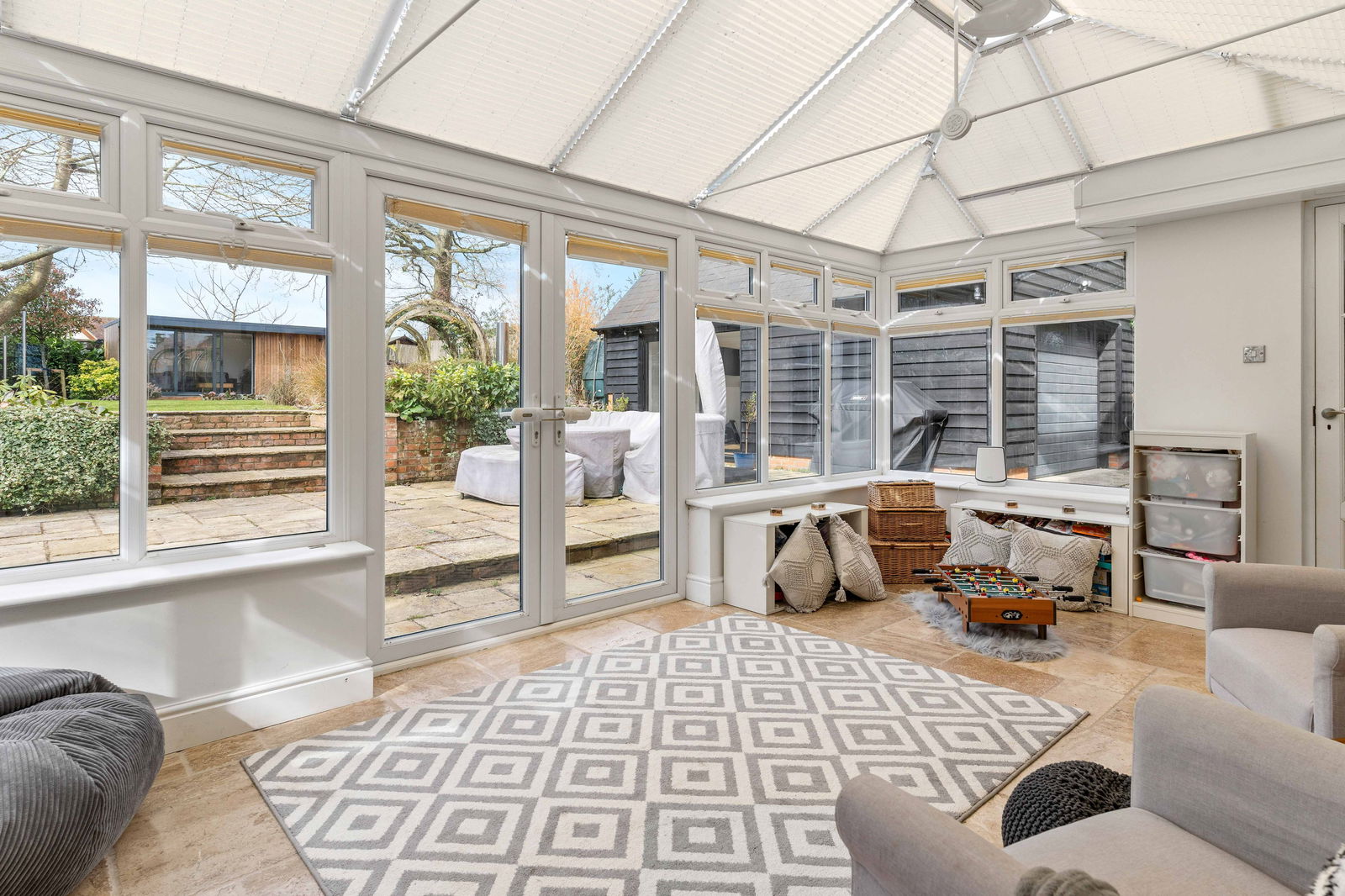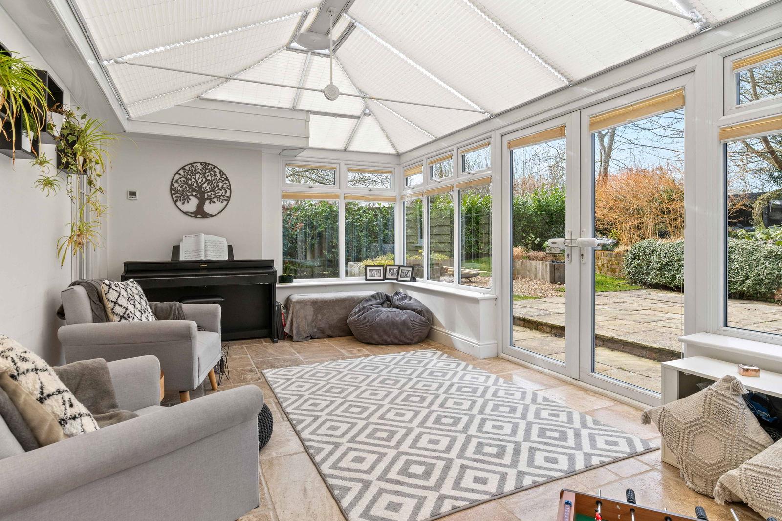 The sitting room is a lovely, spacious entertaining space with lots of natural light, three double glazed sash windows to the front, two sets of French doors to the side. There are a further set to the conservatory