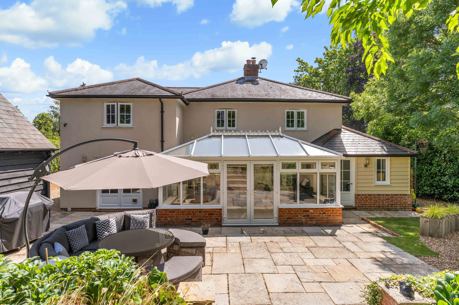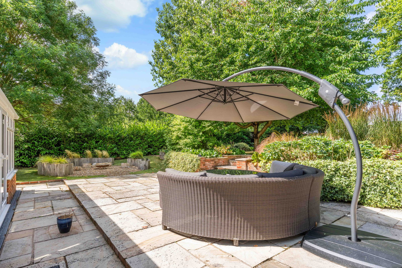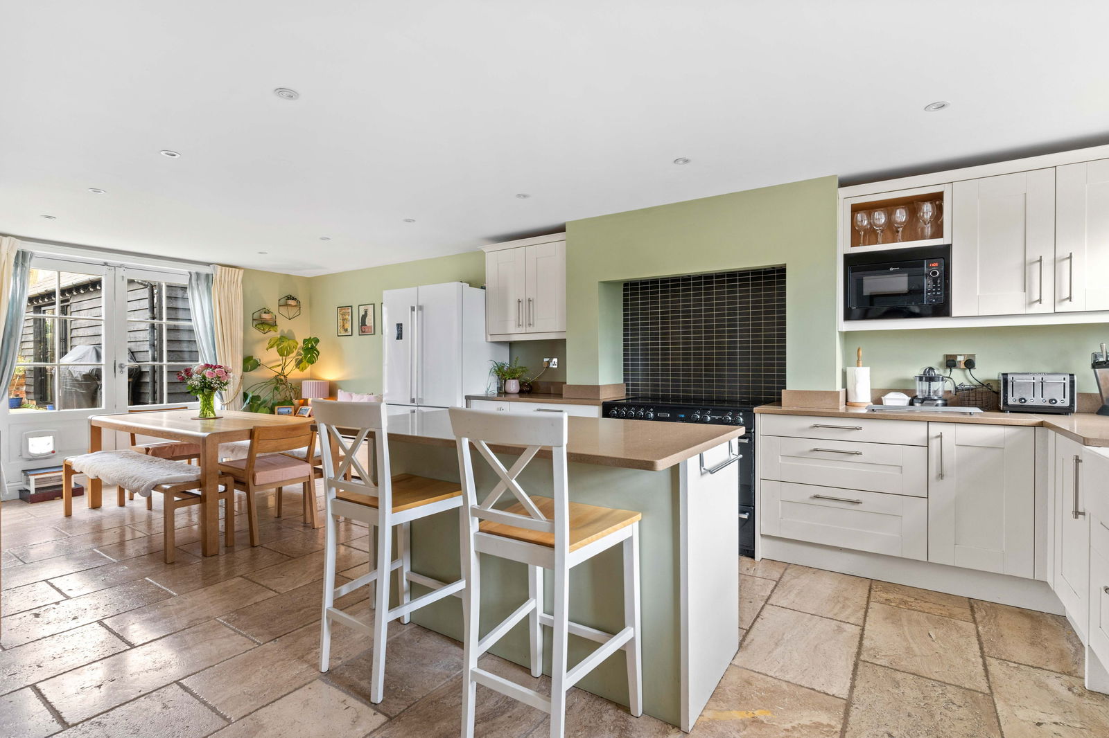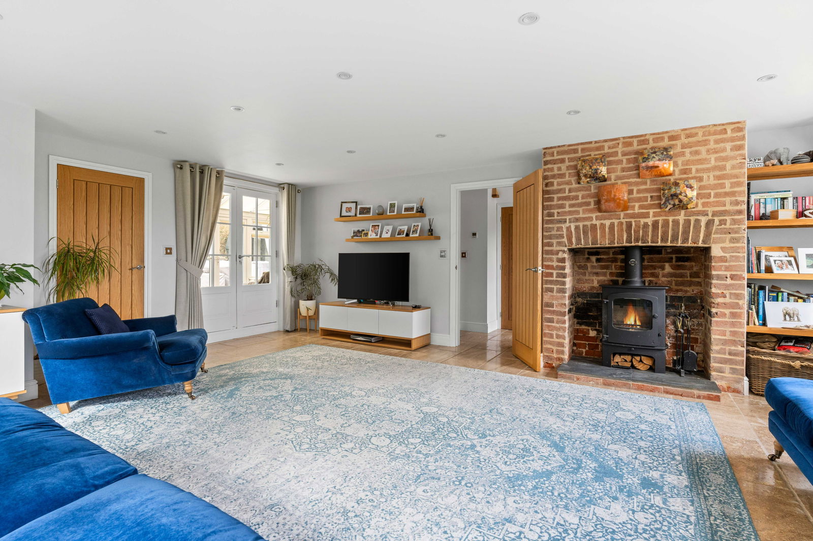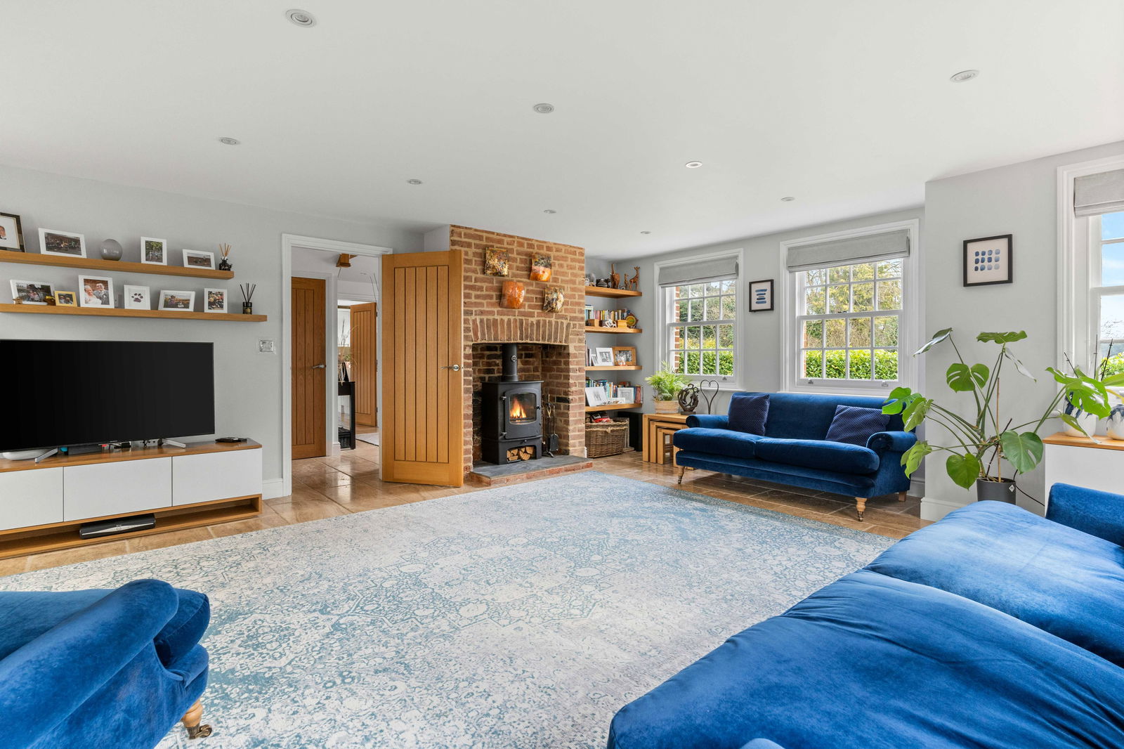A warm and inviting welcome into the spacious hallway with feature fireplace with oak bressummer beam, underfloor heating throughout the ground floor and Travertine flooring continuing to the kitchen diner, sitting room, conservatory and boot room. There is a modern cloakroom and storage area for coats and shoes. A beautiful oak staircase leads you to the first floor. To the right the kitchen diner, a stylish solid oak Schreiber kitchen with a painted shaker style finish and complementary caramel quartz worksurfaces. A central island with storage and breakfast area completes the kitchen. The kitchen is light and airy with beautiful French doors to the rear, leading out to the garden and two double glazed sash windows to the front to allow the light to flood through. The utility room is well positioned just off the kitchen and offers space for stacked washing machine and tumble dryer, water softener and hot water tank. There is a door from the dining area leading into the conservatory.