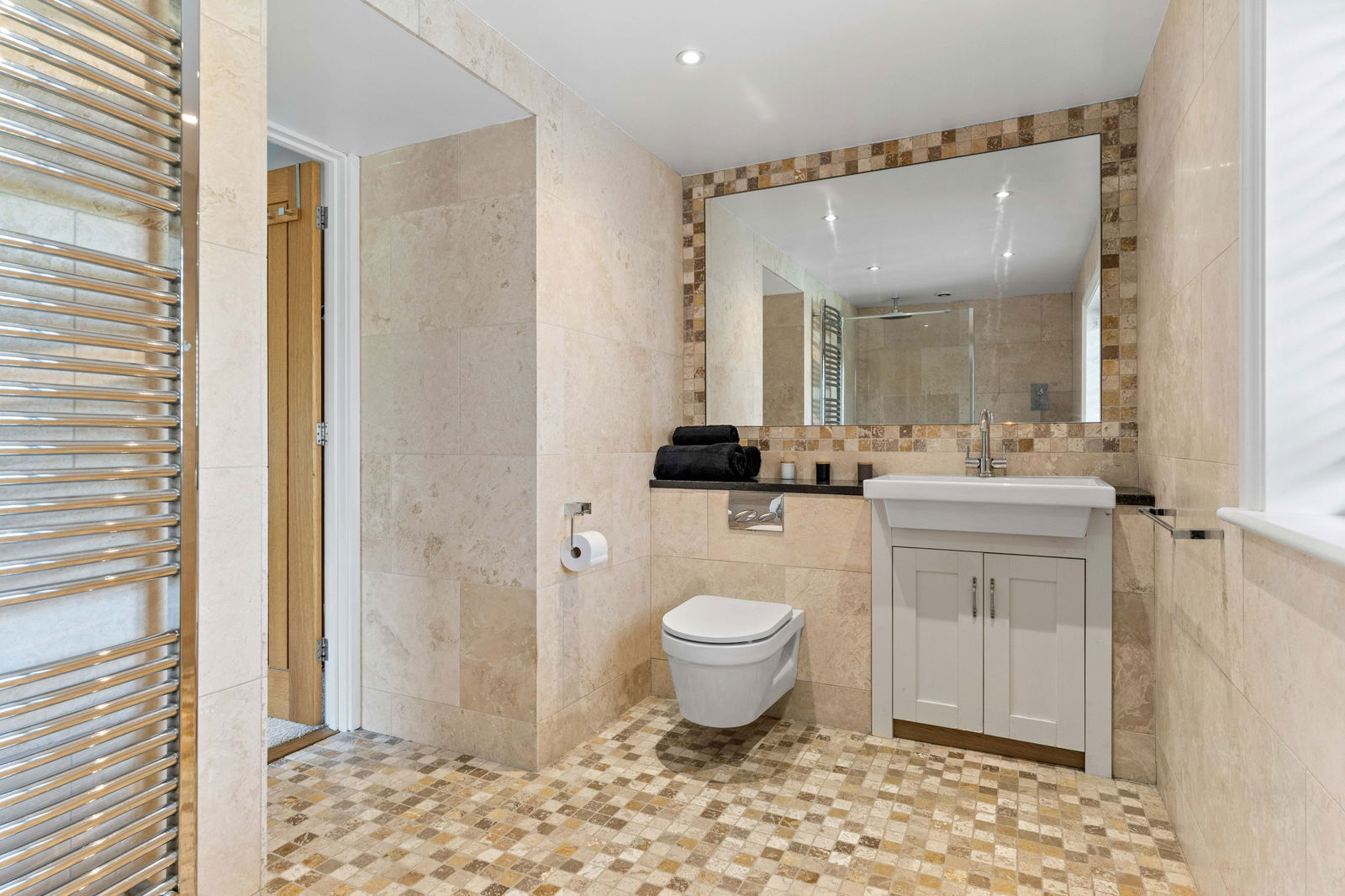 The West facing garden was professionally designed by a local garden designer and offers an array of captivating areas to sit and enjoy the peace and tranquillity. There is a large patio area with firepit and log seating, a selection of ornaments and water features with central manicured lawn, nestled within the mature flower and shrub borders. A feature walk through circular archway frames the house and garden, also offering power, light with water tap. There is lovely patio area and pergola with a discreetly, well position shed to the side of the summer house. The summer house is located at the rear of the garden, a contemporary design with red cedarwood cladding, underfloor heating, power with individual fuse box and internet access, this is a great place to work from home.