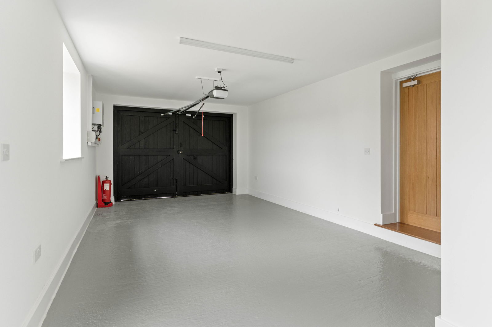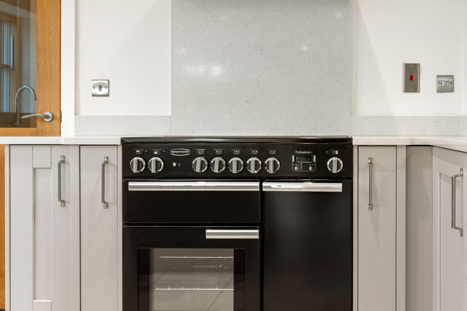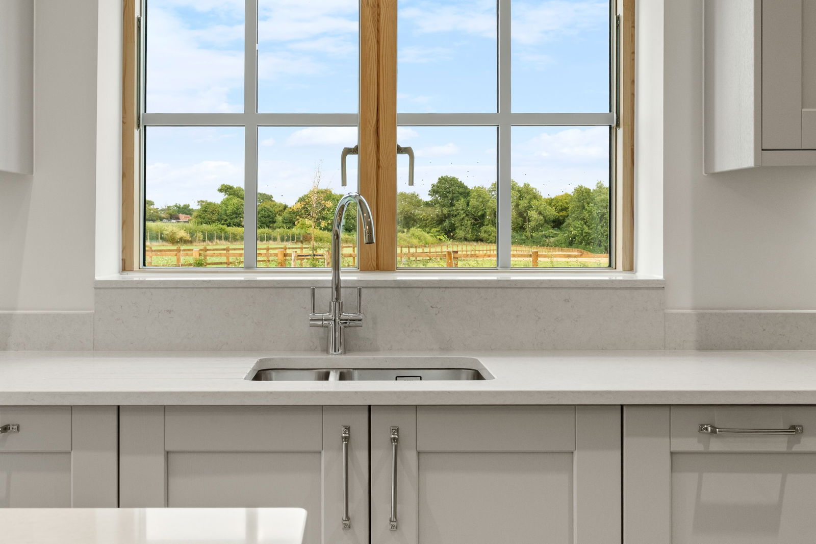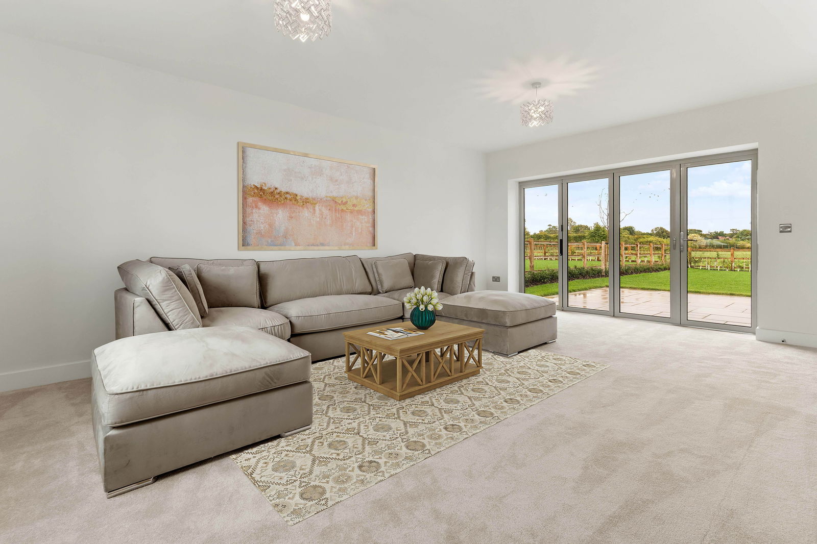 Brougham is one of just three stunning homes set on this rural development. The spacious courtyard is entered through double wooden gates, accessed via an entry phone system for added privacy and security. There’s plenty of room for parking with three allocated spaces, along with a single garage. The garage has large cupboard storing the solar panel battery, and there are hot and cold taps here, ideal for garden hoses and washing down animals just outside the external door. To the right of the house is the haul road that gives you a clear route to the 4.52 acre paddock. This large field has been secured with wooden post and rail fencing and stretches down to the boundary hedge line. With your neighbours’ paddocks on either side, this space feels open and versatile. It could be used for grazing livestock, growing your own fruit and vegetables or just exercising the dog. The manageable size lawn enjoys traditional wooden fencing on all sides and young hedging has been planted to give more privacy as they grow on the side and rear fence lines. There are double gates to the haul road and a pedestrian gate for quick access. On the far side of the house, in the small, linked section of the property, is a cycle store which can be entered from the front and the rear of the house. This well thought out design means you can come home from a family bike ride and enter the house through the back door. Wrapping around the rear of the house is a beautifully laid patio which overlooks the good-sized lawn. Accessible from the back door, the dining area and the lounge, this patio is great for al fresco dining and entertaining.