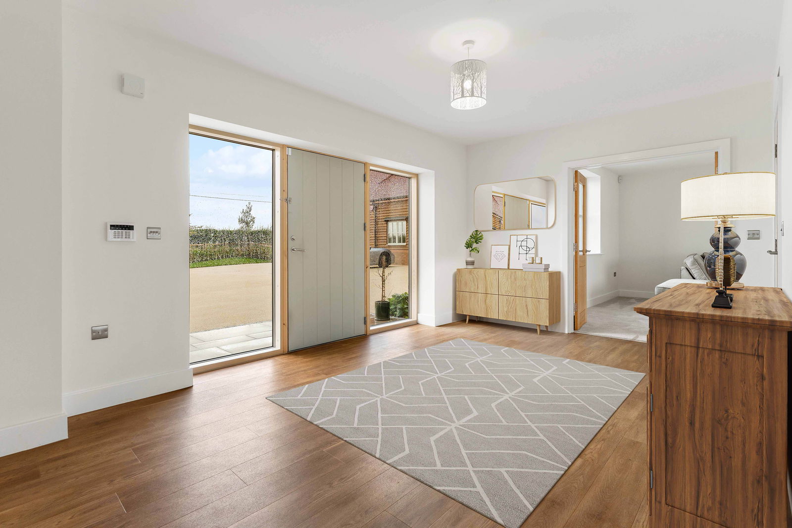 With its classic barn-style frontage, this home instantly catches the eye. The large statement entrance with its stylish front door framed by glazed panels create a bright and welcoming first impression. Stepping inside to the spacious, light-filled hallway, you find a built-in coat cupboard and additional storage tucked under the stairs. The engineered wood flooring makes it a practical space as well as adding character and style, and a well-placed guest cloakroom adds convenience without interrupting the flow.